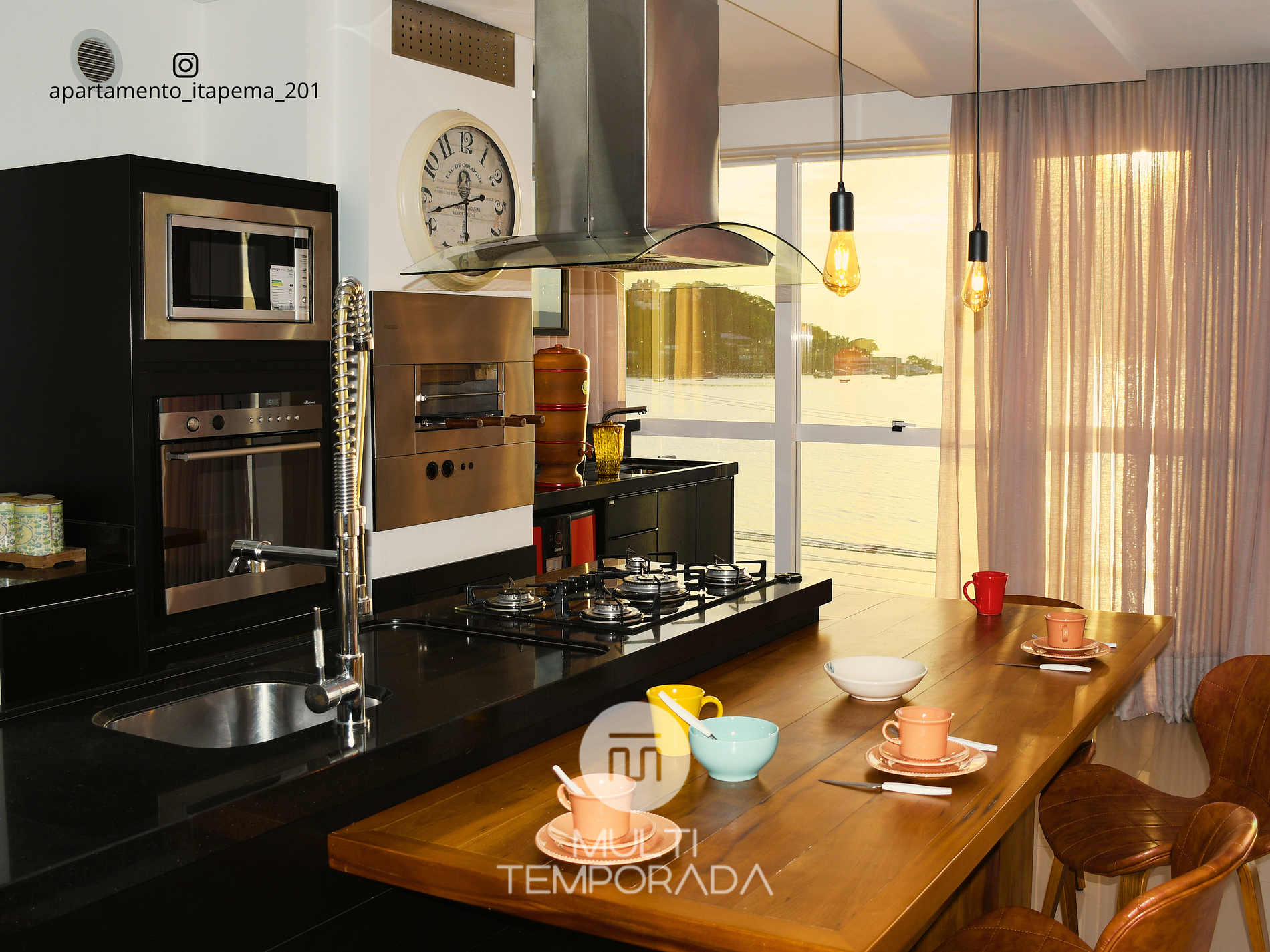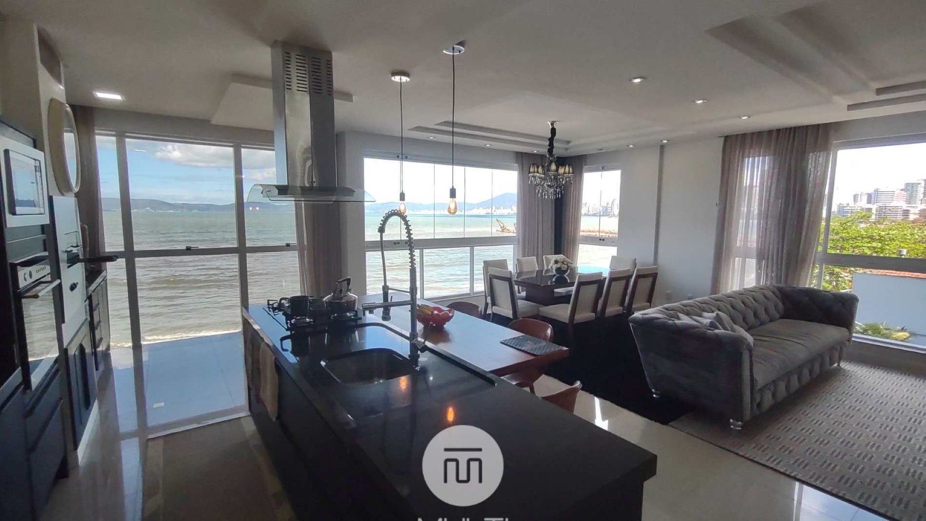The living room, dining room, pantry, kitchen, and powder room are combined into a welcoming space for socializing and enjoying delicious meals while admiring the crystal-clear sea and the nighttime lights of the Itapema, Meia-Praia, and Porto Belo waterfront.