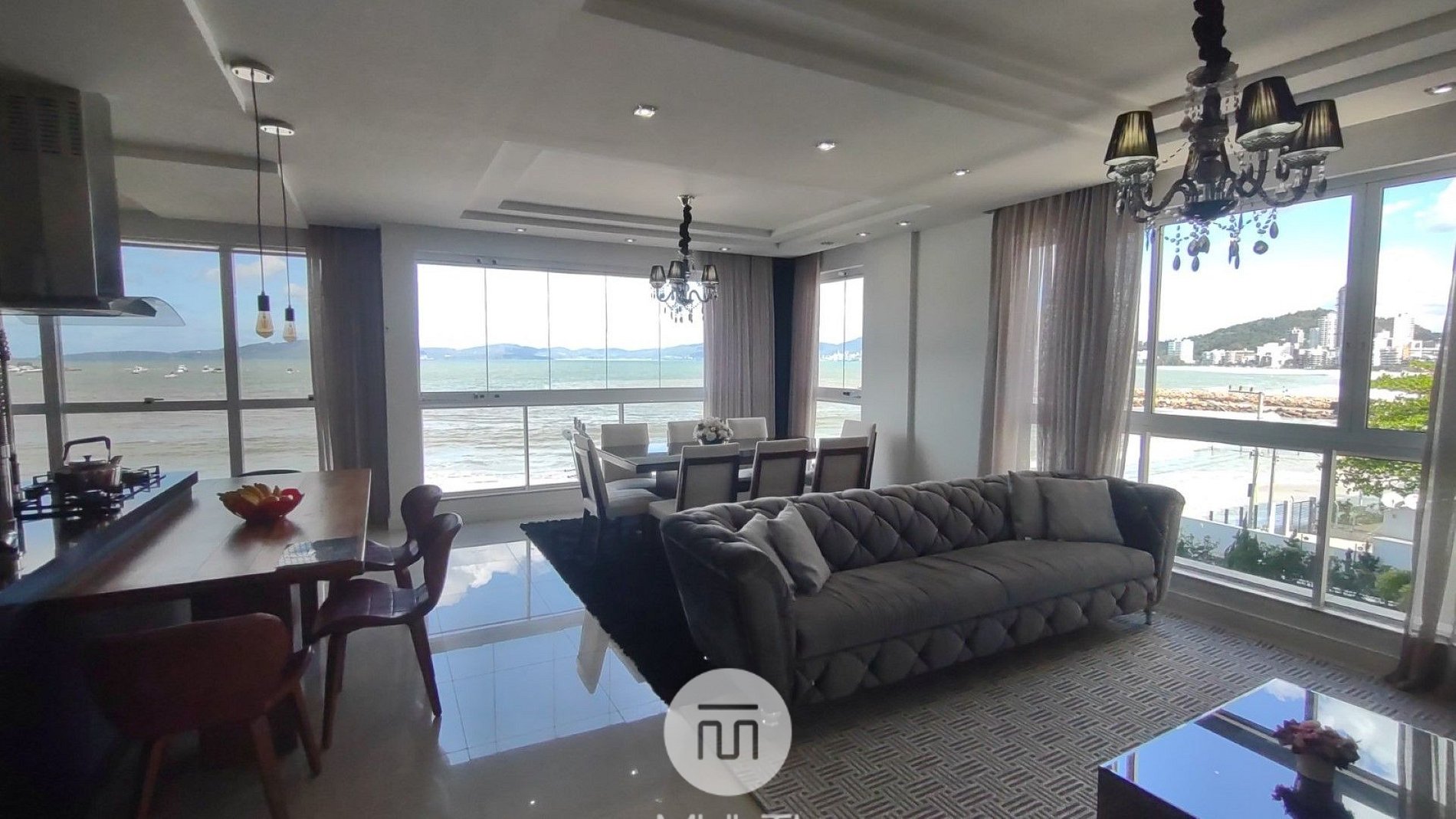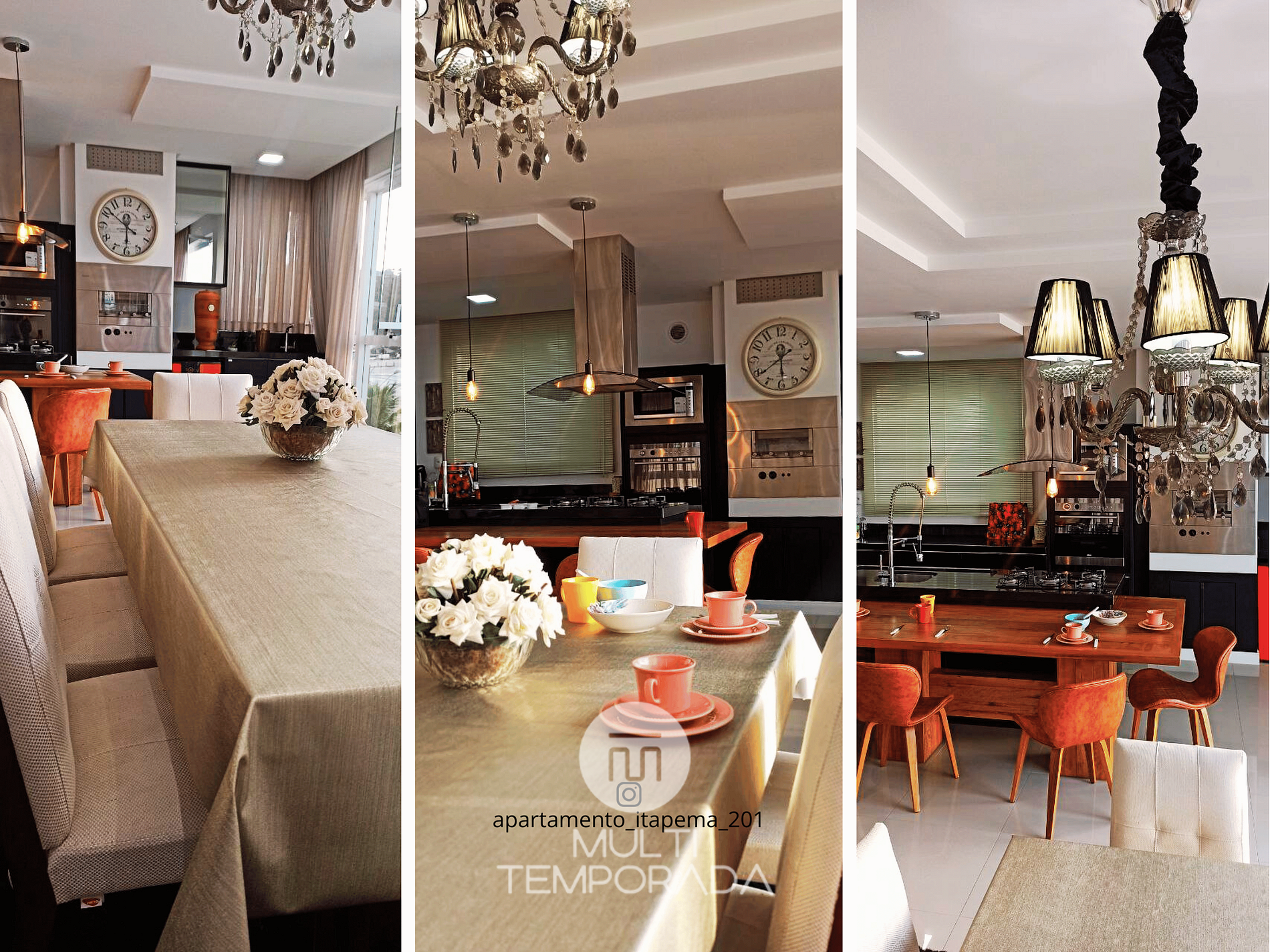 The living room, dining room, pantry, kitchen, and powder room are combined into a welcoming space for socializing and enjoying delicious meals while admiring the crystal-clear sea and the nighttime lights of the Itapema, Meia-Praia, and Porto Belo waterfront.