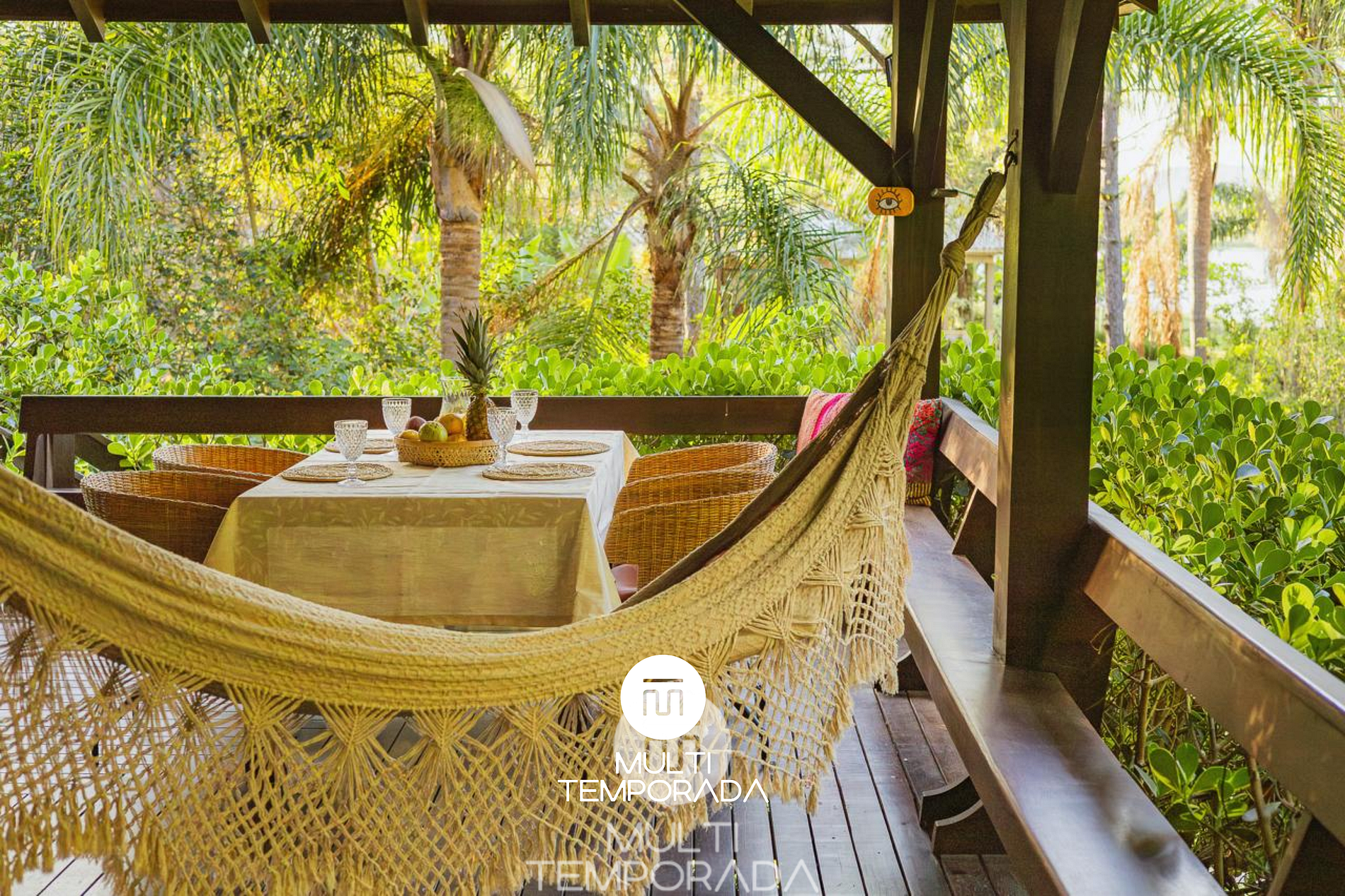 The space connects to a large wooden veranda with a direct view of the Ibiraquera Lagoon, an ideal setting to enjoy the sunset, relax in a hammock, or simply contemplate the tranquil landscape of the lagoon.