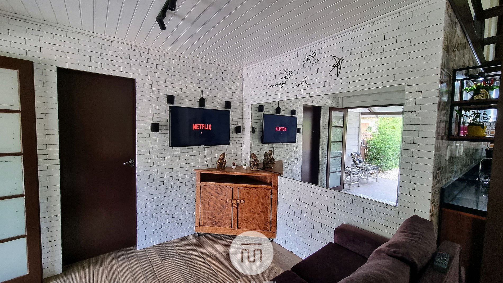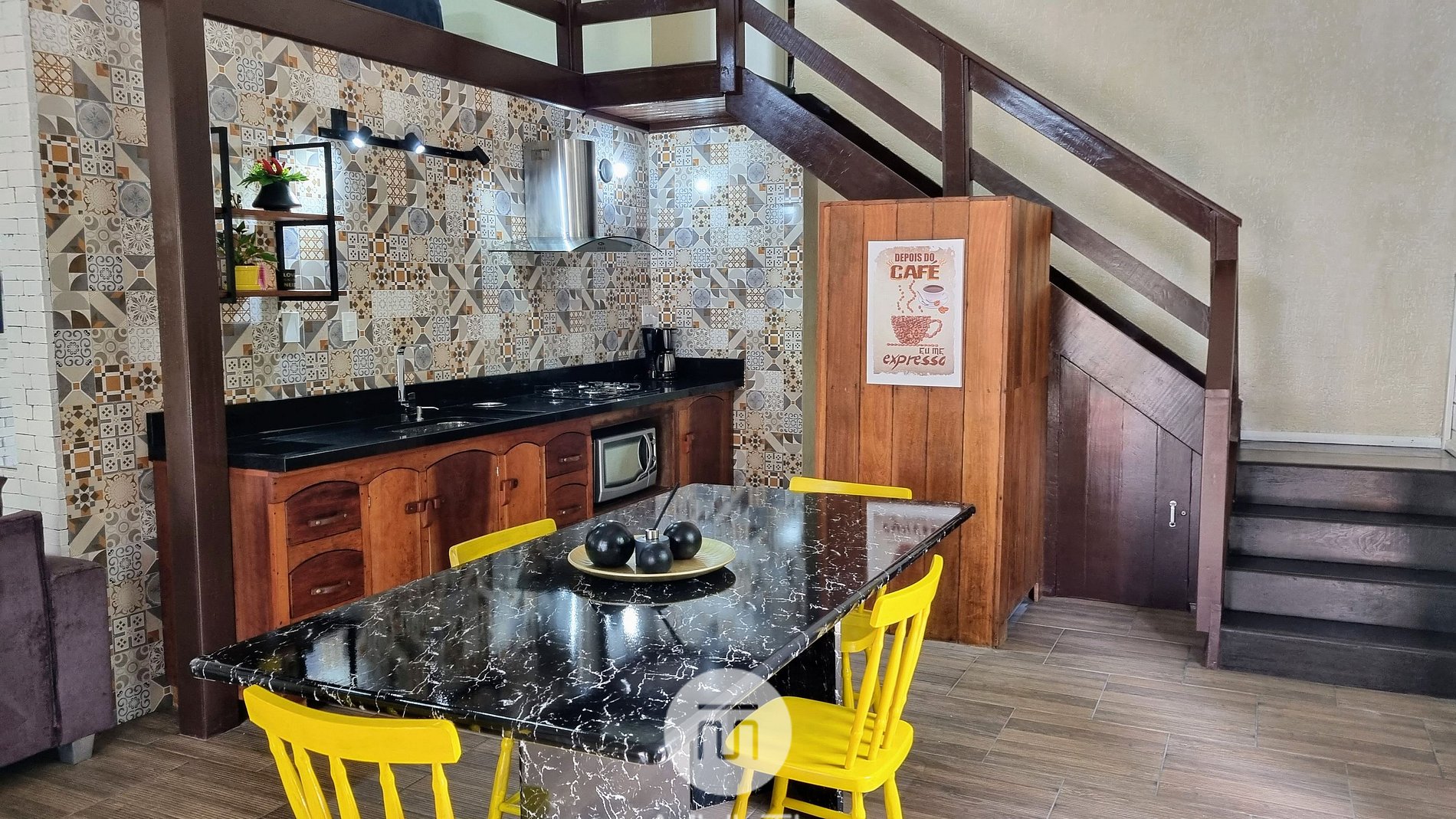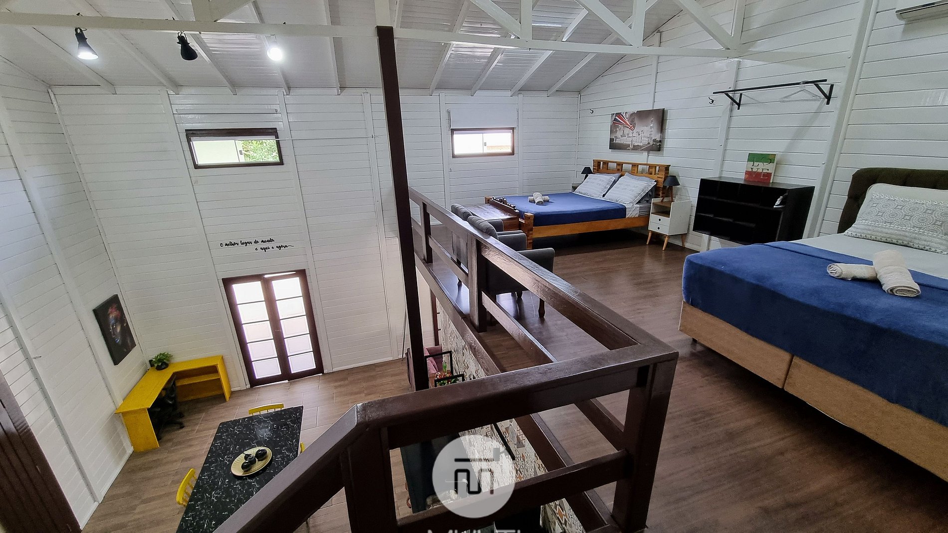 Description of spaces: * Kitchen: Refrigerator, stove, oven, microwave, cupboards, sink and all cooking utensils; * Living room: Table, chairs, rack and 43 "television with cable channels. * Bedroom (mezzanine style): Queen size bed, a single bunk bed and an additional double mattress, wardrobe, dresser and air conditioning; * Bathroom: Complete with water heating in the electrical system, private space for guests, with parking!