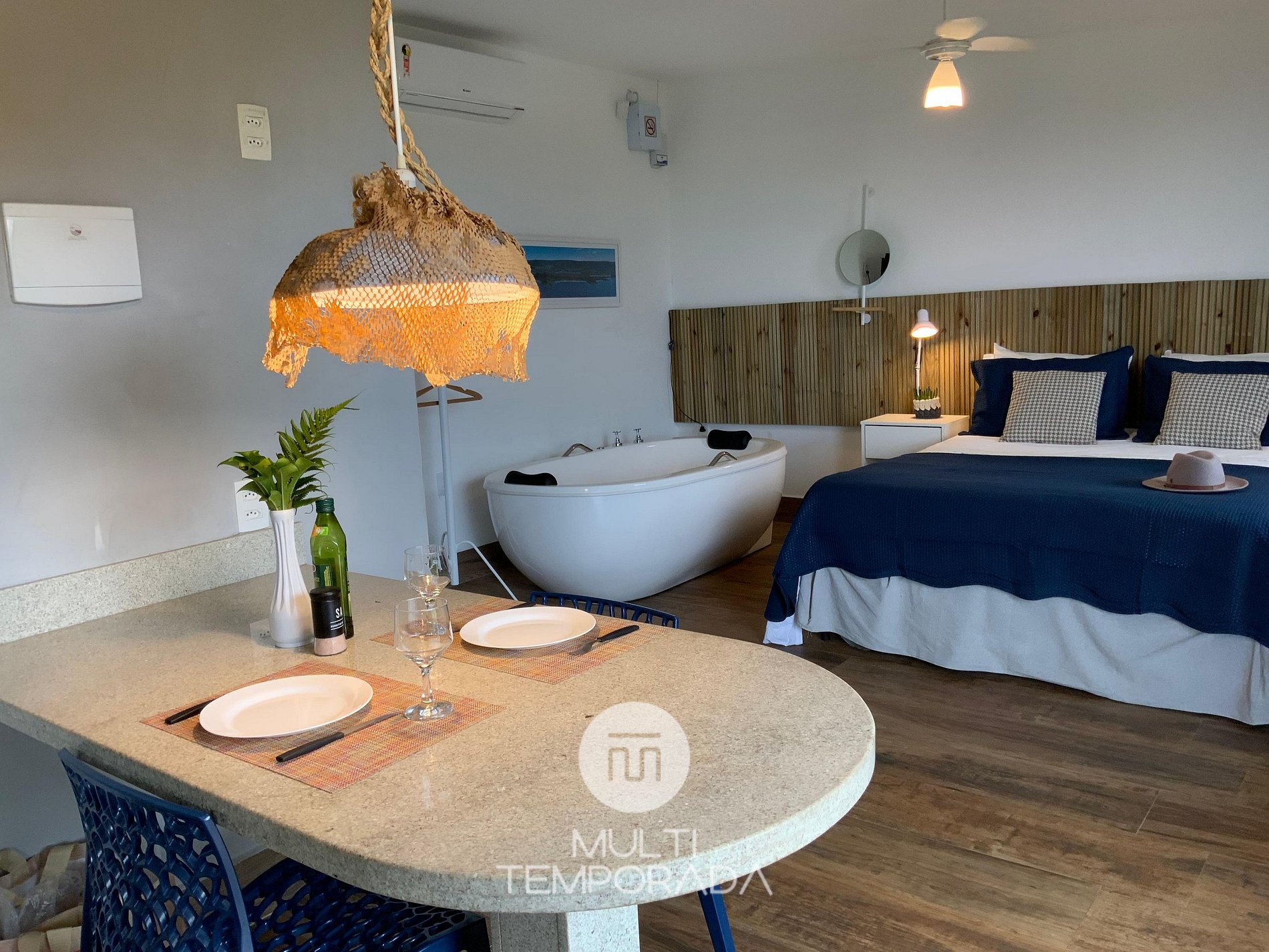 Pyxis Bungalow is located on a large plot of land with a beautiful view of the lagoon and the sea. The fully air-conditioned Bungalow (hot and cold air conditioning), private internal bathtub, internal fireplace, comfortably accommodates a couple, with a double bed, beachy and pleasant decor. In addition, it has a bathroom, kitchen with basic items, minibar, stove, blender, coffee maker, sink and table. We have a Flat Screen TV with Smart TV. On the deck you can enjoy outdoor lounge chairs, hammocks and a private barbecue.