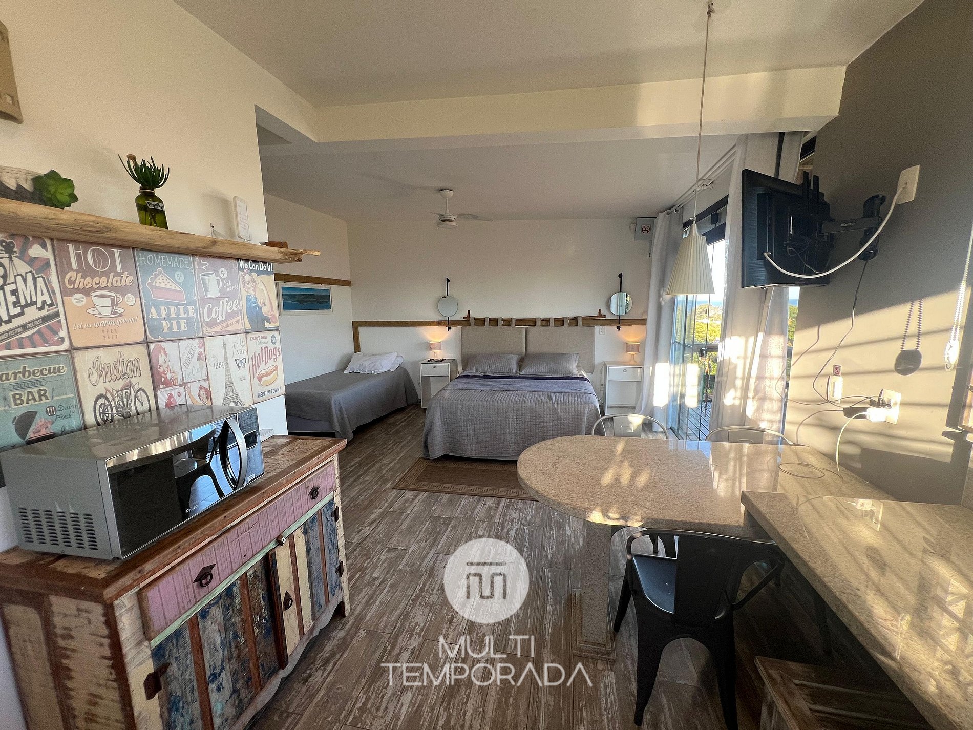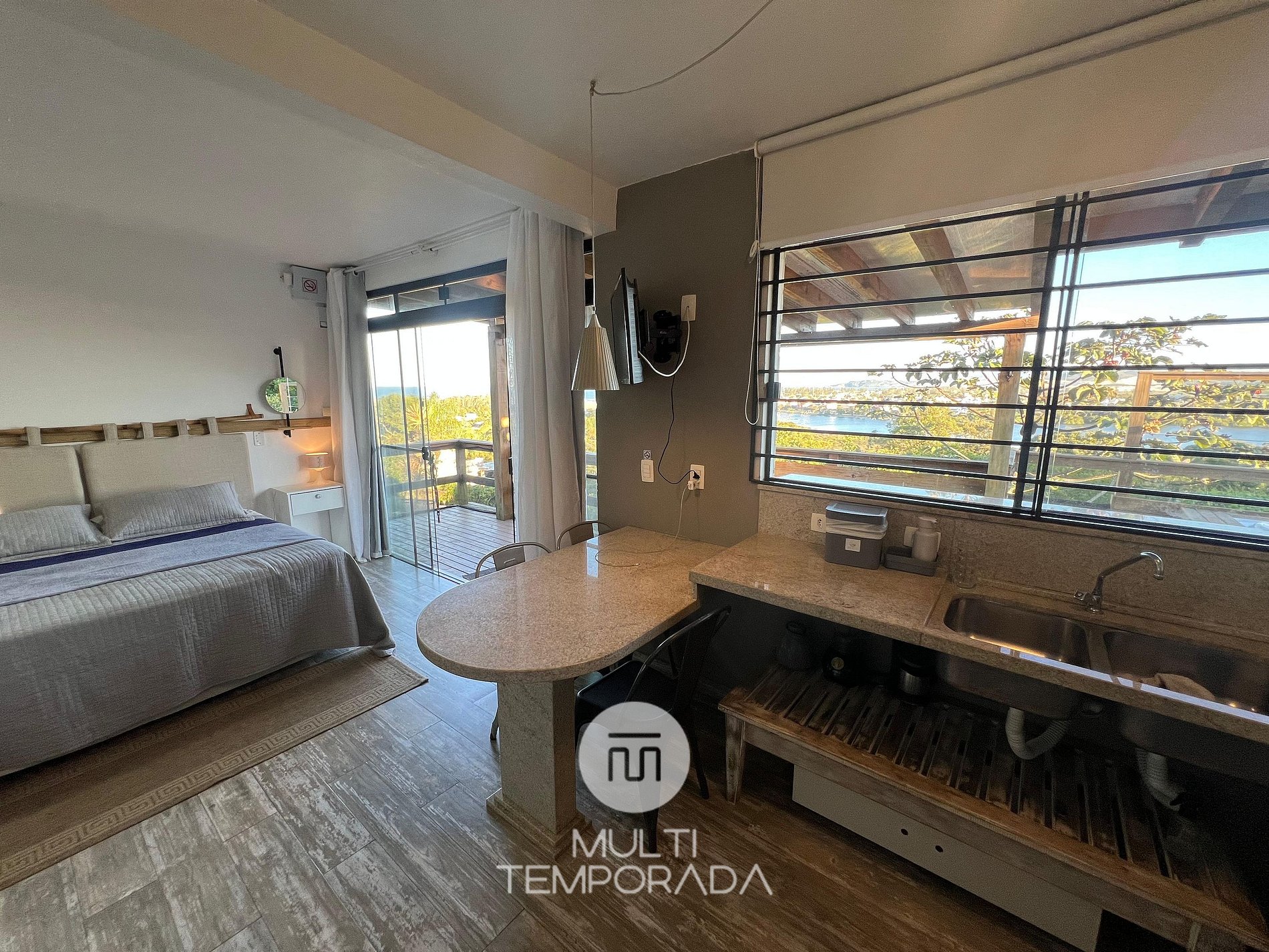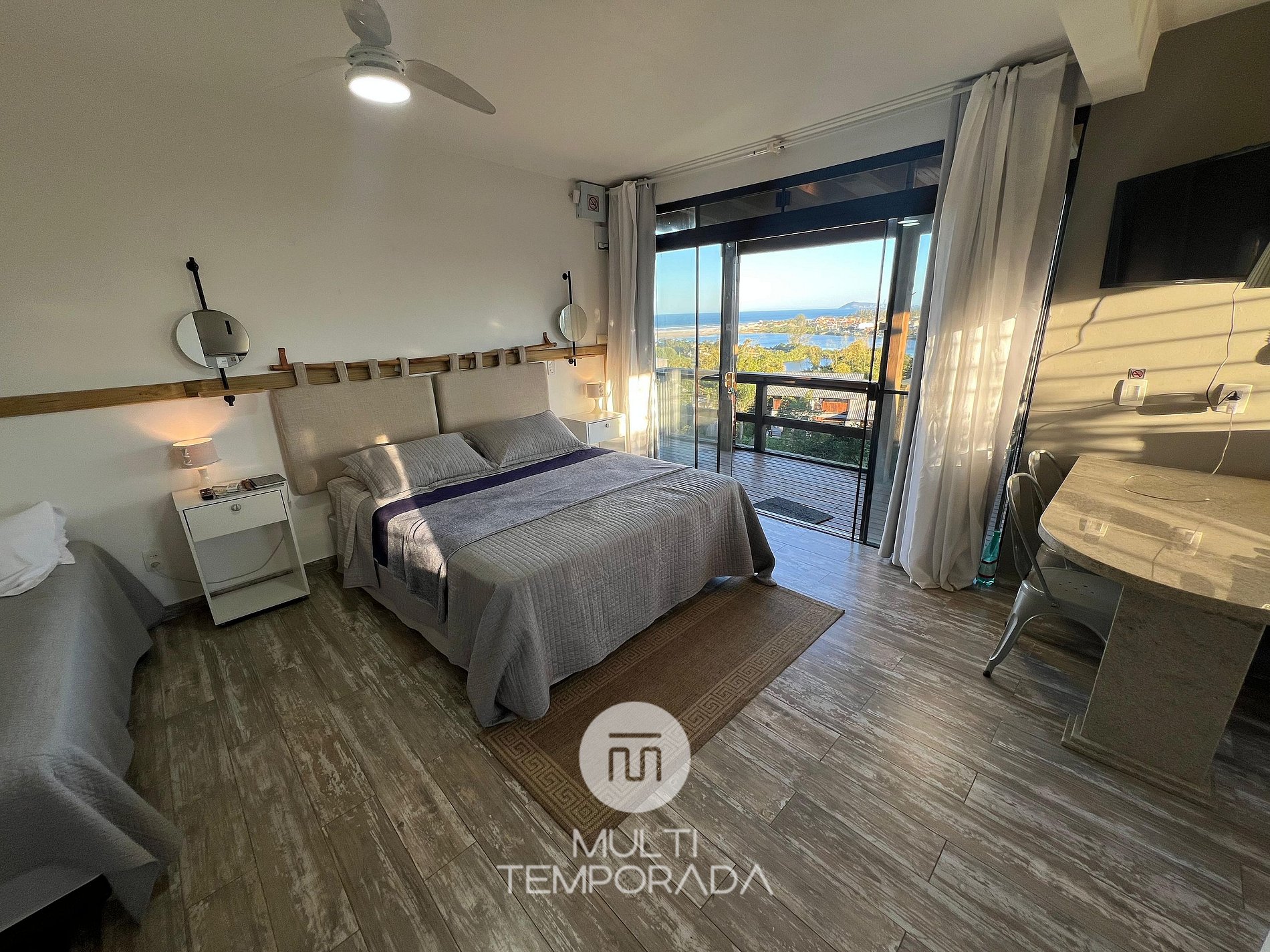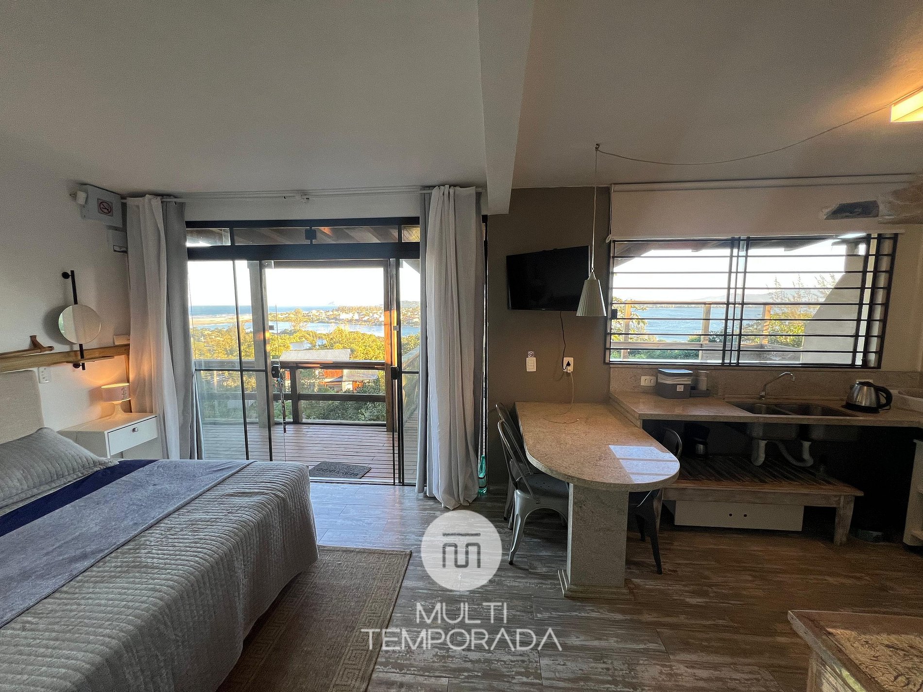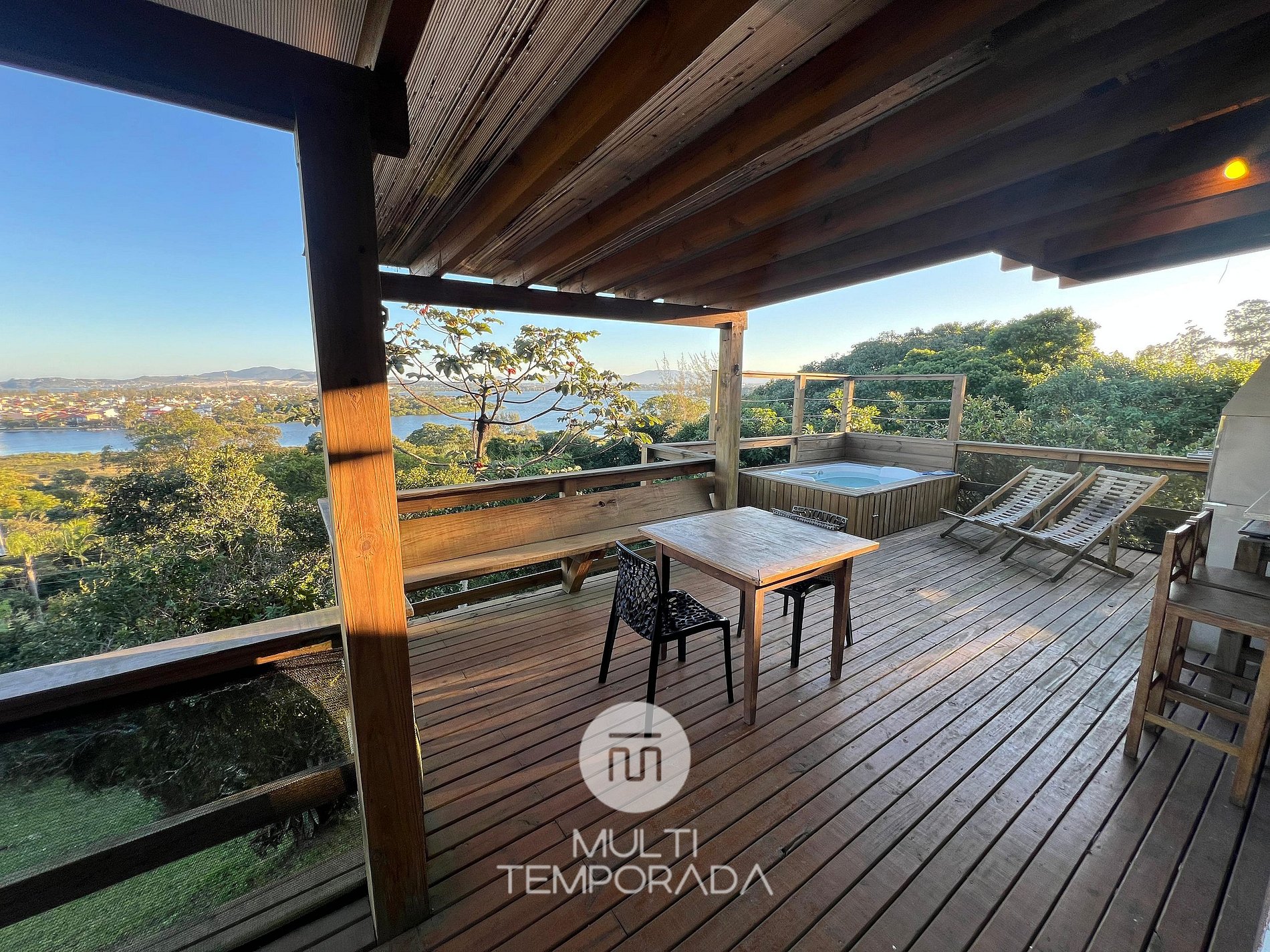 Multitemporada presents the Sagittarius Bungalow, one of the 6 units of Chalés & Bangalôs Ibiraquera, which has a privileged location and view of the lagoon and the sea in the Ibiraquera neighborhood, in Imbituba, on the coast of Santa Catarina. All of our 6 units are private, with the pool being the only shared space on the property.