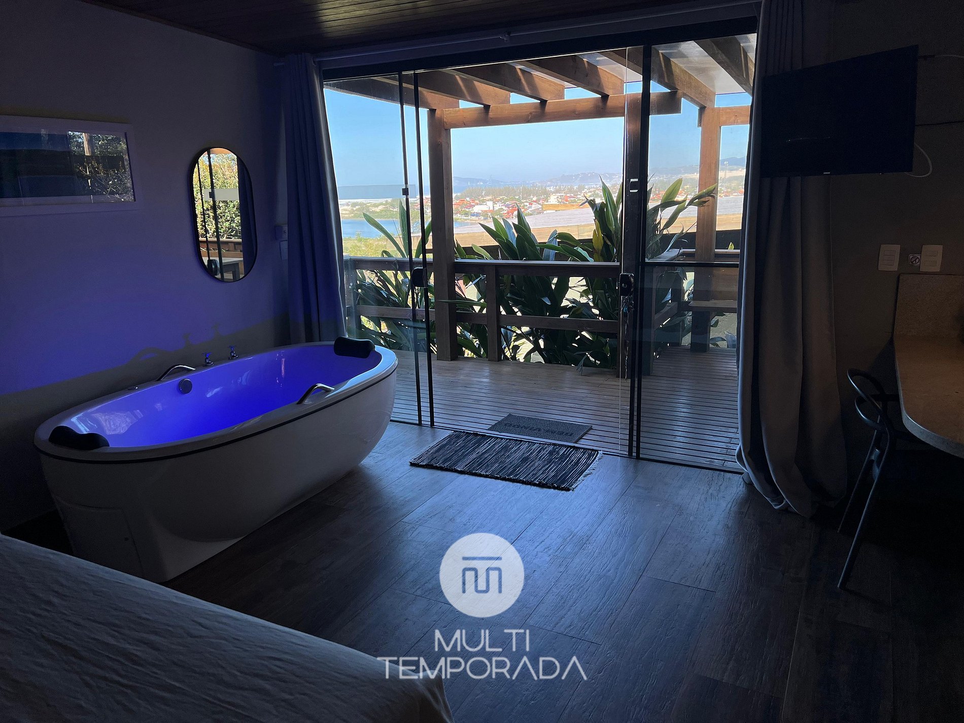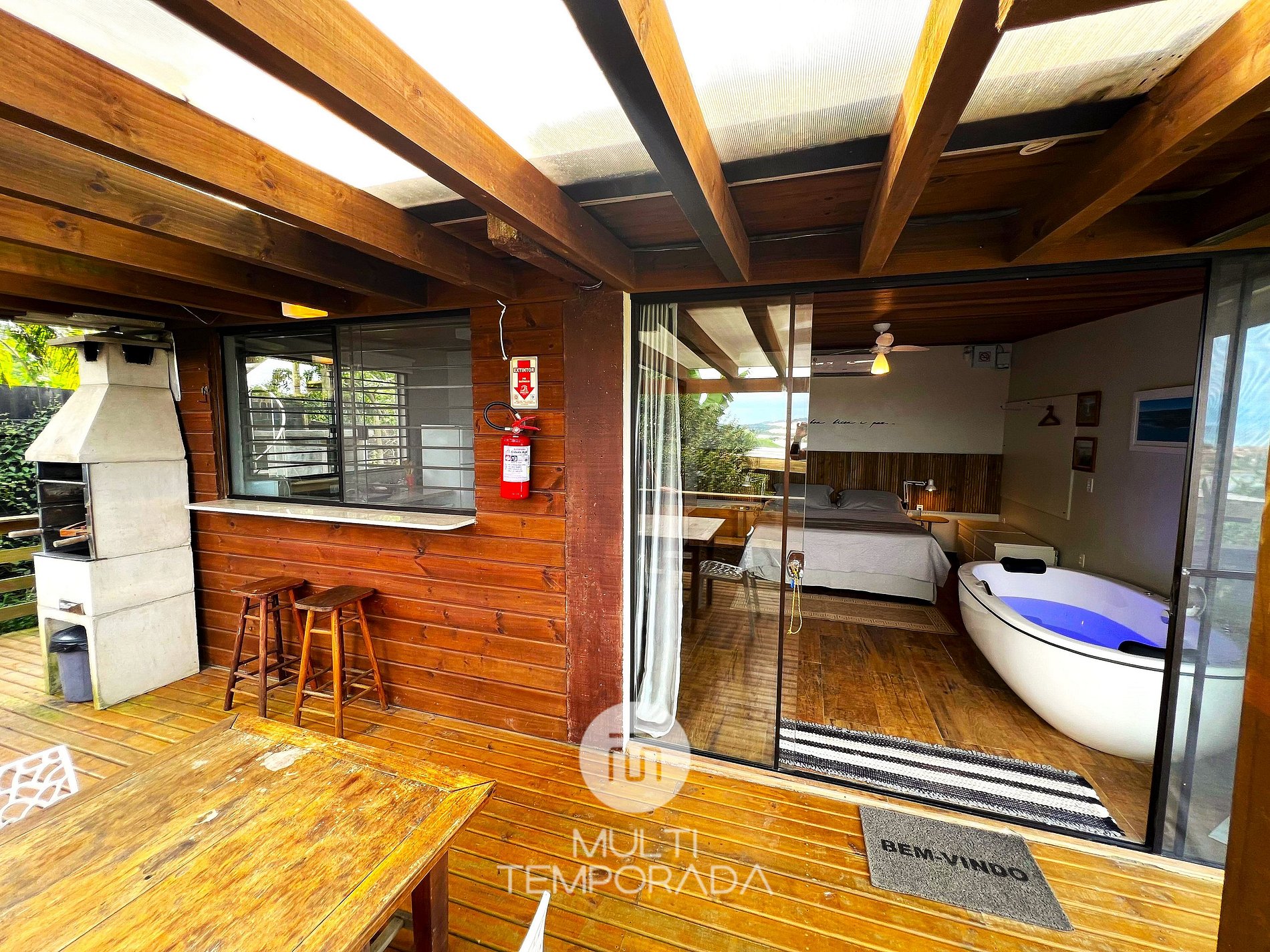 Multitemporada presents the Serpens Bangalô, one of the 6 units of Chalés & Bangalôs Ibiraquera, which has a privileged location and view of the lagoon and the sea in the Ibiraquera neighborhood, in Imbituba, on the coast of Santa Catarina. All of our 6 units are private, with the pool being the only shared space on the property.
