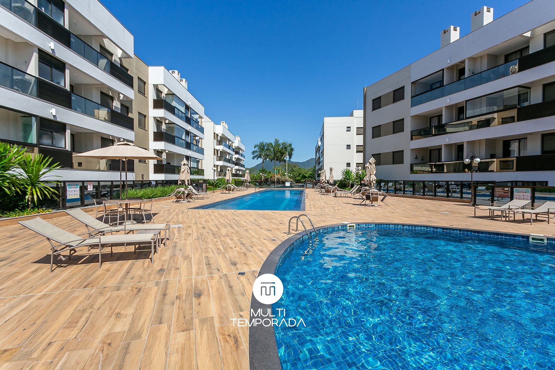 Multitemporada offers: Águas da Cachoeira Apartment - Florianópolis/SC. Fully furnished 74m² apartment, 200m from the beach, with 2 air-conditioned bedrooms (1 suite with a double bed and 1 room with 2 single beds), living room with air conditioning, extra mattress and capacity for up to 5 people. Features 750MB Wi-Fi, balcony with barbecue, equipped kitchen, laundry, complete bedding, and 1 parking space. Condominium with pool and 24-hour security.