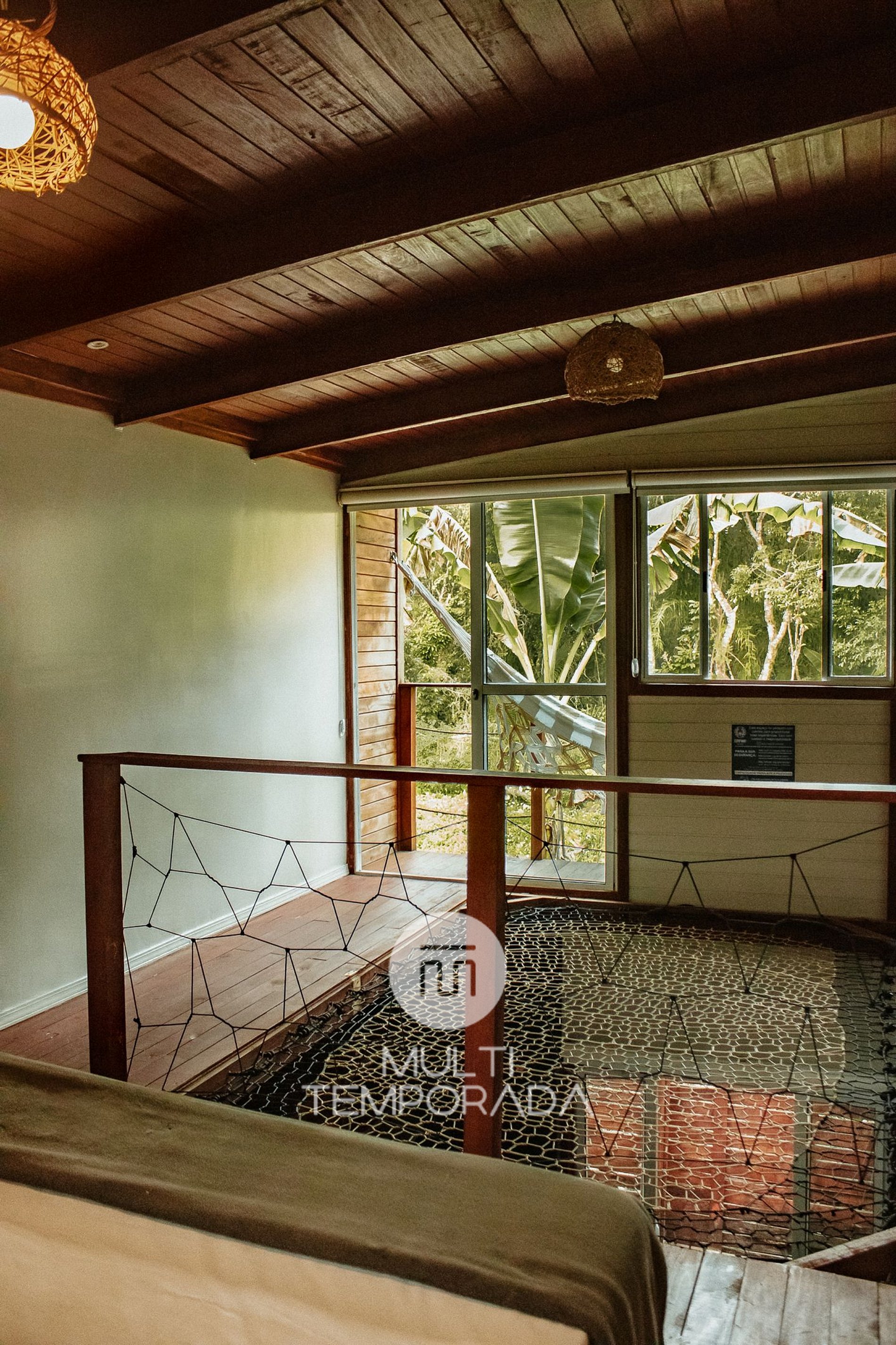 Mezzanine: Double bed and square hanging hammock with TV projector;