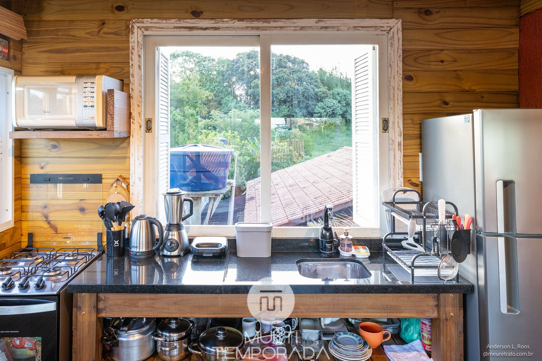 The fitted kitchen has: refrigerator, stove, oven, microwave, sandwich maker, blender, electric kettle, sink with electric faucet, crockery and cutlery, glasses and wine glasses and complete kitchen utensils.