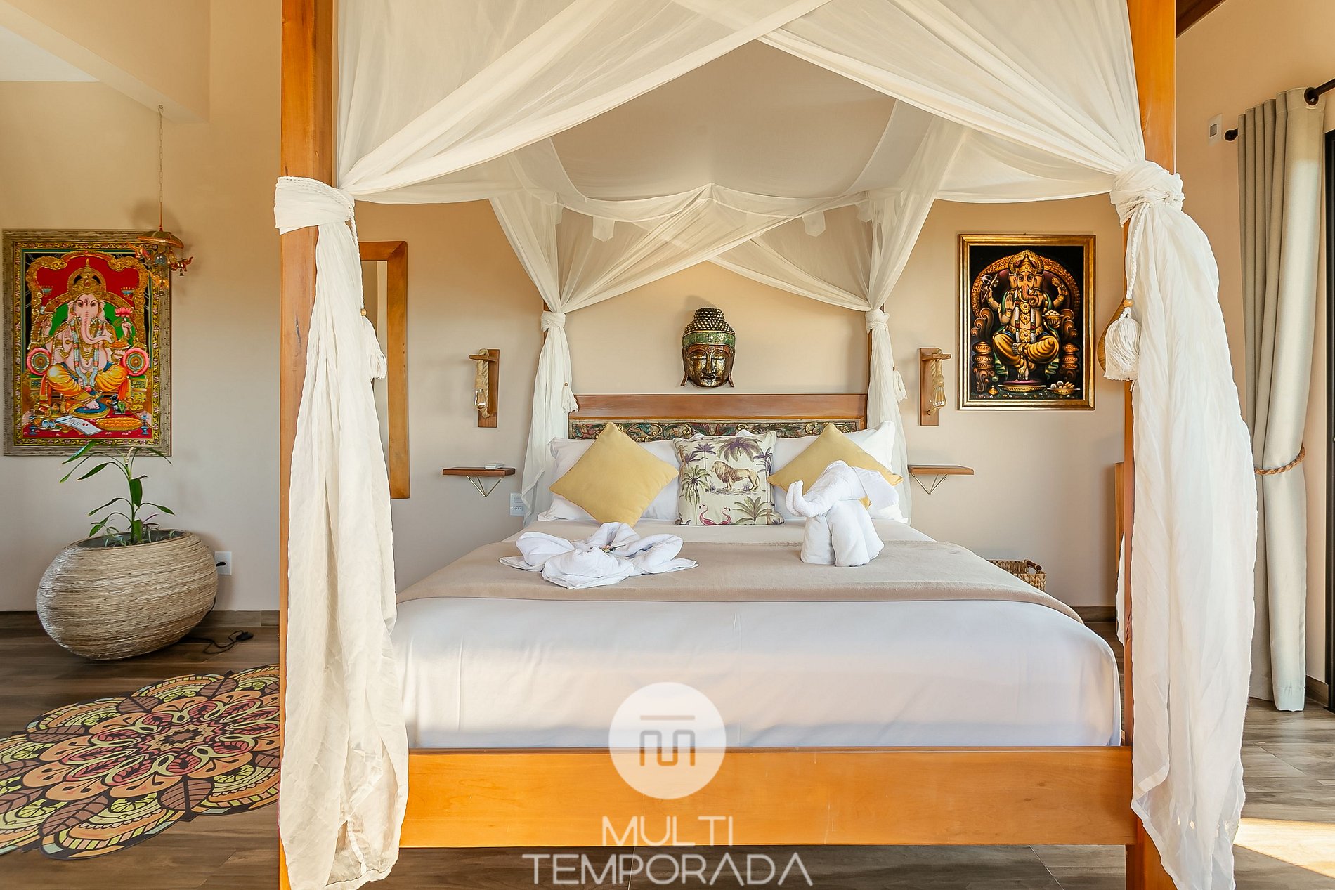 The Ganesh Suite is spacious (34m²), comfortable and air-conditioned. It has a queen-size bed, wardrobe, balcony overlooking the garden and minibar with high-end products available, ensuring greater convenience and well-being for guests;