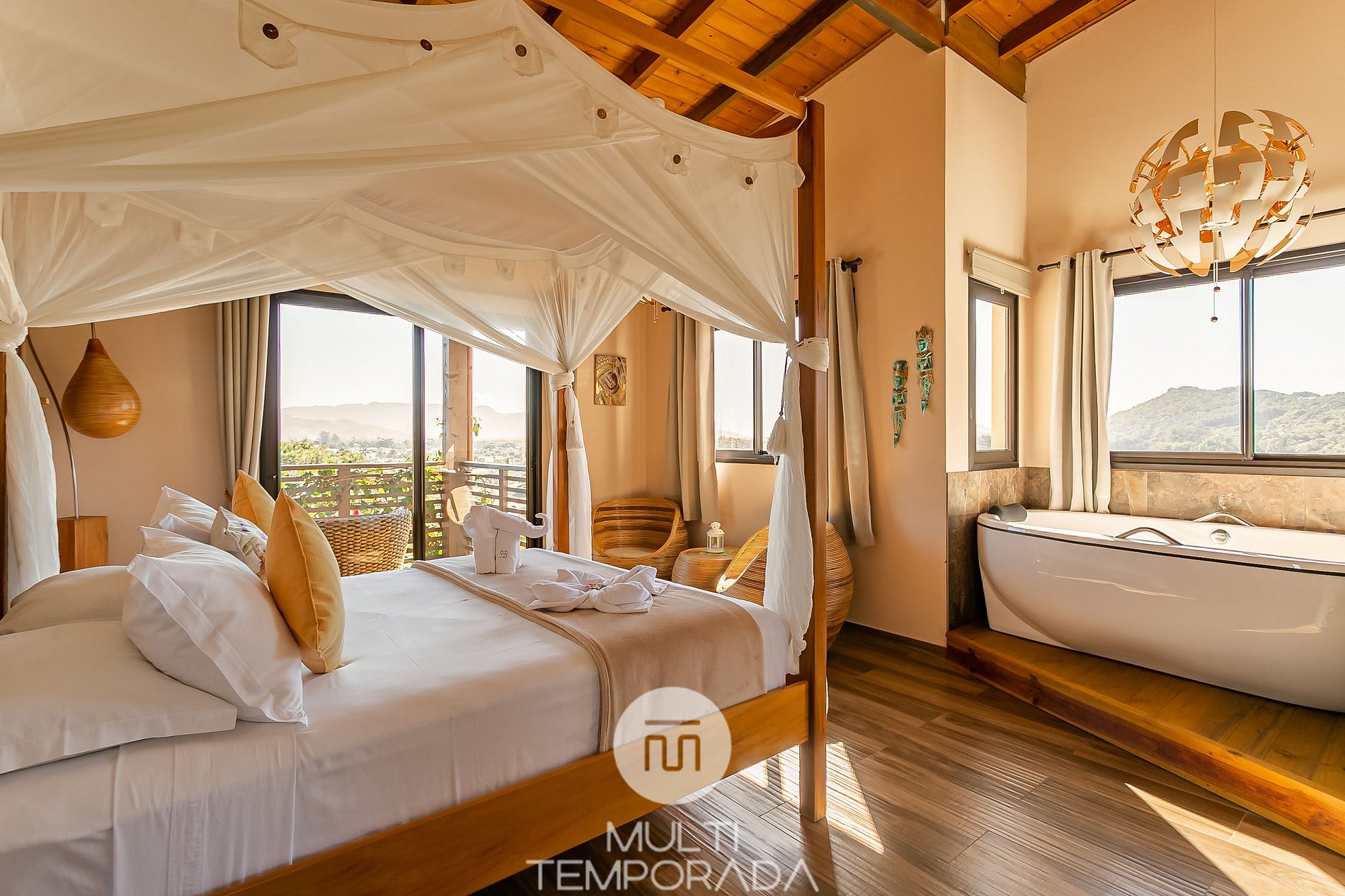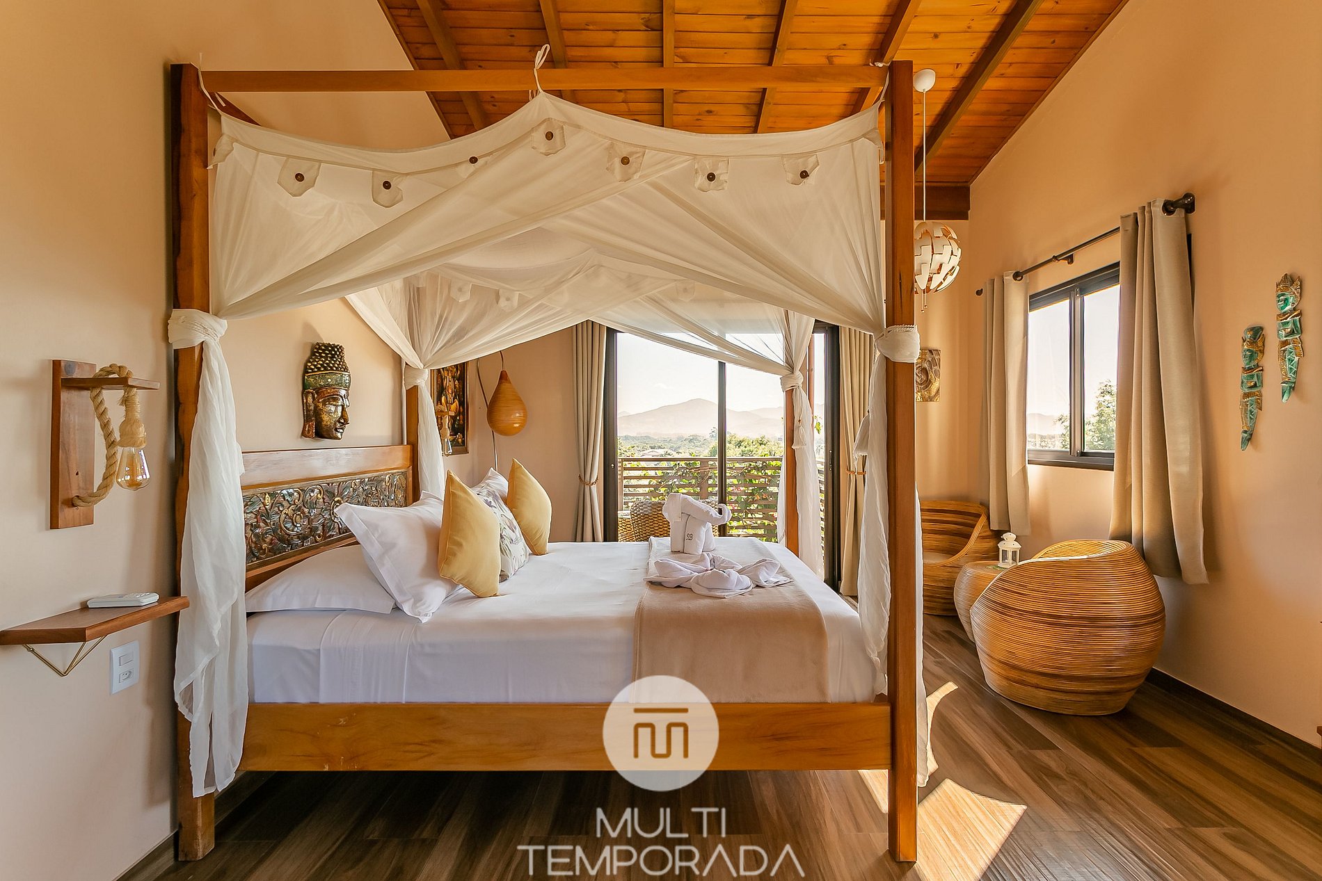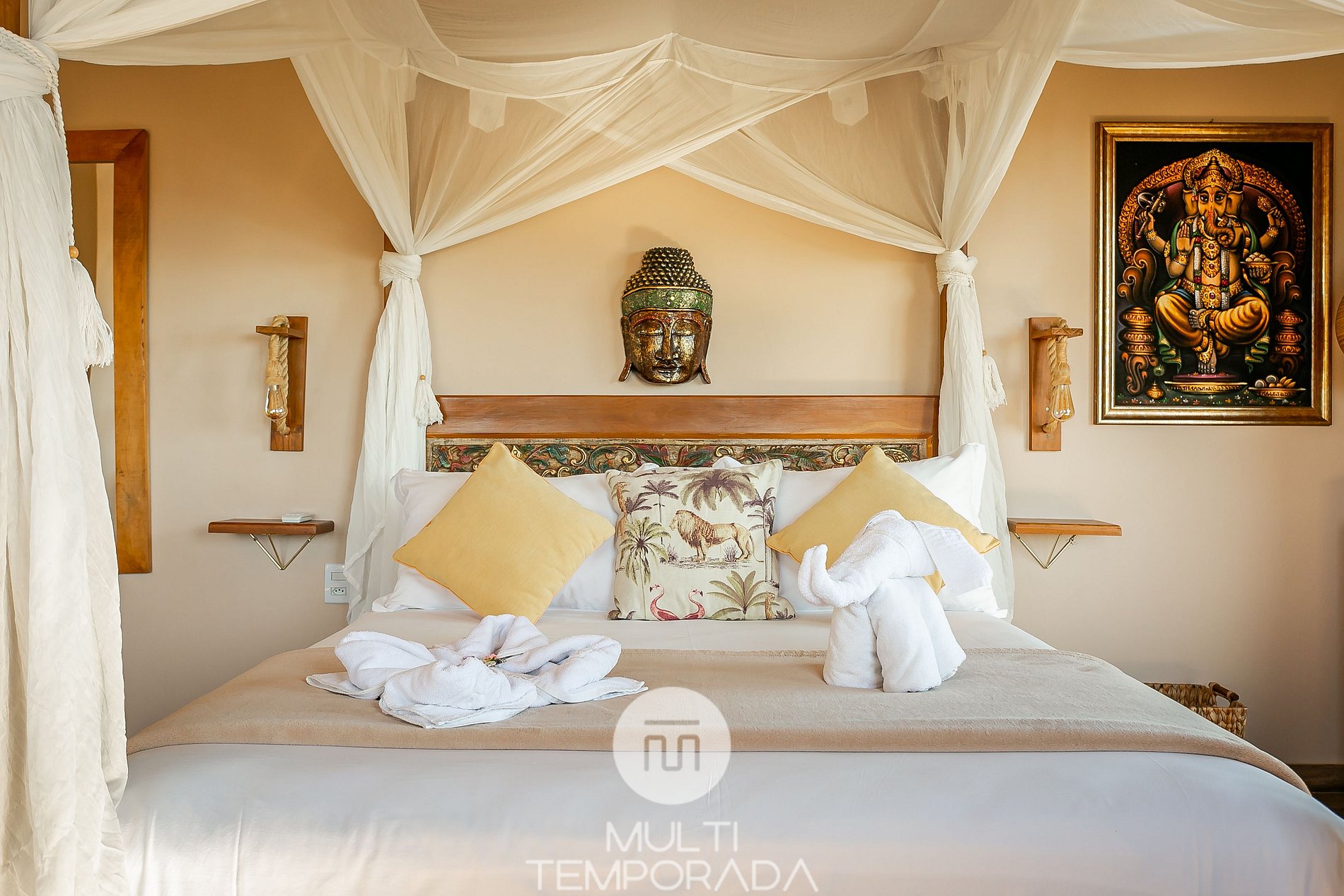 The Ganesh Suite is spacious (34m²), comfortable and air-conditioned. It has a queen-size bed, wardrobe, balcony overlooking the garden and minibar with high-end products available, ensuring greater convenience and well-being for guests;
