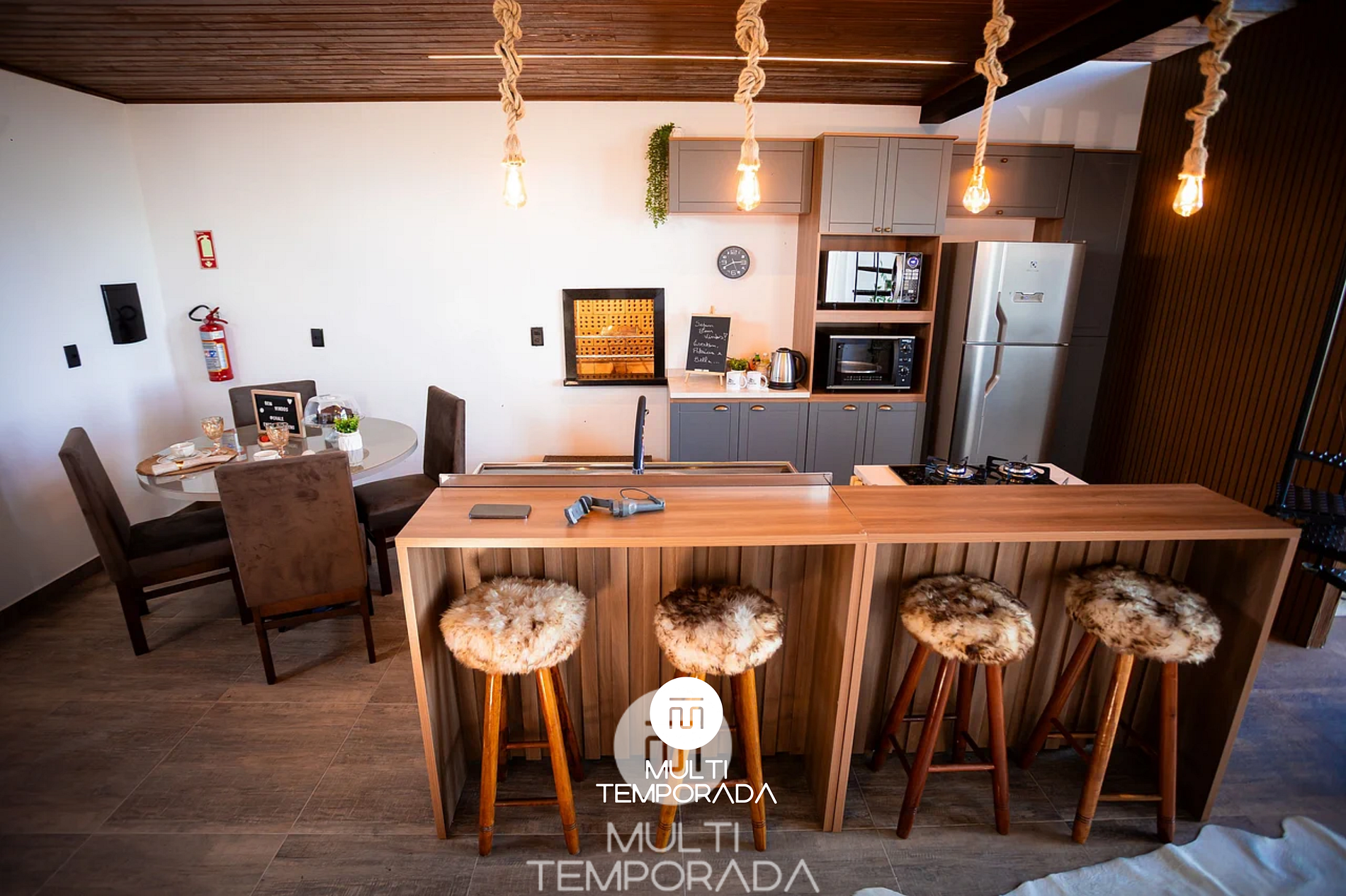 The full kitchen has: refrigerator, electric kettle, oven, stove, microwave, blender, sandwich maker, fondue machine, pots, cutlery, kettle and complete kitchen utensils.