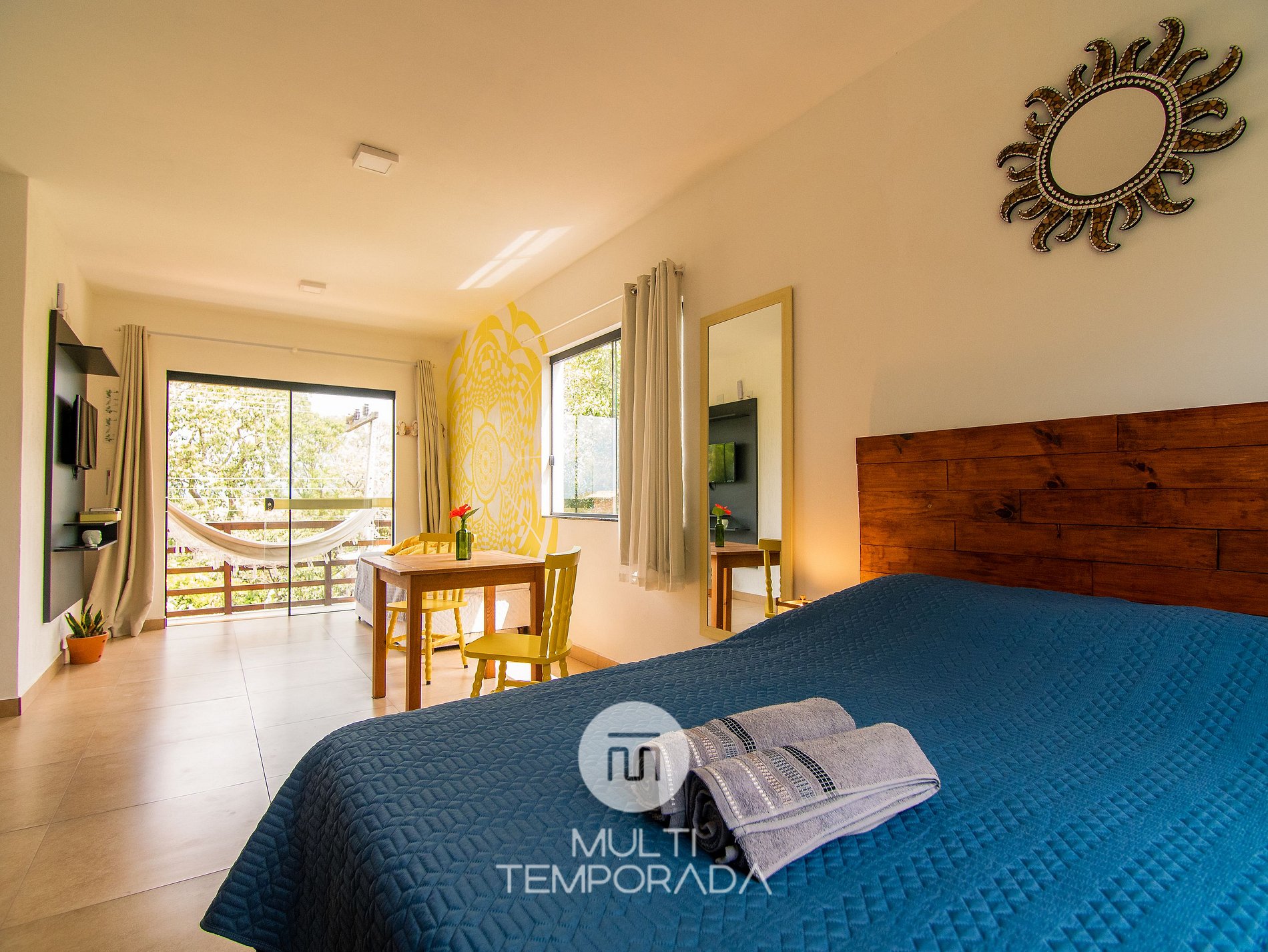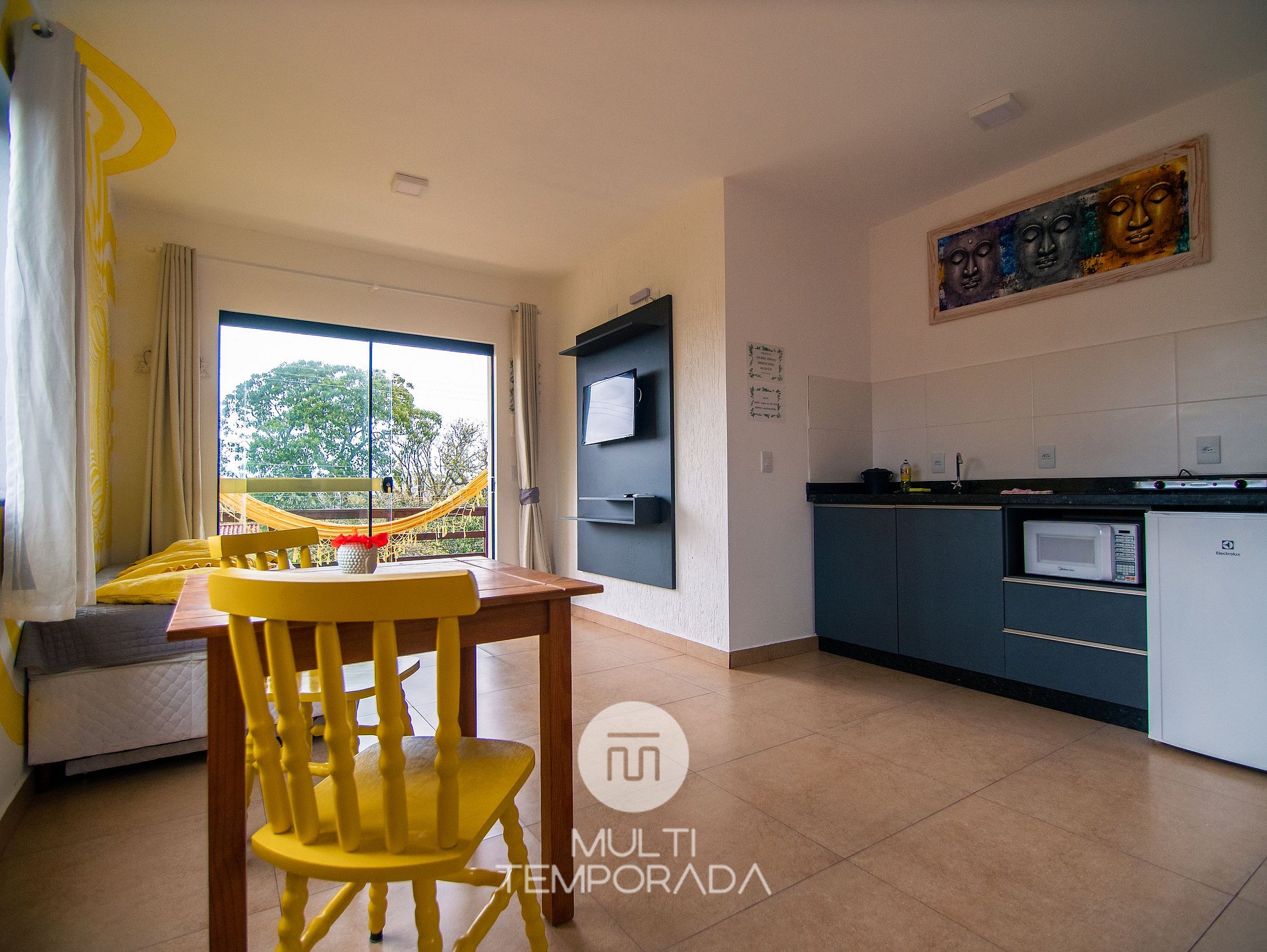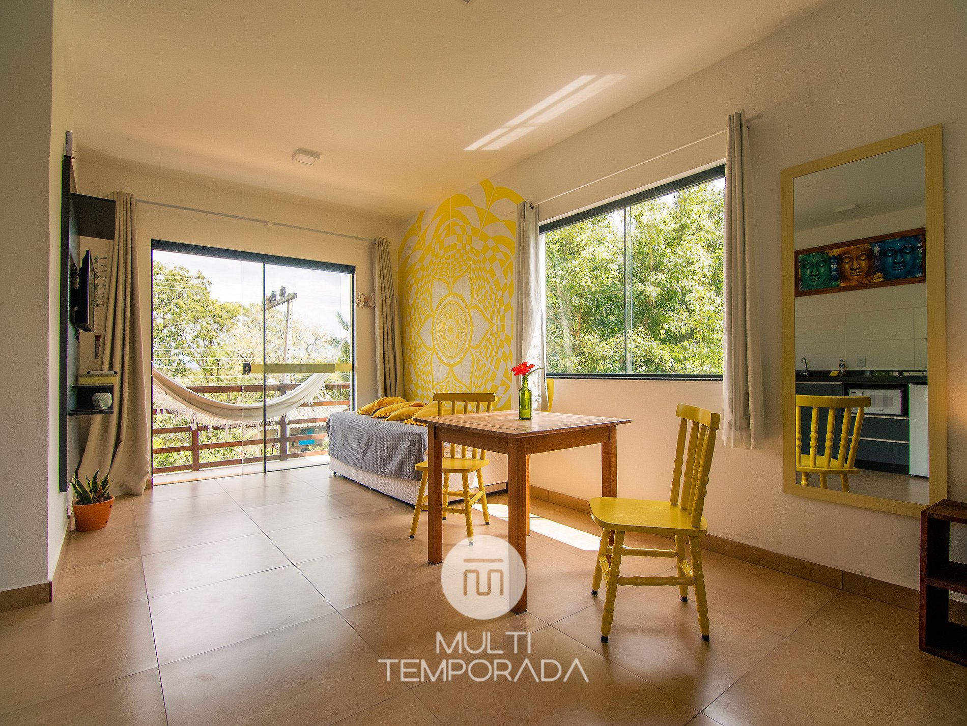 Multitemporada presents: Lugar ao Sol - Flats, located in Praia do Rosa. The space is cozy and pleasant for couples and groups of up to 4 people looking for comfort and a unique experience 900m from Centrinho do Rosa. Our space has a structure surrounded by nature, with Hindu decoration totally relevant to the beach region. There are 6 air-conditioned flats (2 per floor), with a full kitchen and balcony. Finally, we have a terrace with a privileged view of the sunset and the lagoon.
