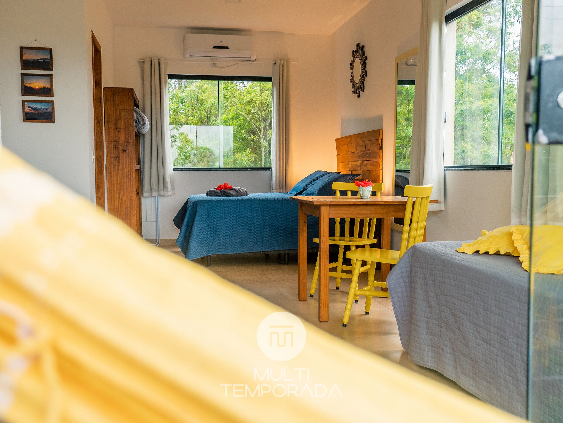 Flats 3 and 4 are located on the 2nd floor. They have a double bed and single bunk bed, 32'' Smart TV, balcony with garden view and a complete kitchen with 2-burner electric stove, 20L microwave, 122-liter minibar, sandwich maker, blender, pans, crockery and cutlery and wine glasses layout, ensuring greater practicality and well-being for guests;