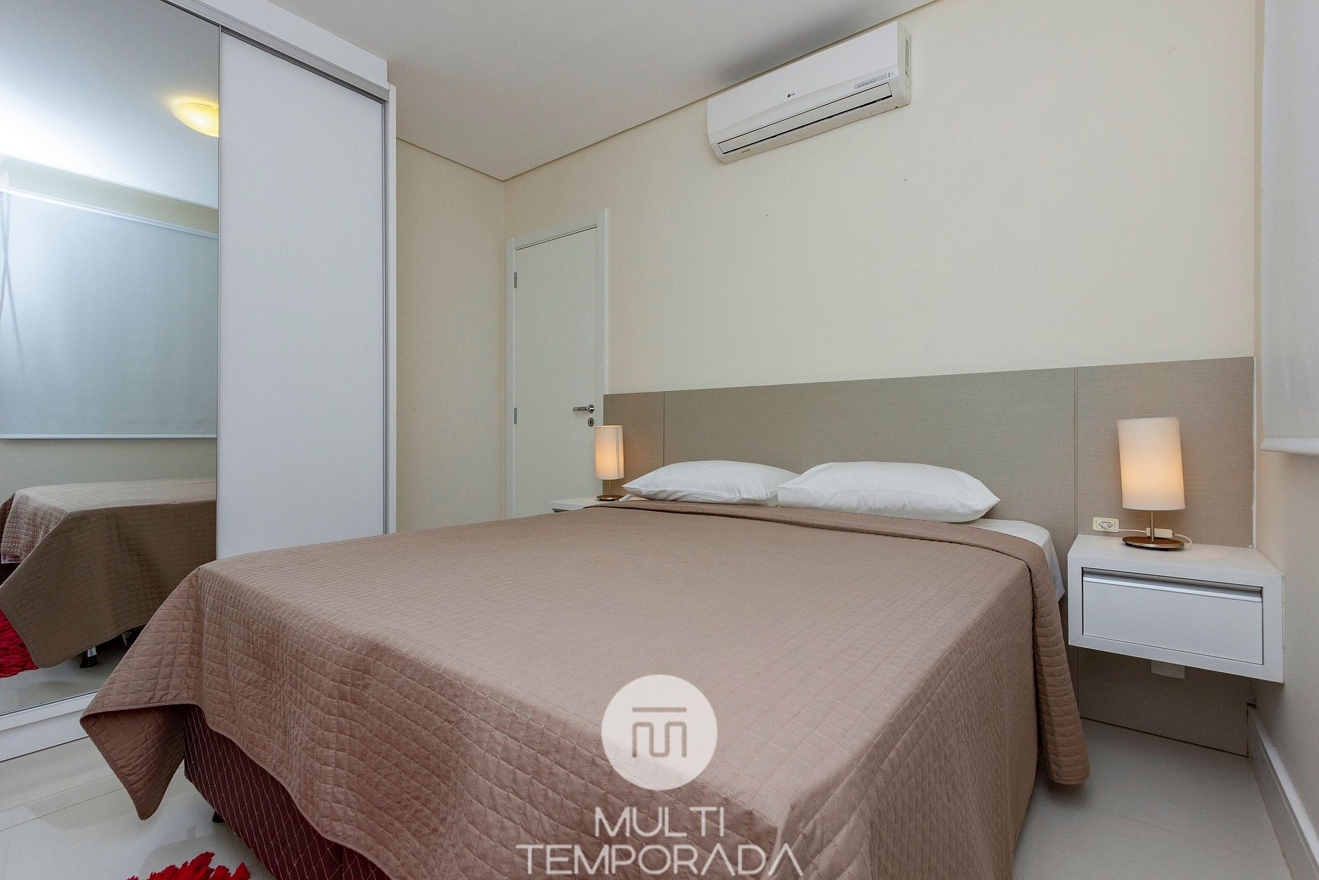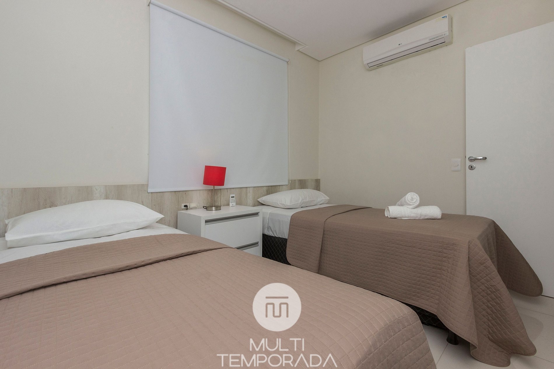 - 2 (two) bedrooms, one suite with a double bed and another room with two single beds and an auxiliary bed.