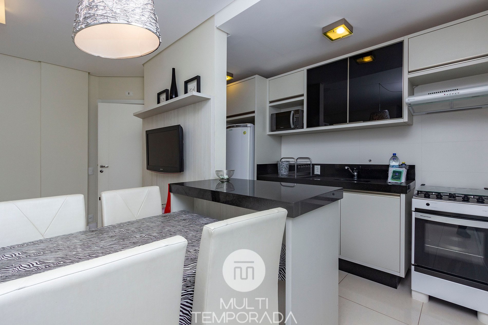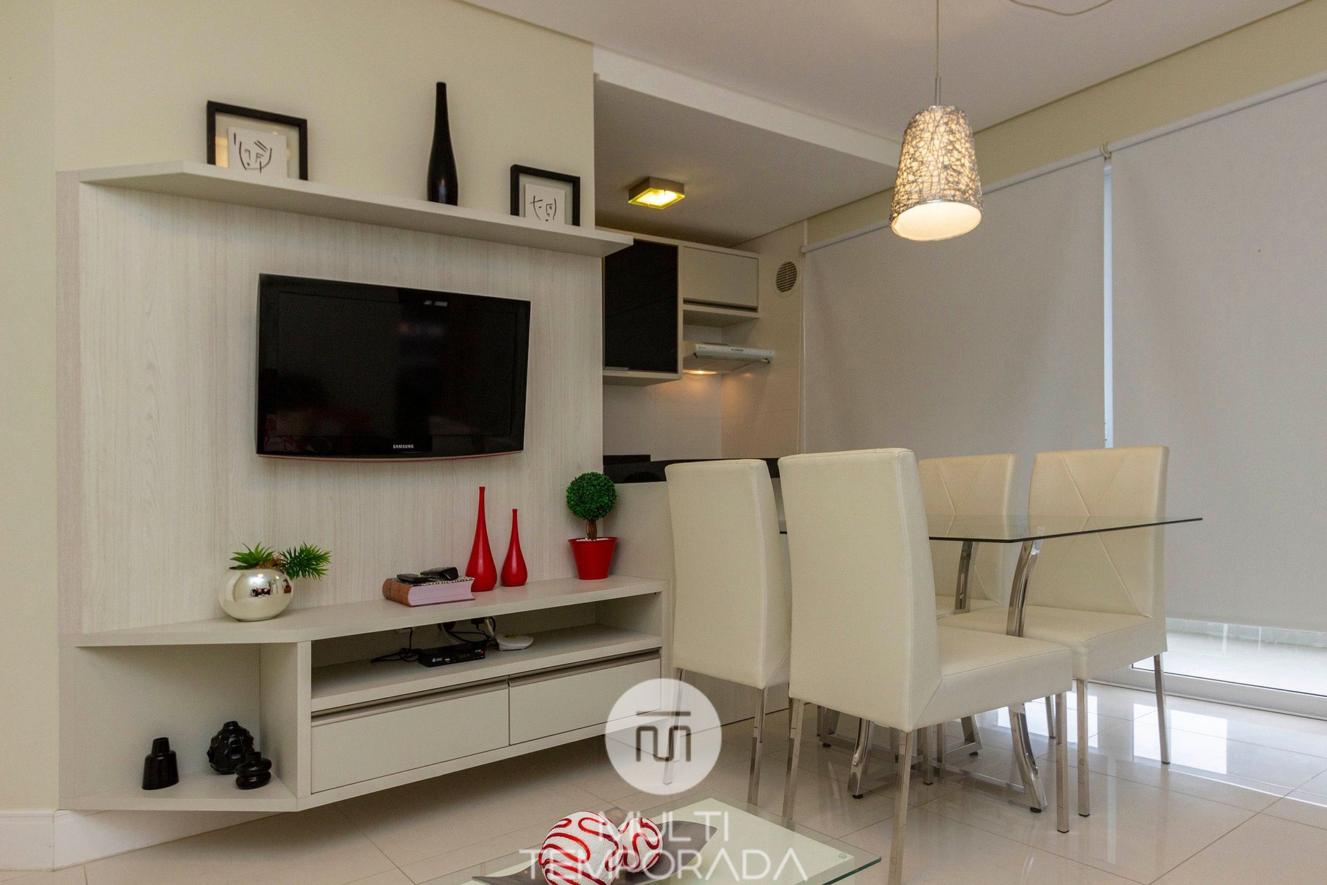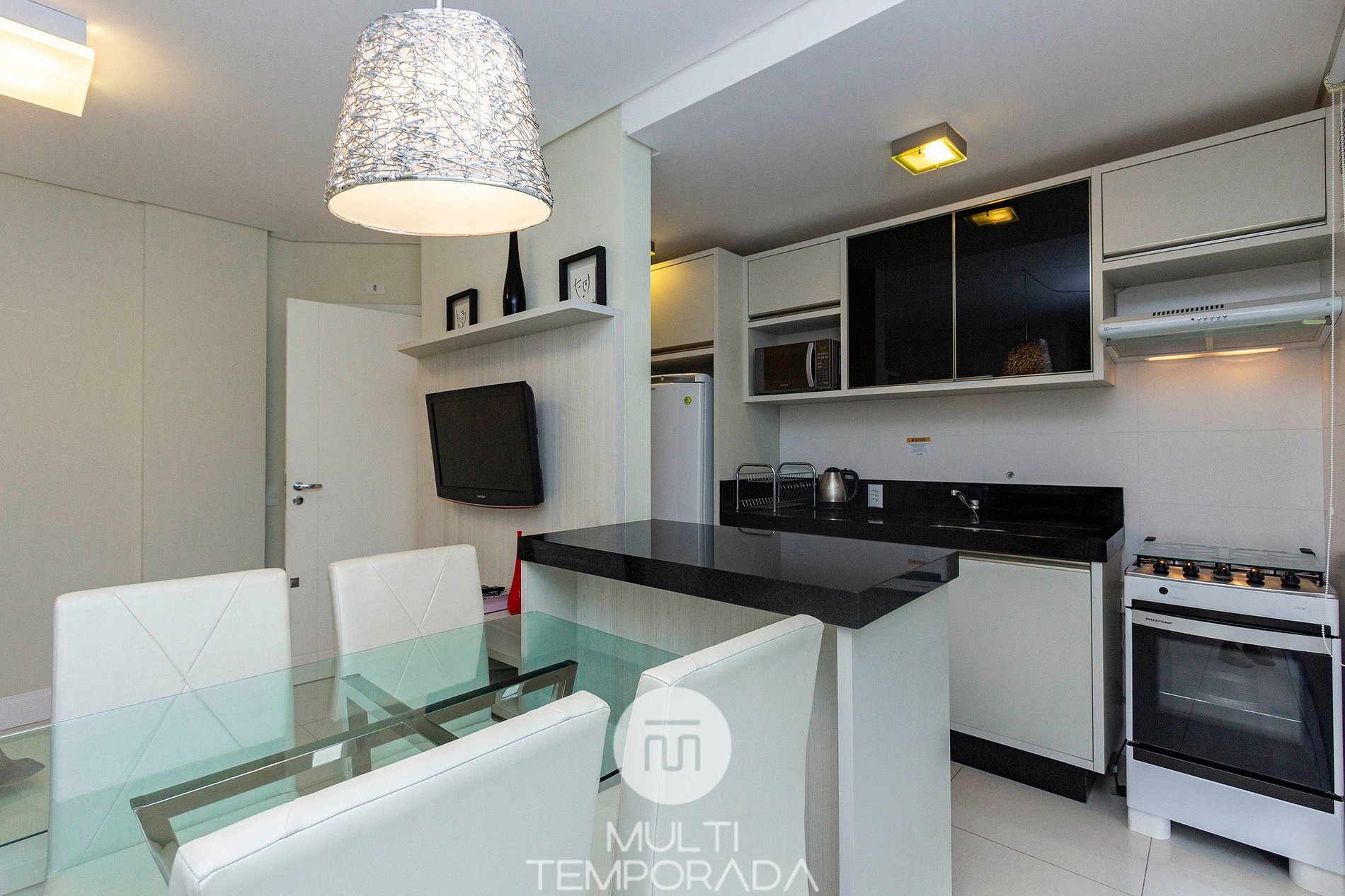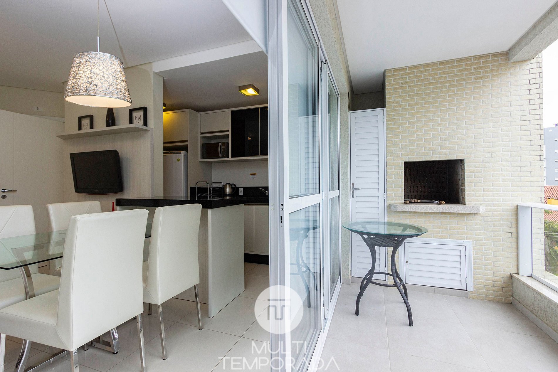 - Large dining room, living room, complete and equipped kitchen, balcony with barbecue, air conditioning in all environments