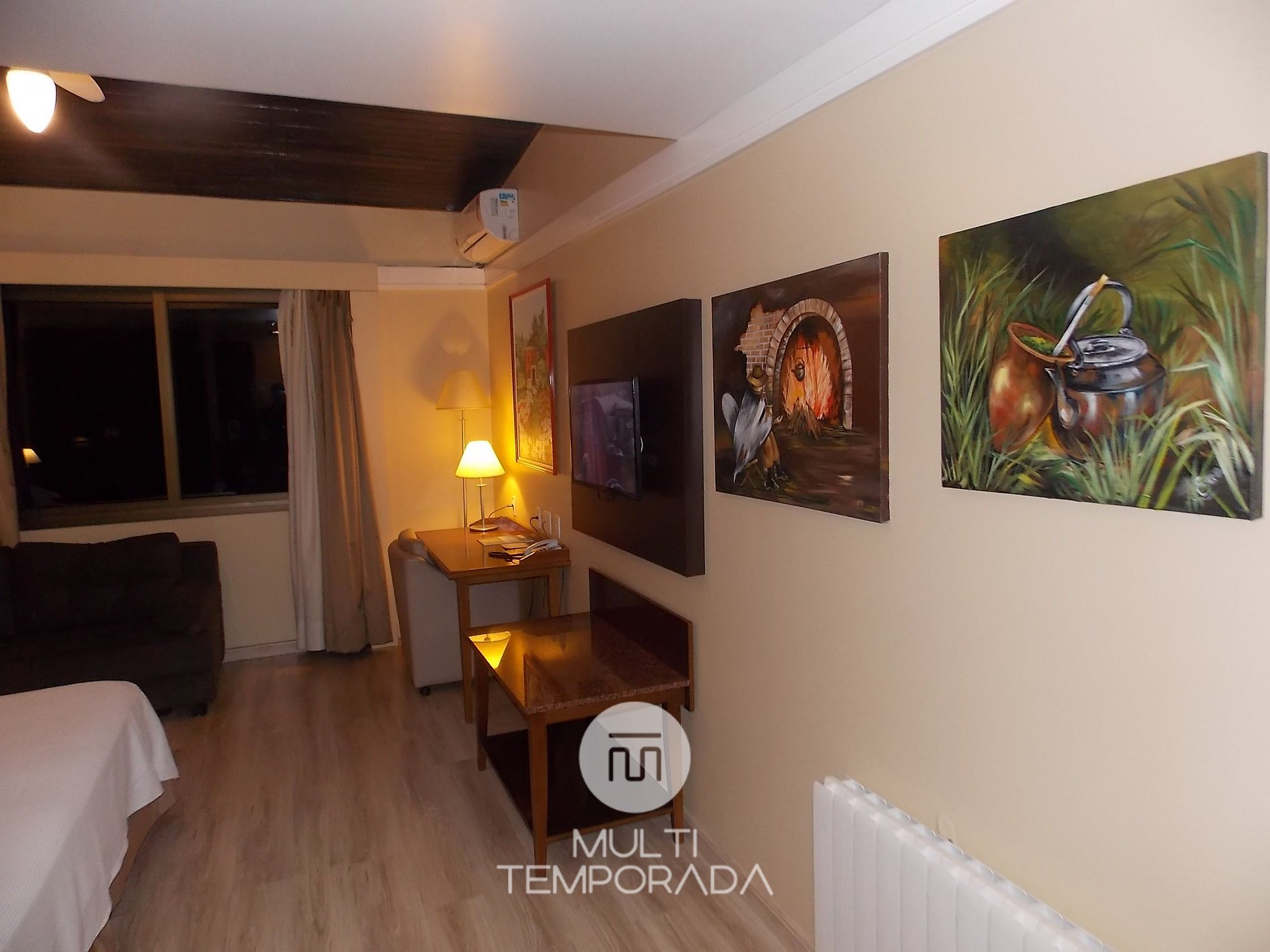 Conta com ar-condicionado, ventilador de teto, calefação, Tv a Cabo, internet, frigobar e microondas, cama de casal e sofá-cama de casal.