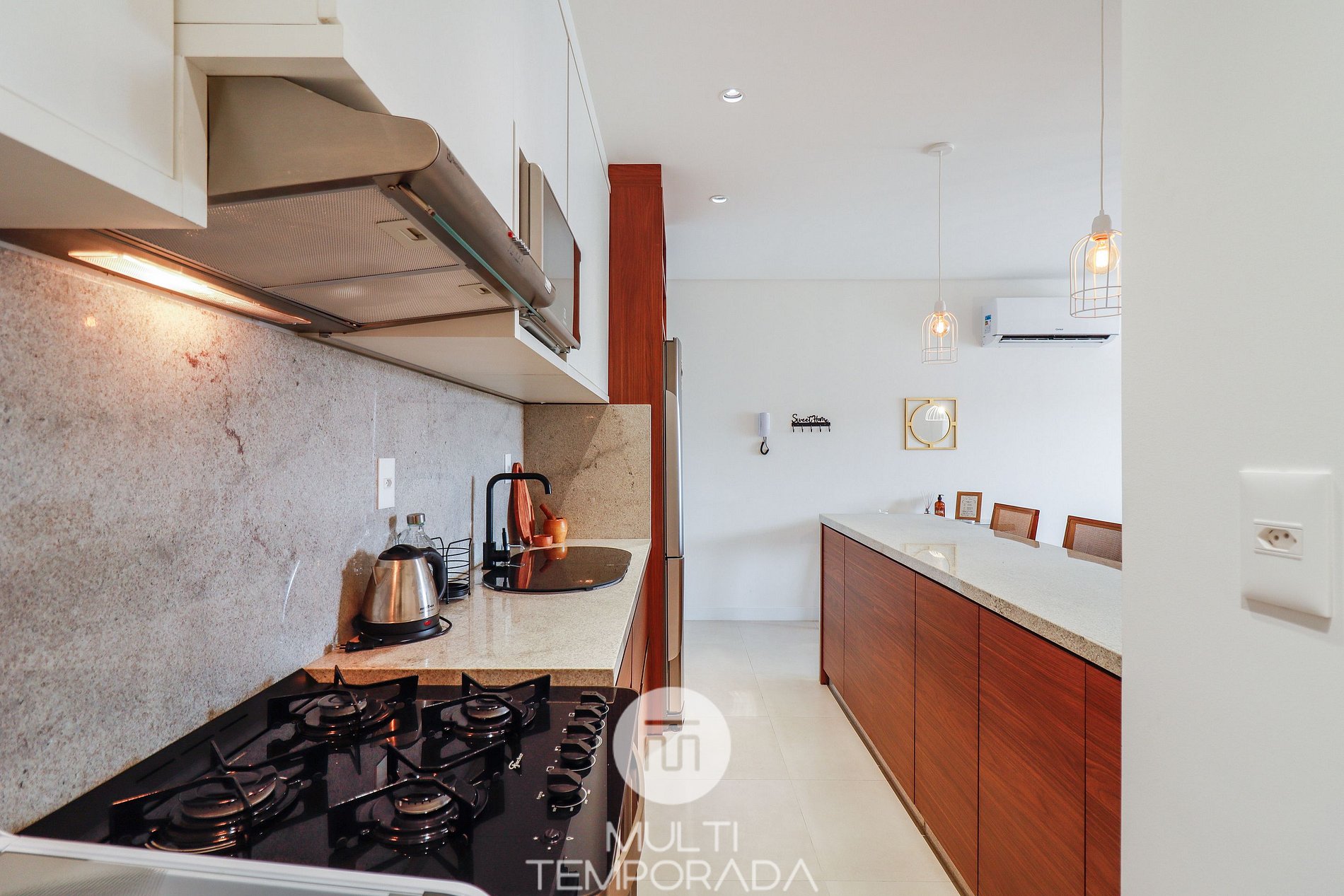 Beautiful apartment, 200 meters from the beach, consisting of two suites, one with a double bed, a single bed and air conditioning, and the other with two single beds and air conditioning, social bathroom, balcony with barbecue and sink, full kitchen, service area with washing machine. It has a parking space, has wi-fi and cable TV.