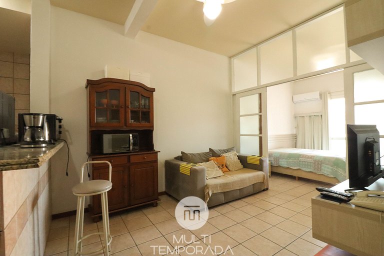 Suite Apartment - 1 bedroom with double bed, air conditioning, 1 living room with two environments, one with a sofa bed and the other with a double bed, full American kitchen, 1 bathroom and balcony with barbecue