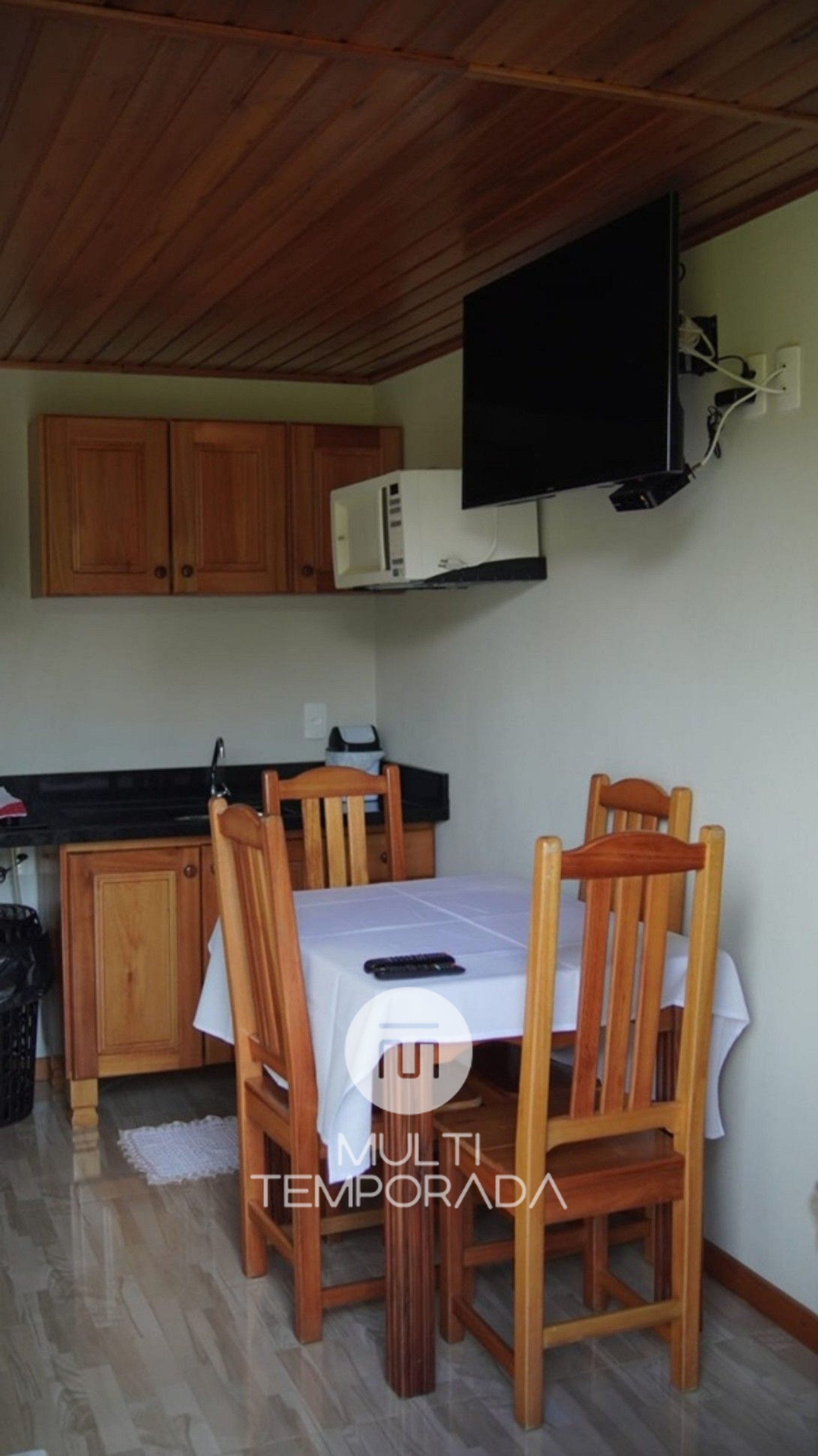 En los días fríos de montaña, el ambiente se mantiene acogedor gracias al aire acondicionado frío/calor. La cocina está totalmente equipada con estufa, refrigerador, horno, microondas, vajilla y cubiertos, lo que garantiza comodidad e independencia para preparar comidas en su propio chalet.