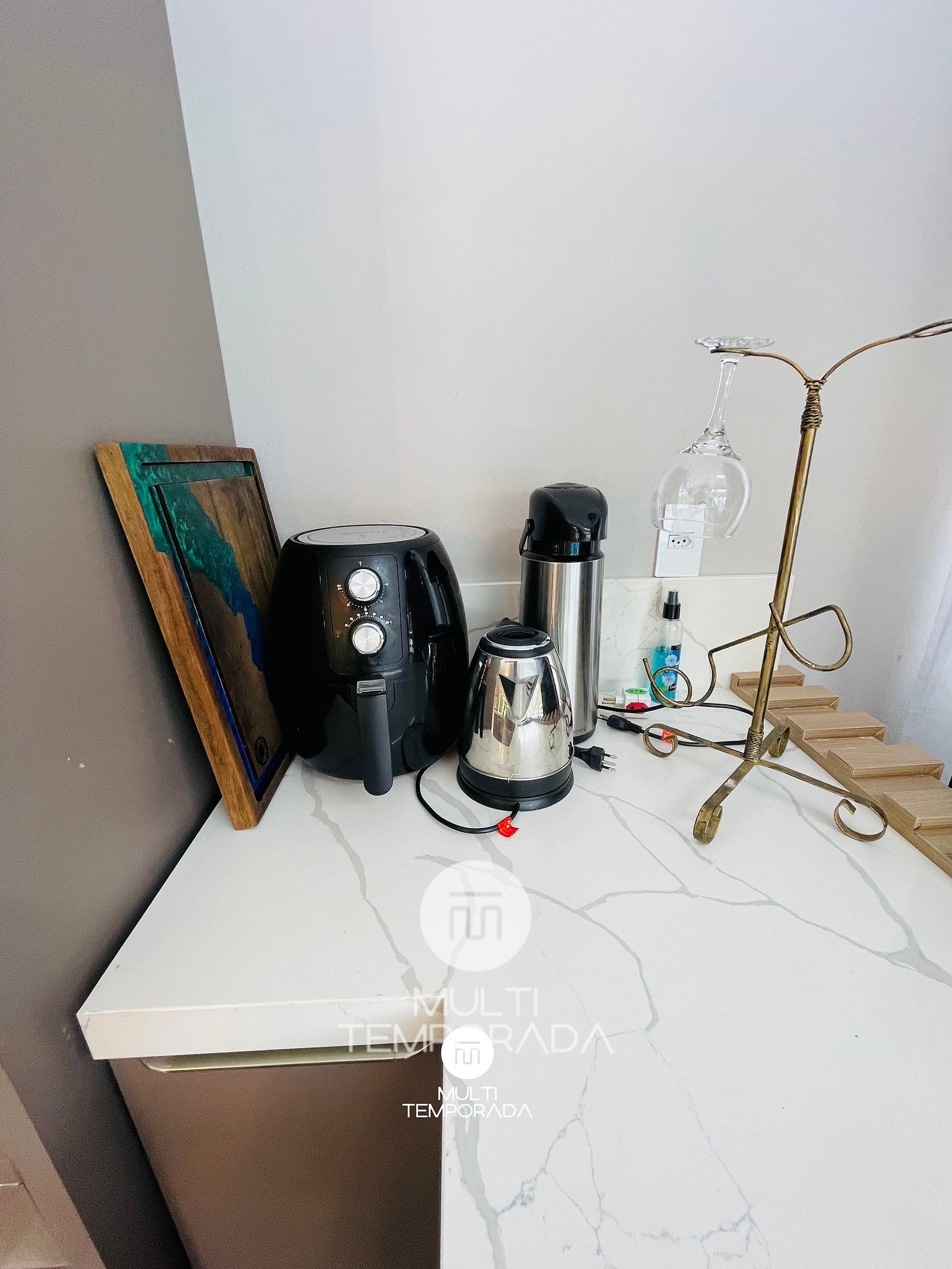 Además, la cocina ofrece utensilios completos: ollas, sartenes, fuentes, platos, vasos surtidos, cubiertos, recipientes, tablas de cortar, paños de cocina, freidora de aire, sandwichera, licuadora, batidora, termo y fondue.