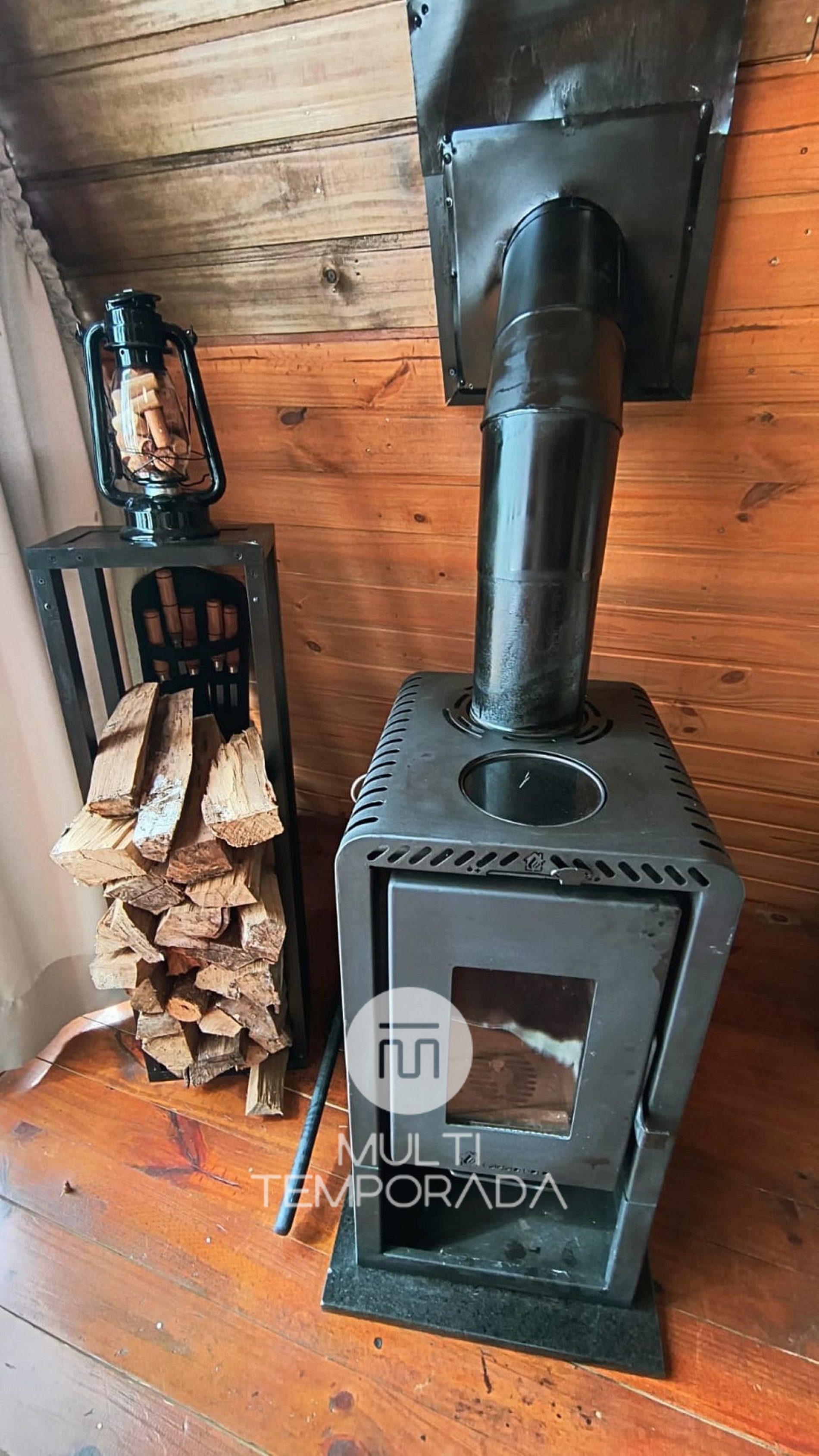 La cabaña, de 35 m² más terraza, cuenta con dos dormitorios con camas dobles, un sofá cama doble en el salón, estufa de leña, balcón, sala de estar y cocina.
