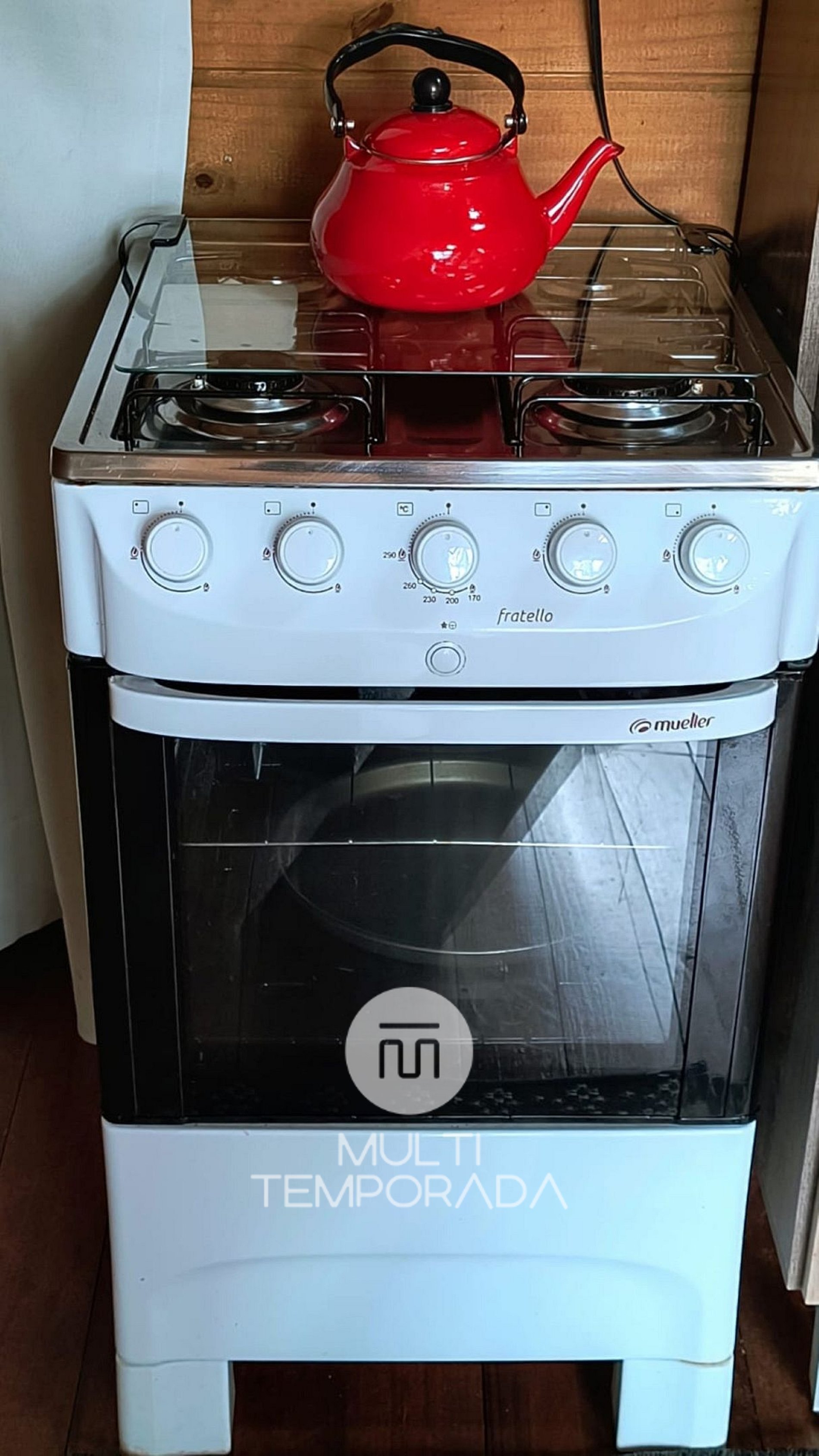 Cocina totalmente equipada: estufa, refrigerador, microondas, horno de gas, sandwichera, hervidor, vajilla, cubertería y copas de vino.