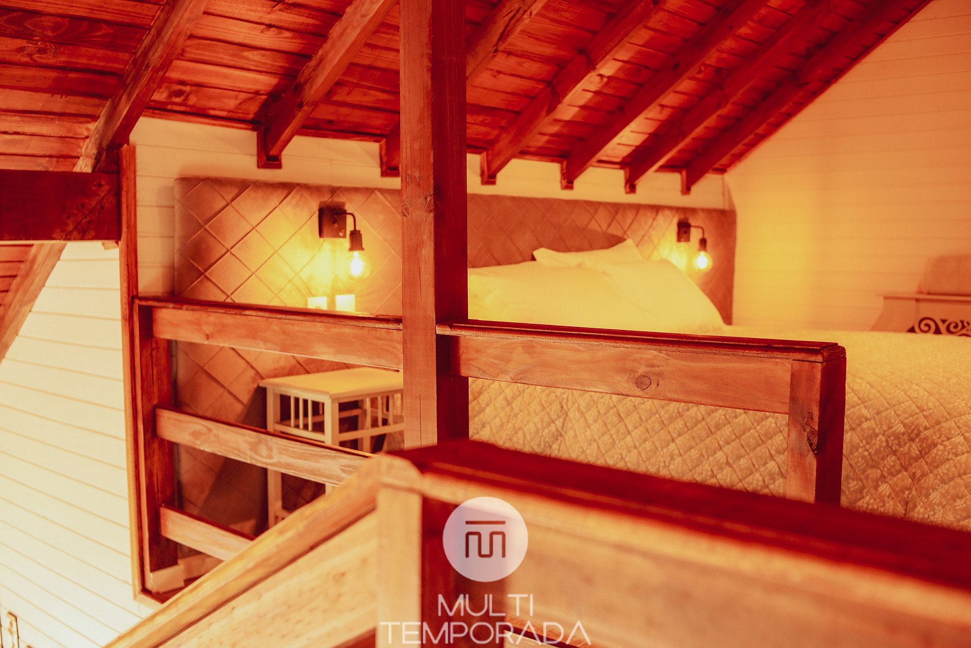 La cabaña 3 tiene 60 m² y cuenta con 2 dormitorios, 1 entrepiso, sala, balcón, sala de estar y cocina.