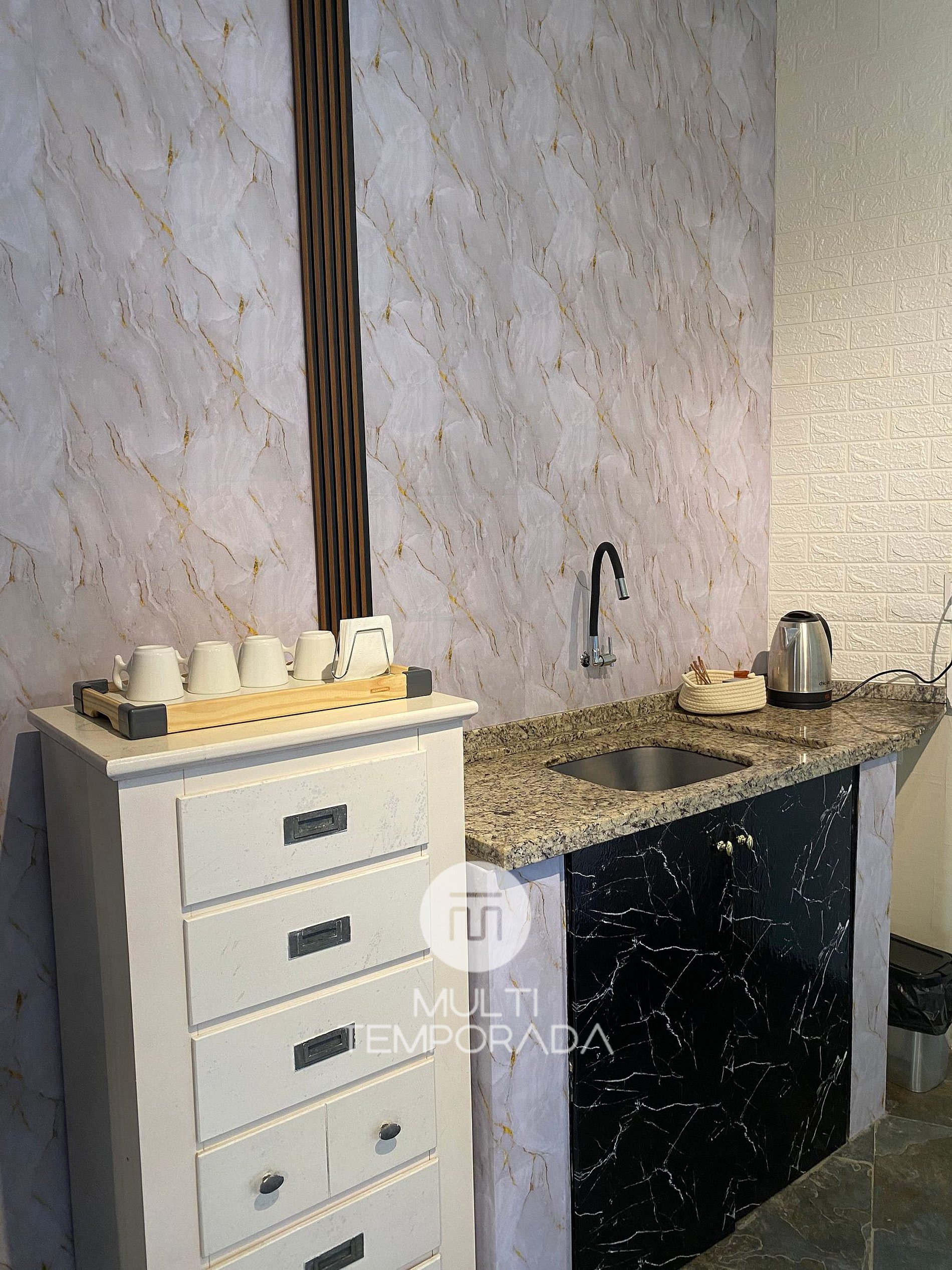 Cocina compacta: Dispone de fregadero y un comedor sencillo con hervidor eléctrico, vasos, tazas y cafetera.