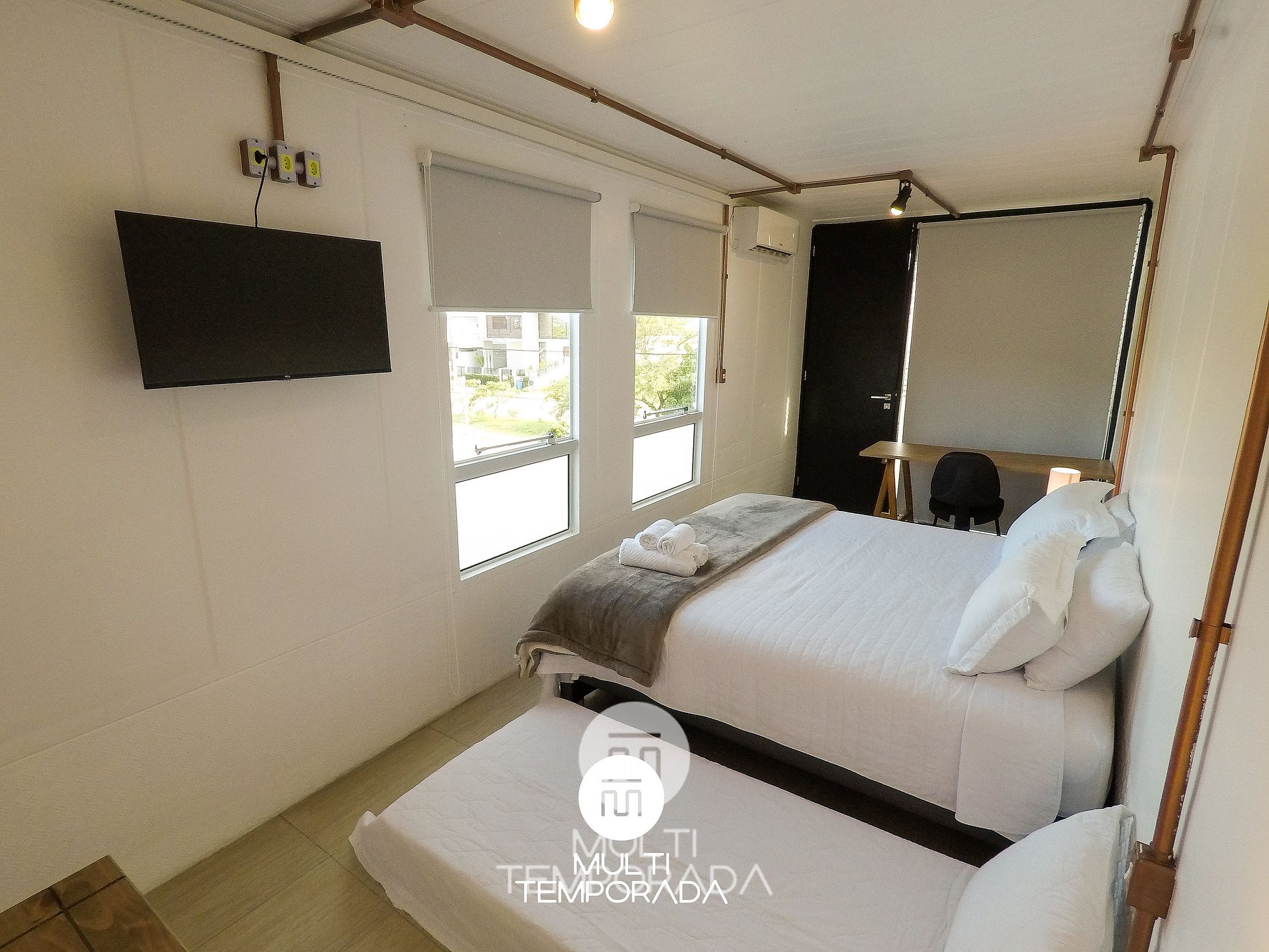 Comodidades de la unidad: Aire acondicionado frío/calor, Smart TV de 32" y una cocina compacta equipada con minibar, hervidor eléctrico, cafetera, mesa, silla y utensilios básicos.