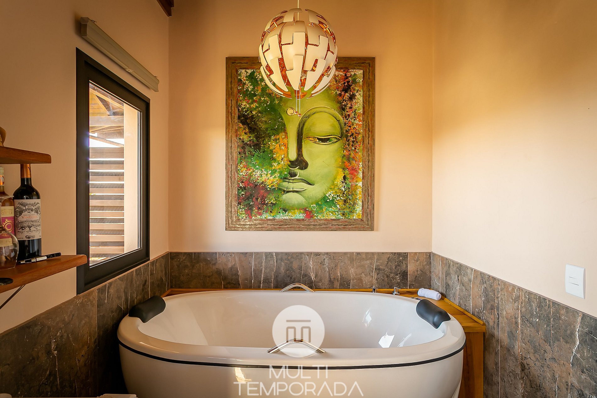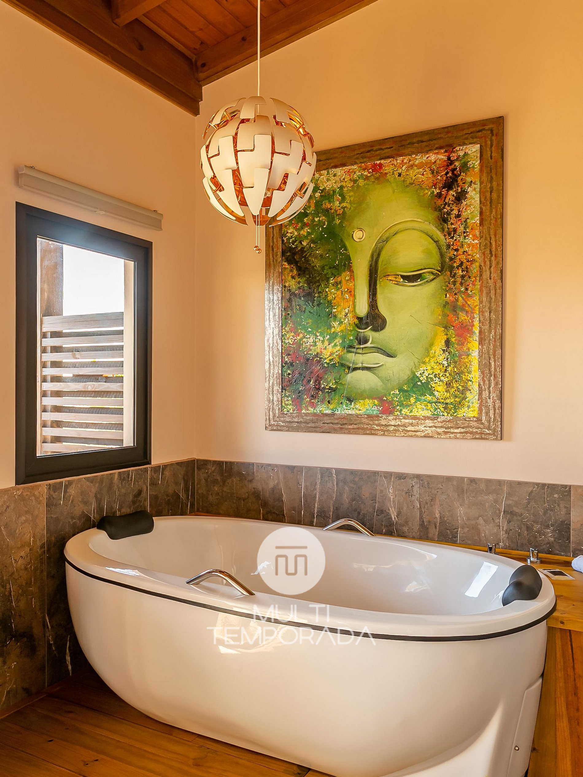 Ambiente zen, inspirado en el budismo y el hinduismo, con un hermoso jardín perfecto para relajarse, terraza panorámica con una vista privilegiada de la puesta del sol y elementos decorativos importados de Indonesia.