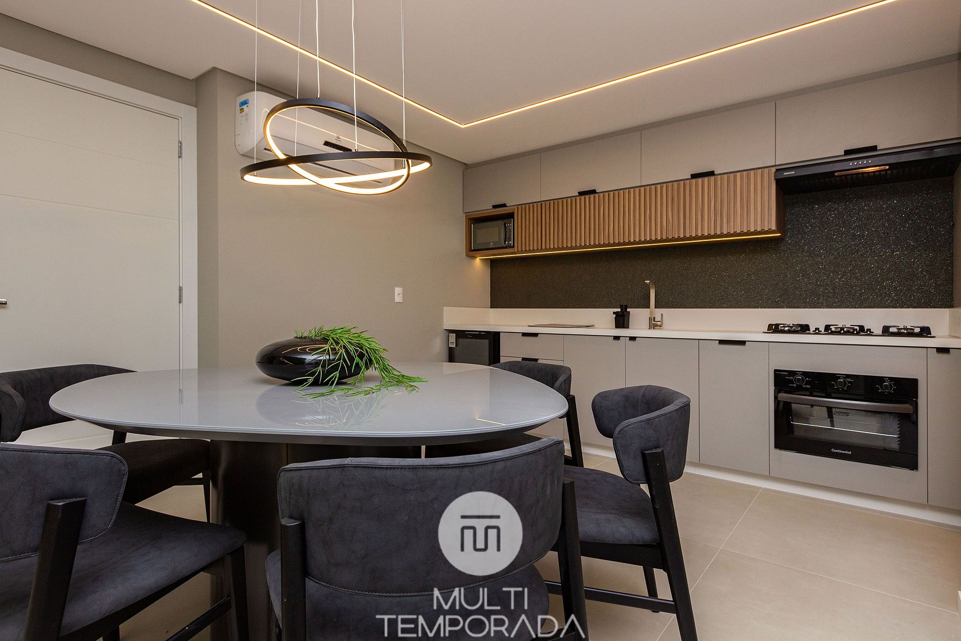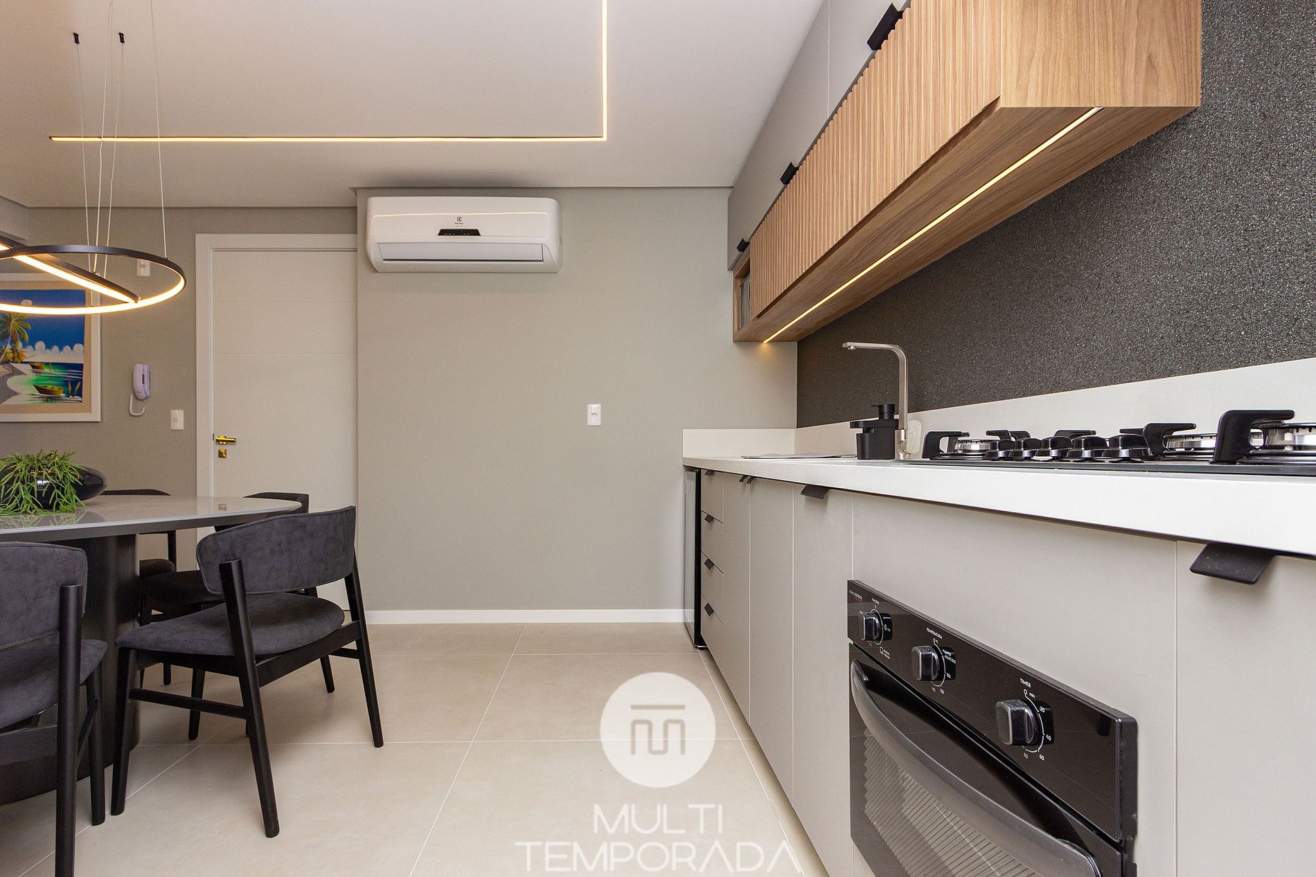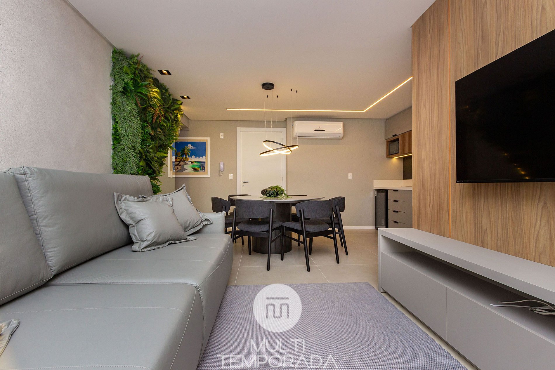 - Ambientes integrados y climatizados, que incluyen comedor, sala de estar y cocina totalmente equipada.