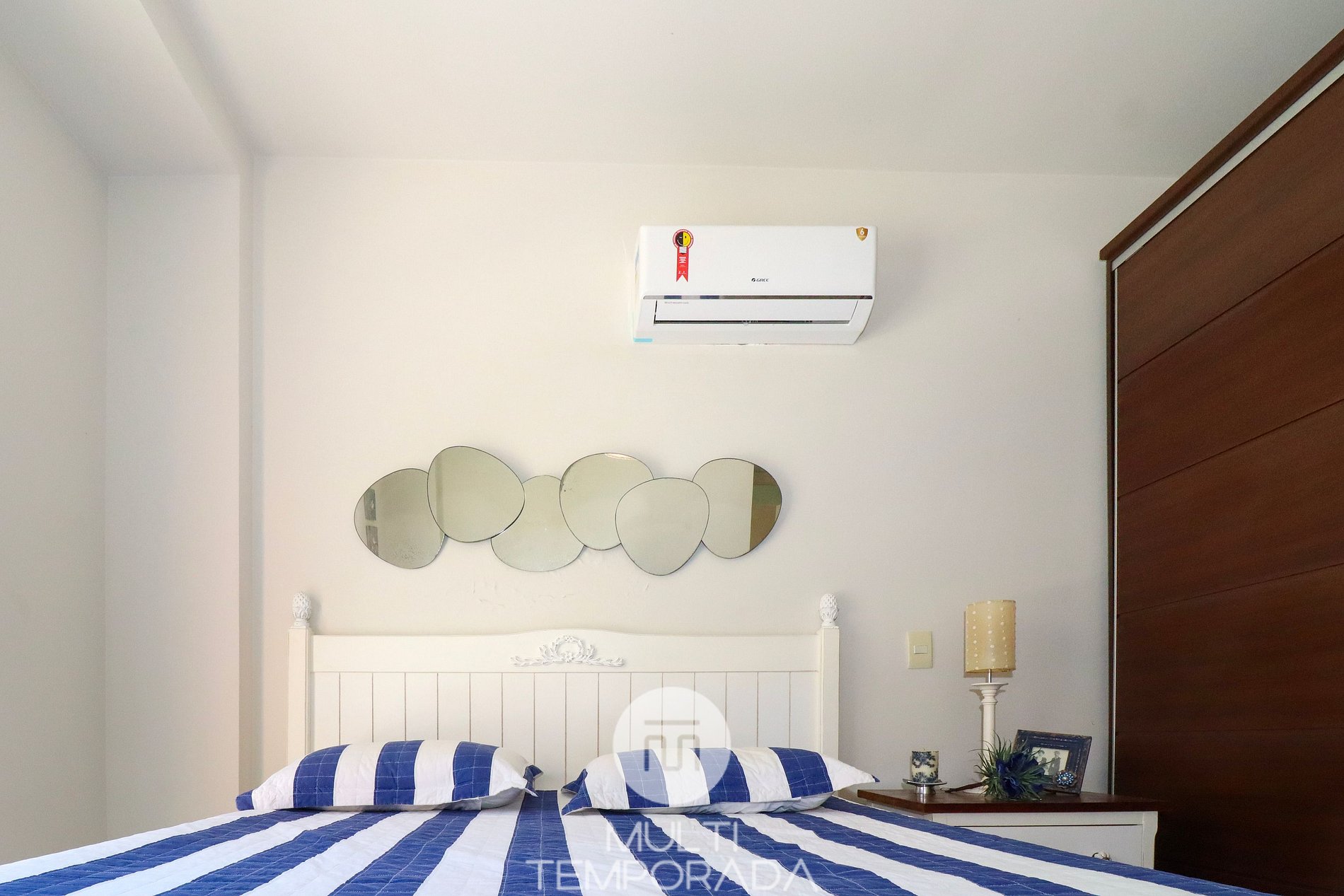 Hermoso apartamento a 100 metros de la playa, que consta de dos habitaciones, una suite con cama matrimonial y aire acondicionado, una habitación con dos camas individuales y aire acondicionado, baño de visita, balcón con vista a la piscina, cocina completa, área con lavadora. Tiene un puesto de estacionamiento, cuenta con Wi-Fi, sin tv a cable.