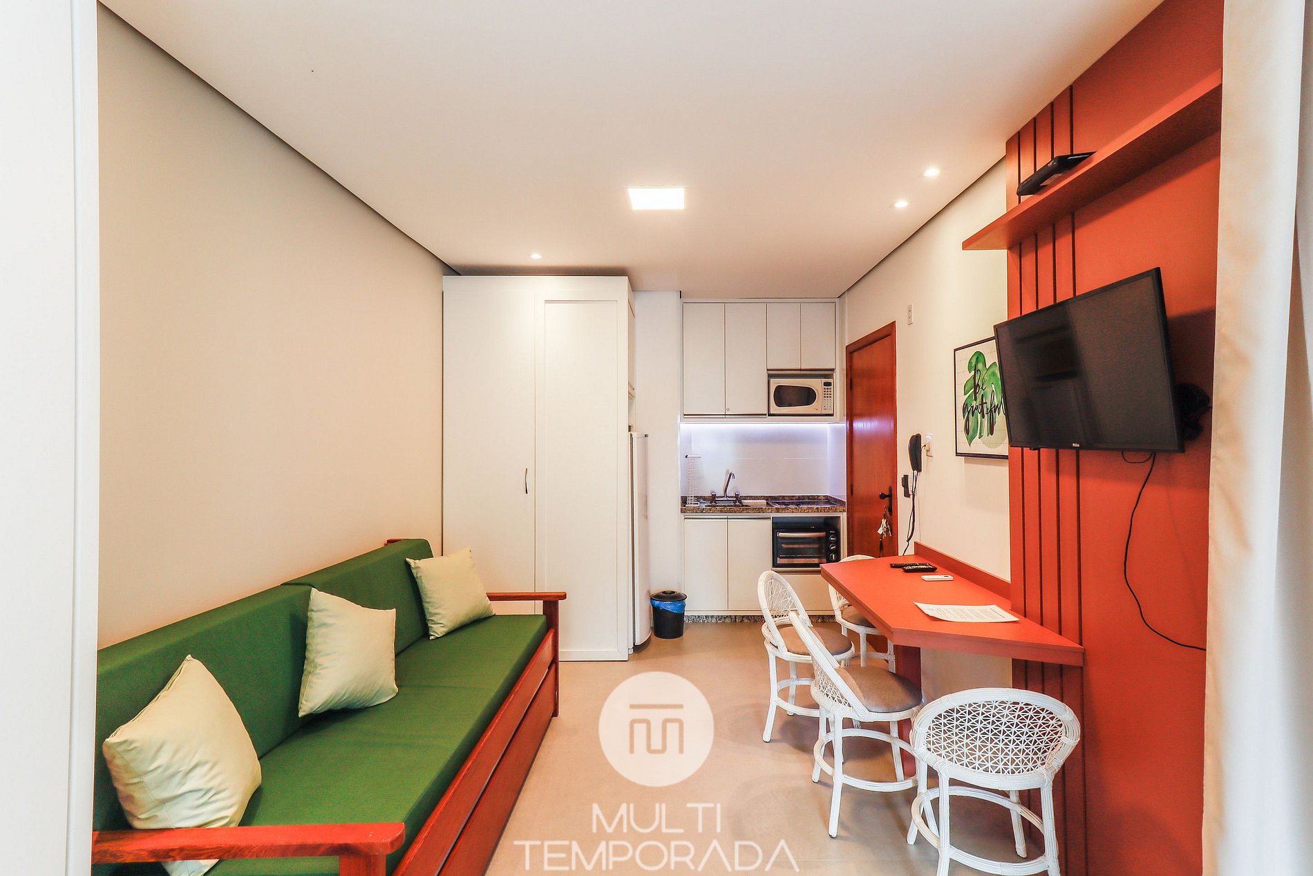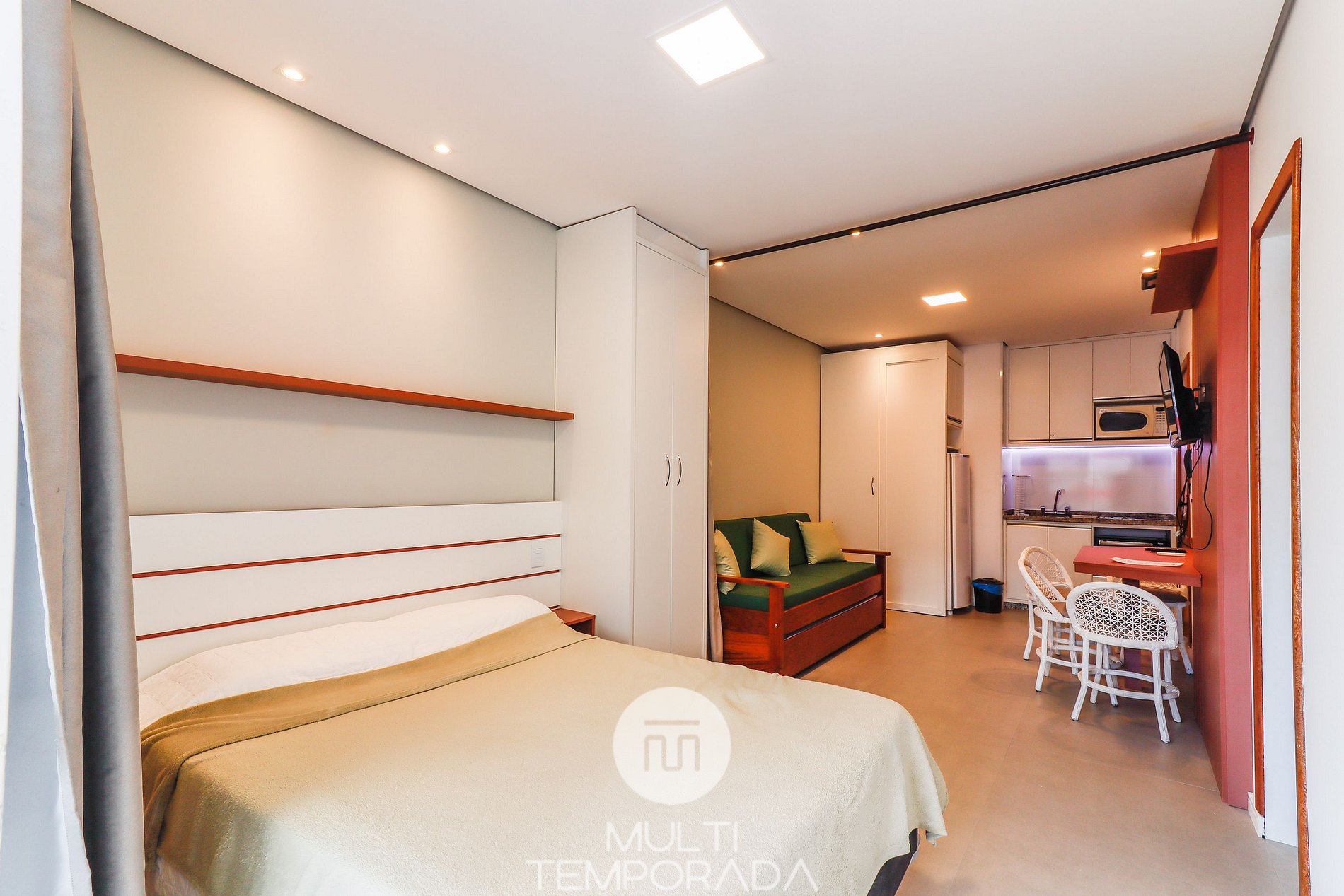 Apartamento de lujo - 01 dormitorio con cama doble, aire acondicionado, sala de estar con dos camas, SmartTV y cocina (nevera, microondas, horno, cocina eléctrica y elementos básicos de cocina), 1 baño y balcón.