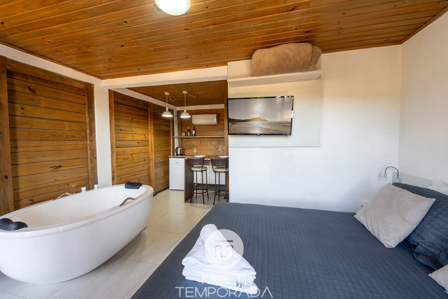 As Suítes Deluxe com banheira, localizadas em primeiro piso, possuem 18m². Contam com cama de casal, banheira de imersão privativa, TV Smart 32'', armário, garantindo maior praticidade e bem-estar aos hóspedes;