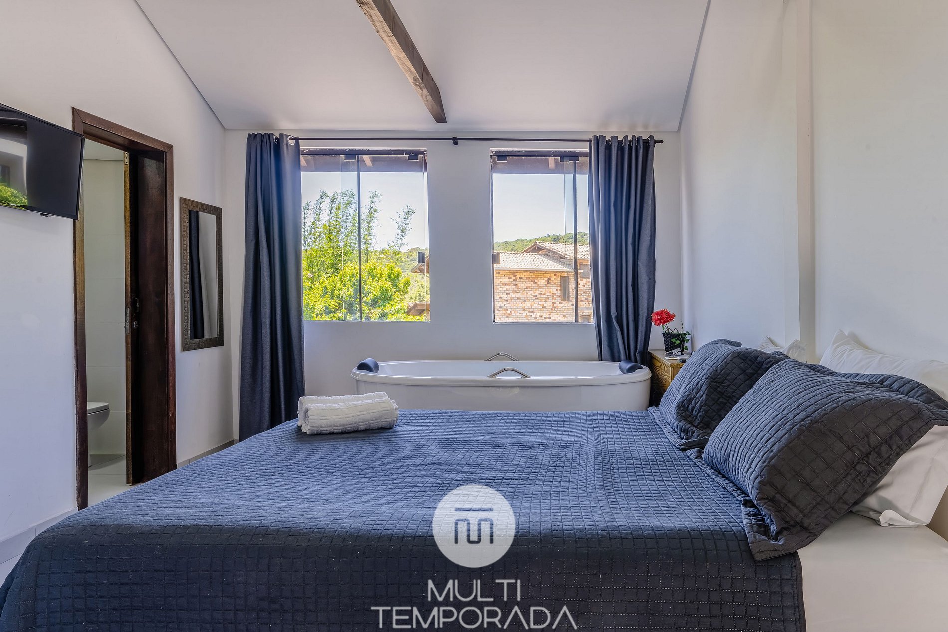 A Suíte Master com Banheira (Nº12) localizada em piso térreo, possui 18m². Conta com cama Queen-Size, banheira de imersão, TV Smart 32'', armário, garantindo maior praticidade e bem-estar aos hóspedes;