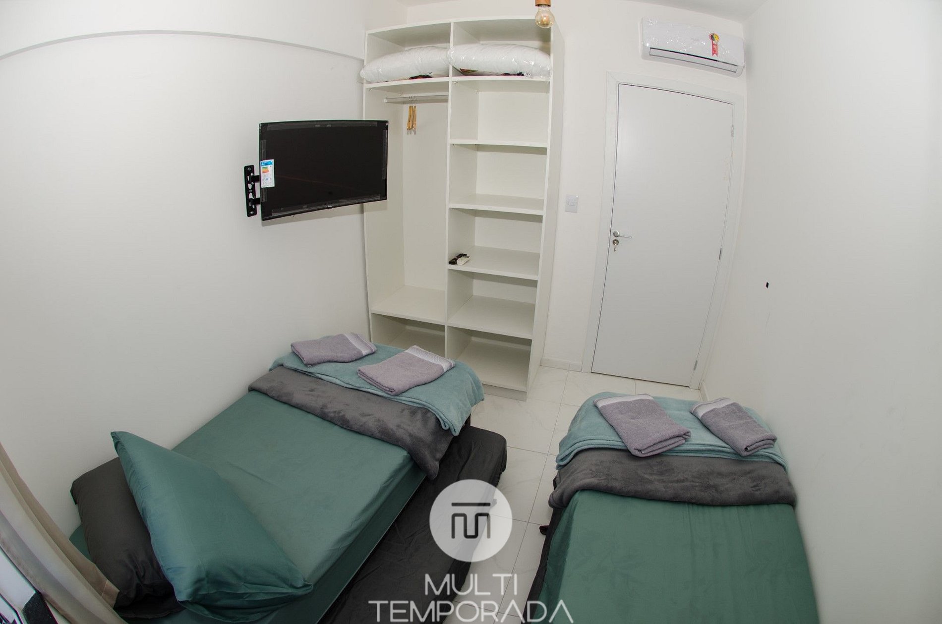 Um quarto possui cama de casal, TV Smart 32'' e Ar-condicionado. O segundo quarto possui duas camas de solteiro com auxiliar, TV Smart 32'' e Ar-condicionado. Capacidade para 6 pessoas. Fornecemos rouparia de cama completa com travesseiros e cobertores e rouparia de banho; Possuímos Wi-Fi no apartamento (200 mega), máquina de lavar e ventilador;