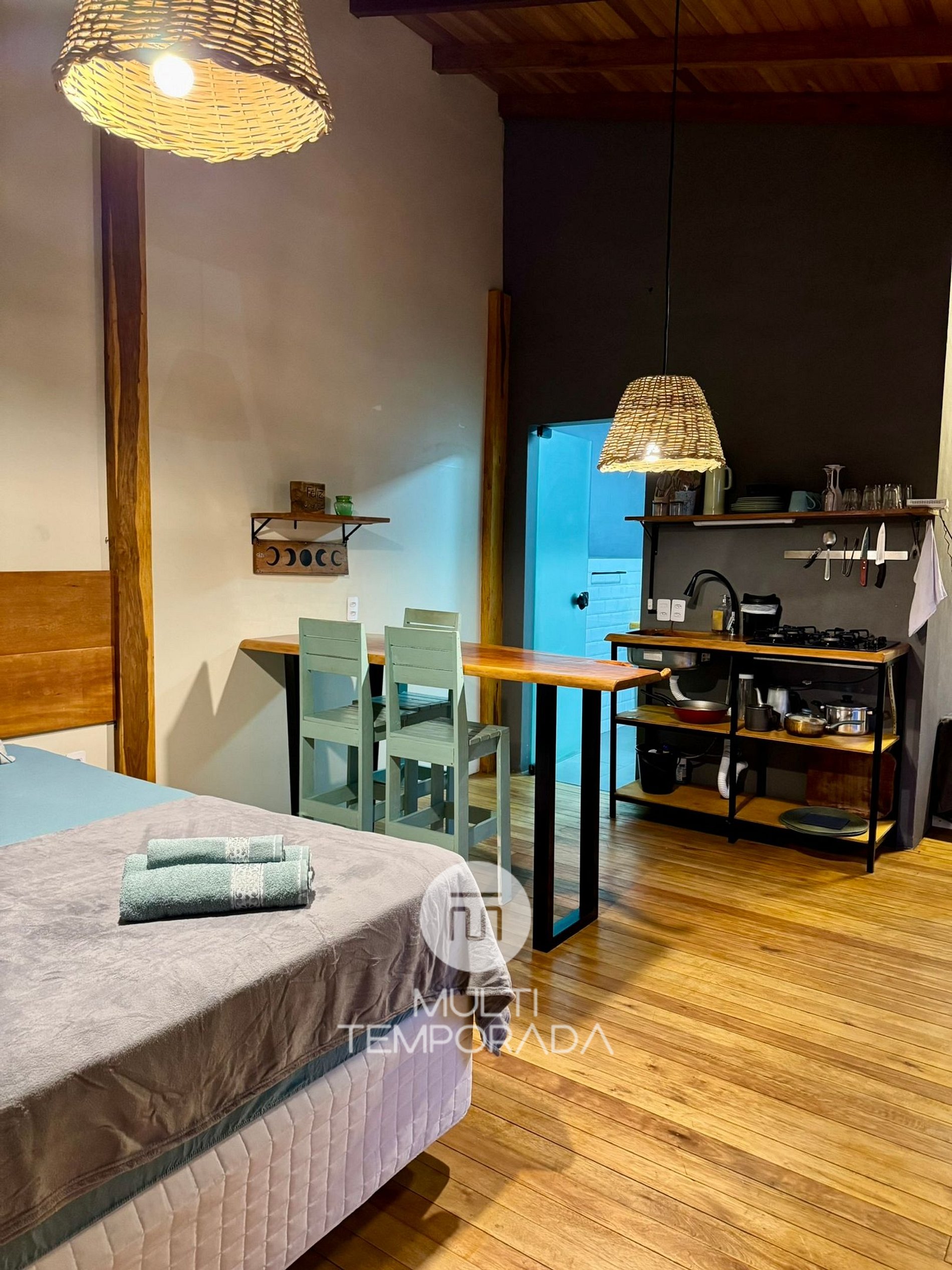 A cozinha é prática e bem equipada, oferecendo tudo o que você precisa para preparar suas refeições com autonomia: fogão, frigobar, airfryer, jarra elétrica, panelas, pratos, copos e talheres. Há também itens extras, como térmica, bule, tábua de carne e faca de corte, que tornam o ambiente ainda mais funcional.