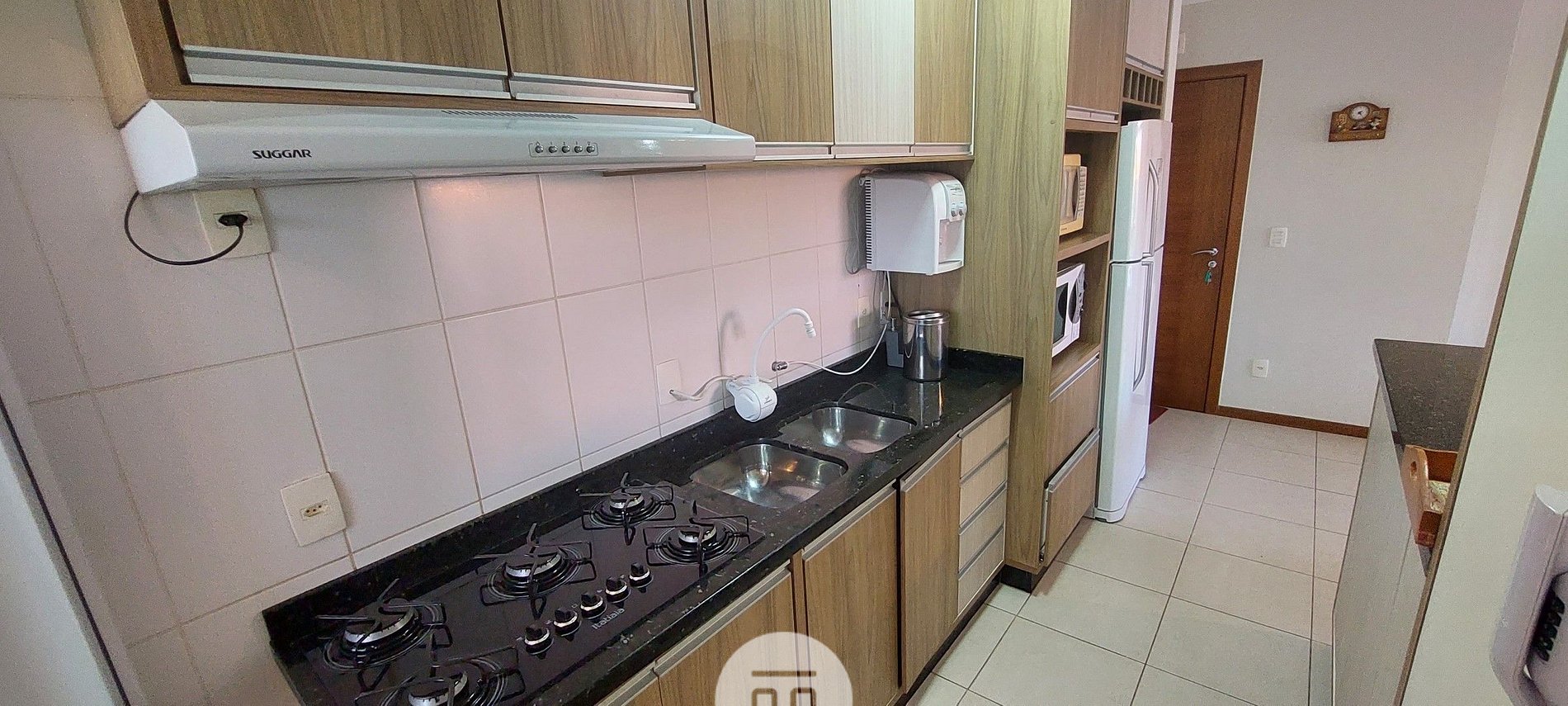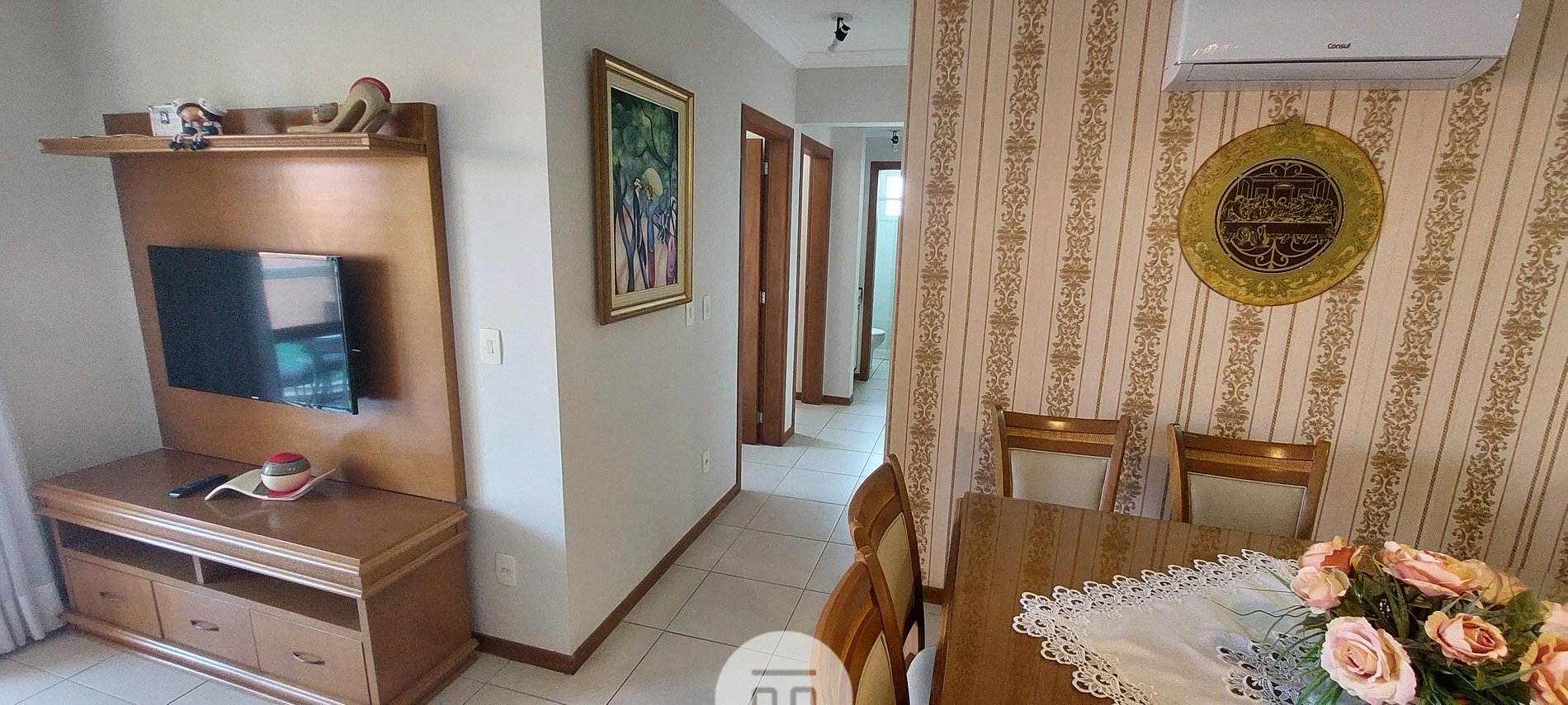 São 70 metros quadrados com sacada com churrasqueira, três quartos climatizados, sendo uma suíte, cozinha, sala integrada com ar-condicionado split também e banheiro social.