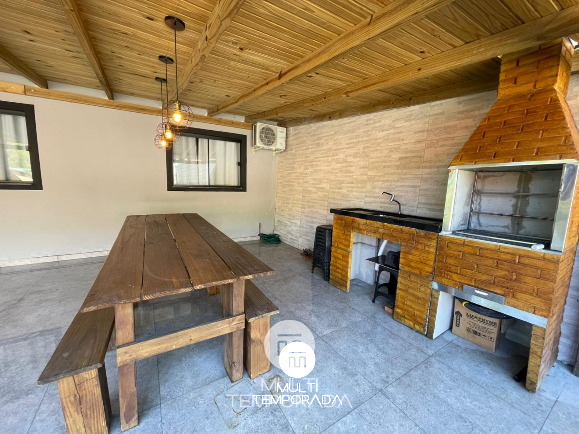 Na área externa, o Recanto Menegaz conta com churrasqueira com grelhas e espetos, varanda com pátio agradável e espaço aos fundos com máquina de lavar, garantindo praticidade durante a estadia.