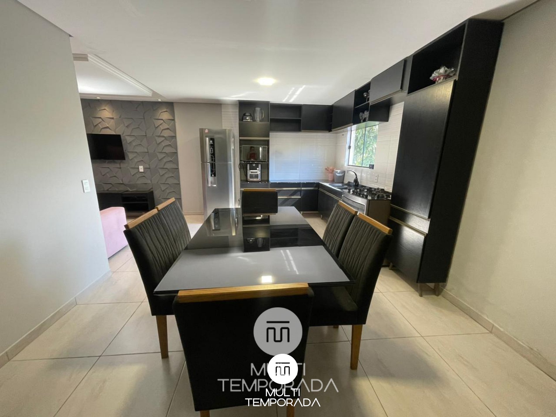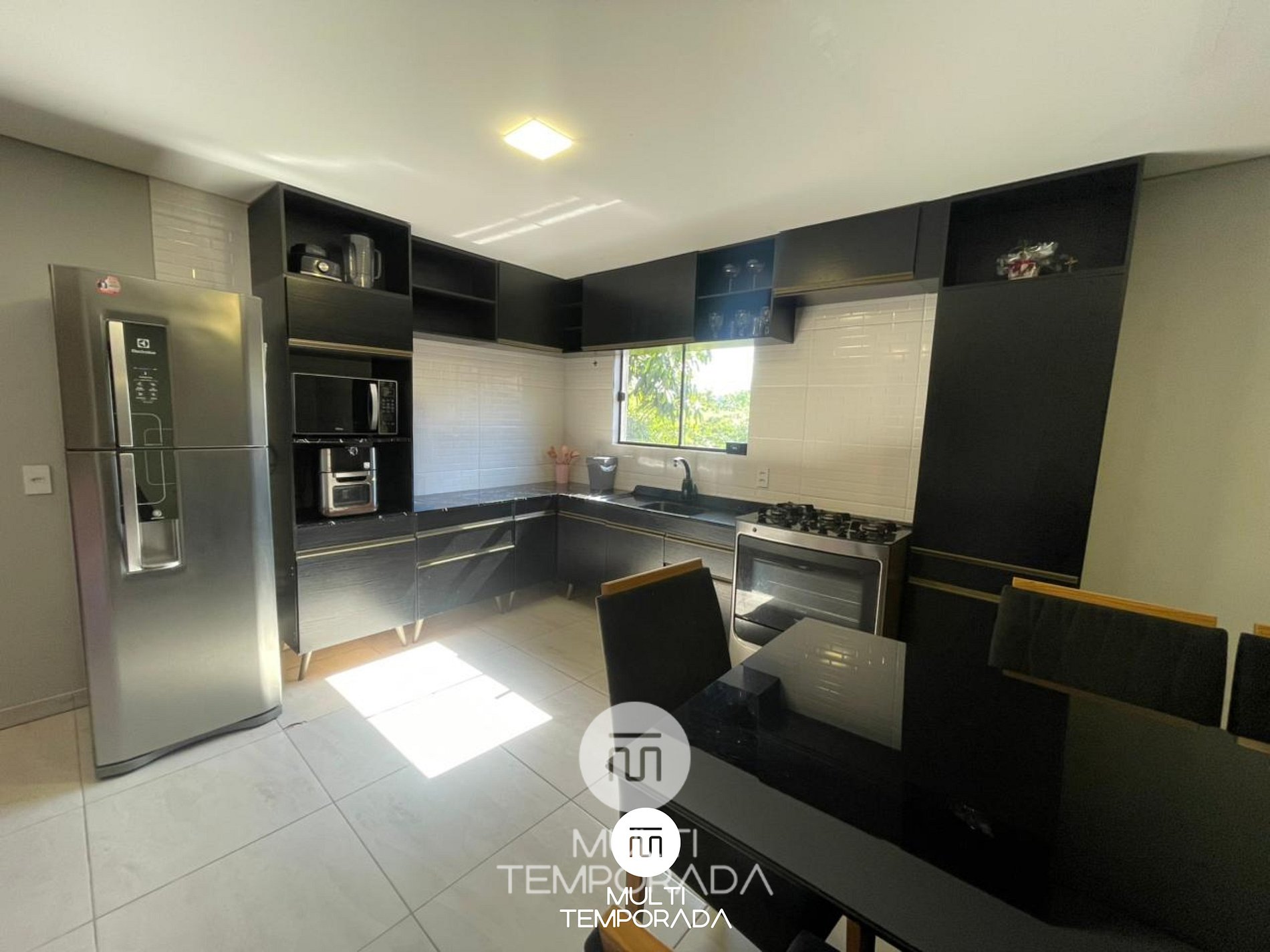 A cozinha é totalmente equipada com fogão, geladeira, micro-ondas, louças, talheres e utensílios completos, além de eletrodomésticos extras que trazem ainda mais praticidade: airfryer, sanduicheira, liquidificador, grill elétrico e panela de fondue.