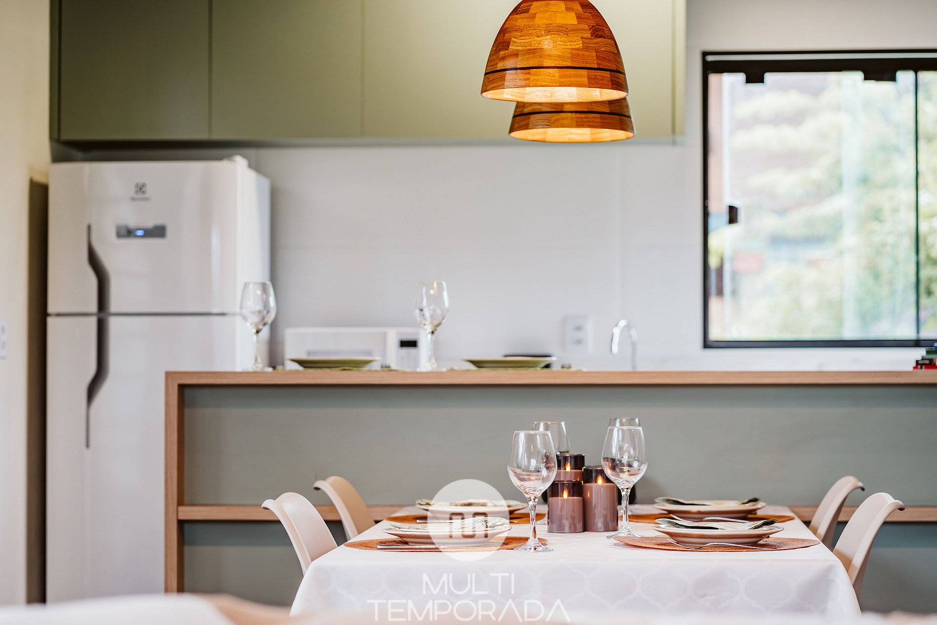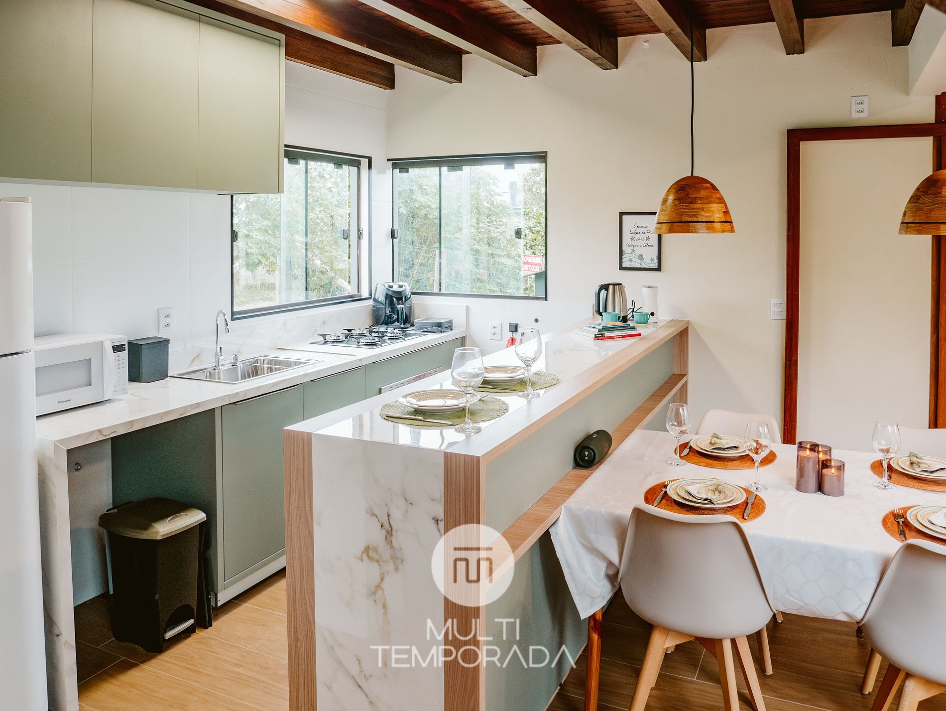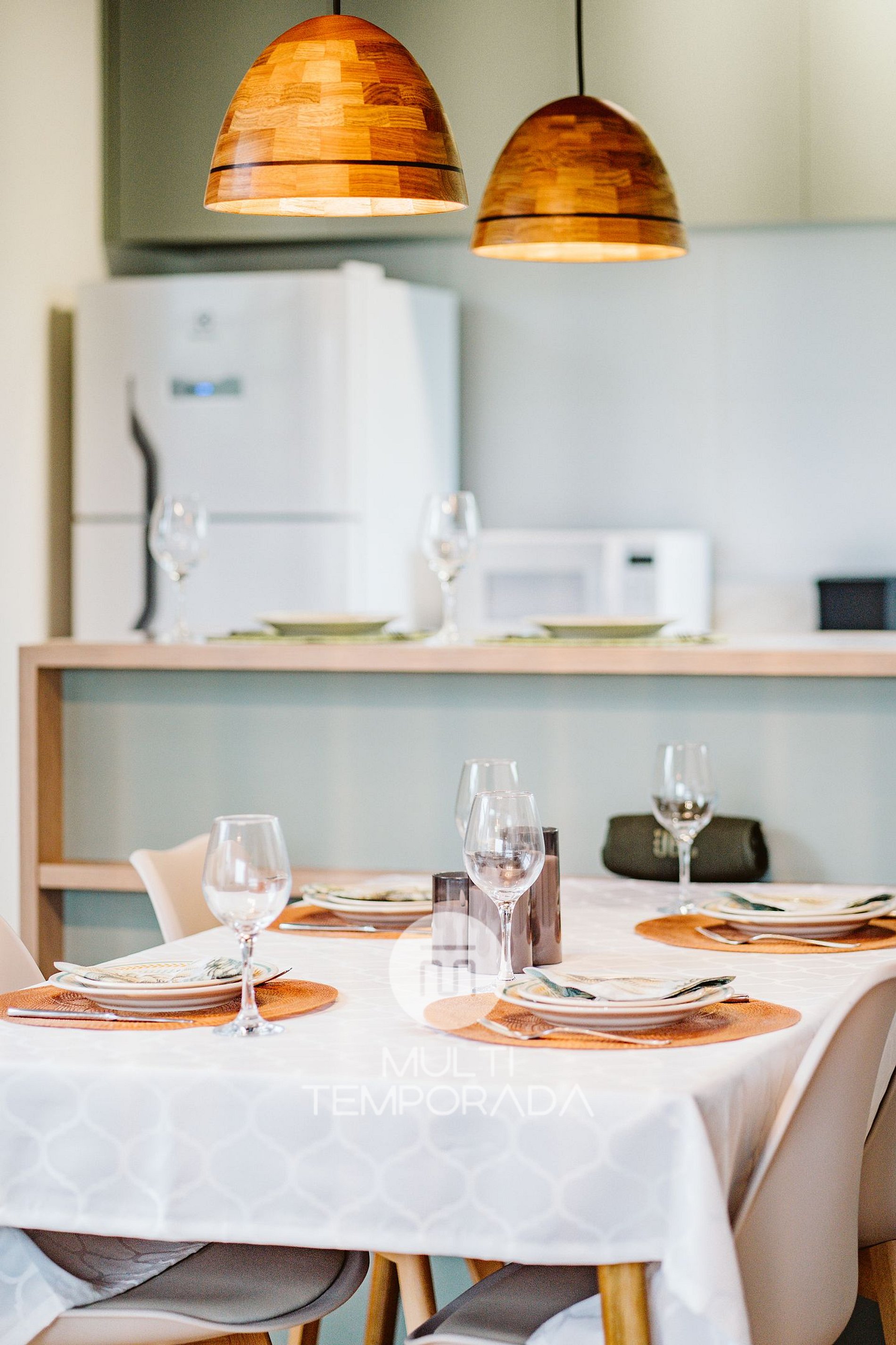 A cozinha planejada possui: geladeira, fogão cooktop, forno elétrico, micro-ondas, airfryer, torradeira, liquidificador, chaleira elétrica, louças e talheres, copos e taças de vinho e utensílios de cozinha completos.