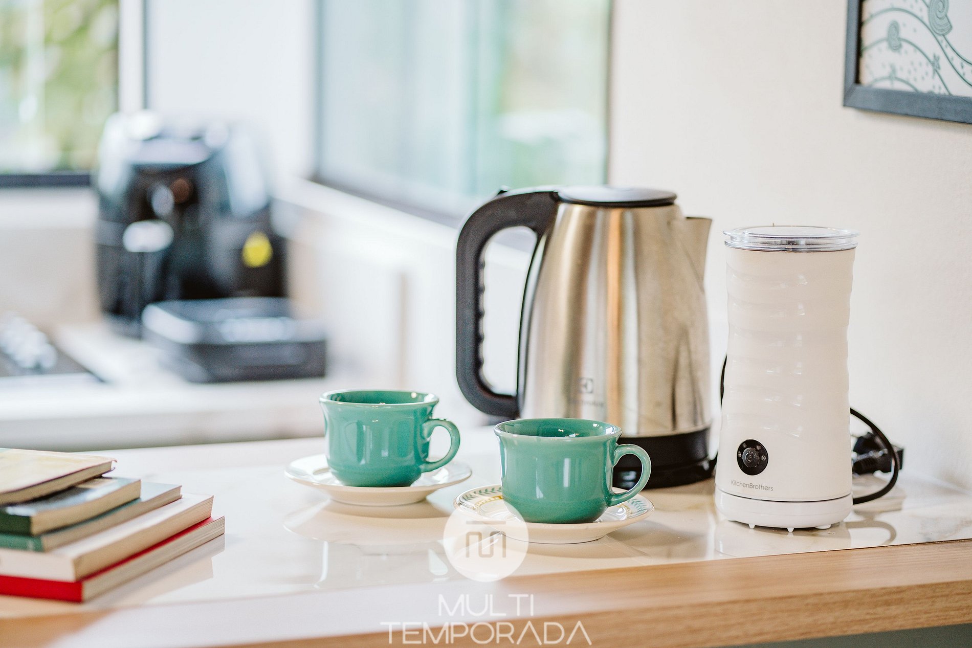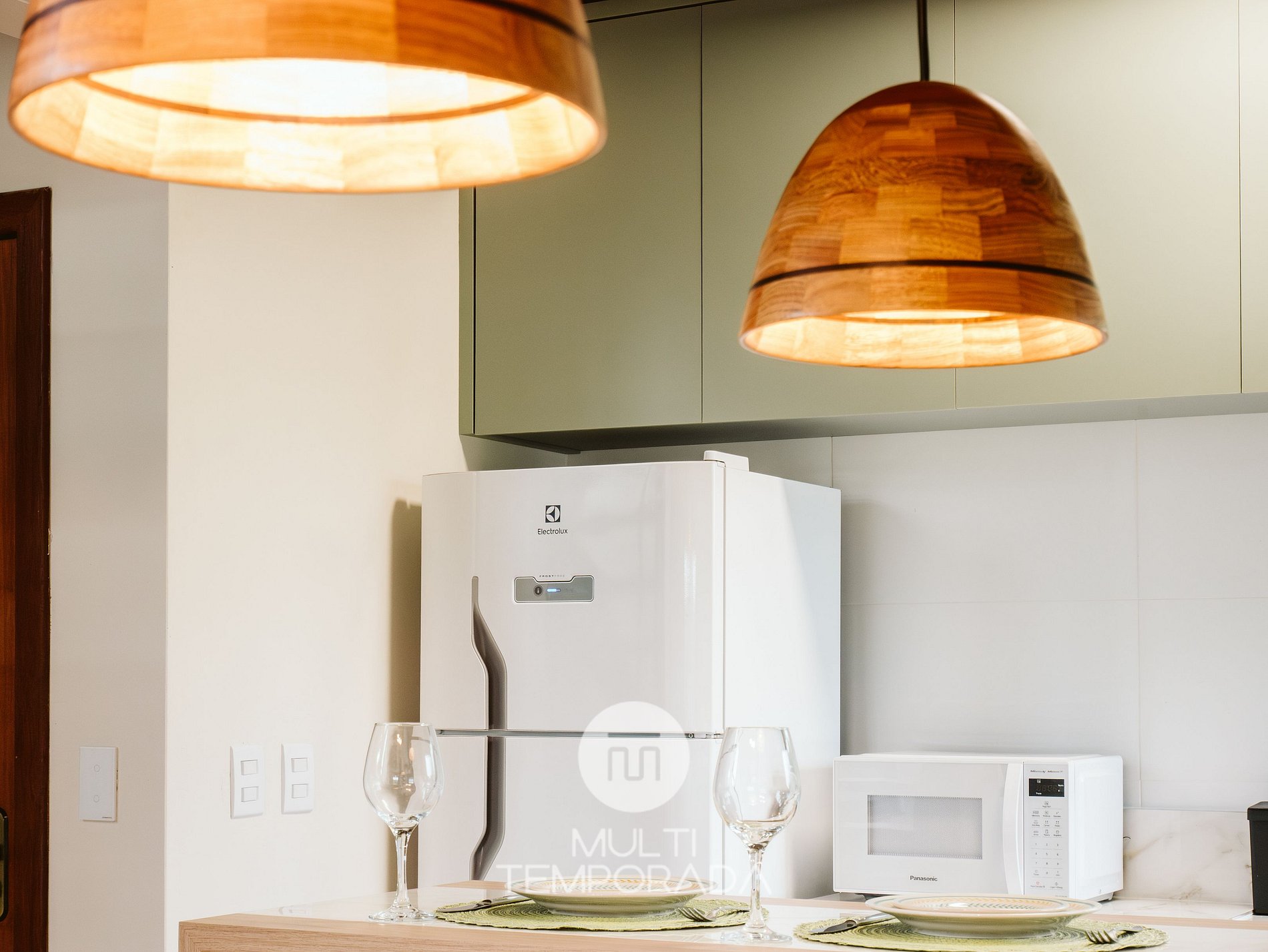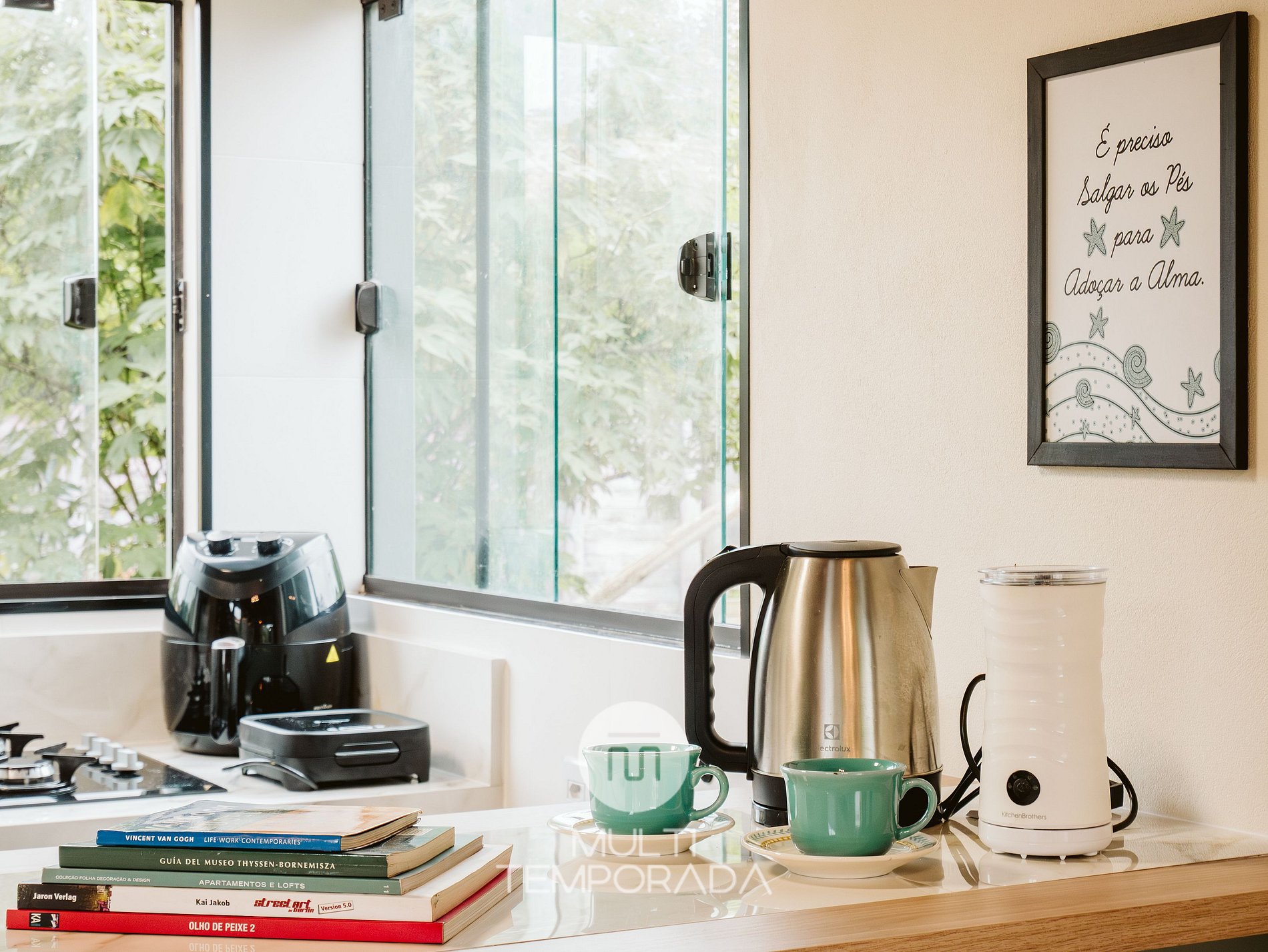 A cozinha planejada possui: geladeira, fogão cooktop, forno elétrico, micro-ondas, airfryer, torradeira, liquidificador, chaleira elétrica, louças e talheres, copos e taças de vinho e utensílios de cozinha completos.