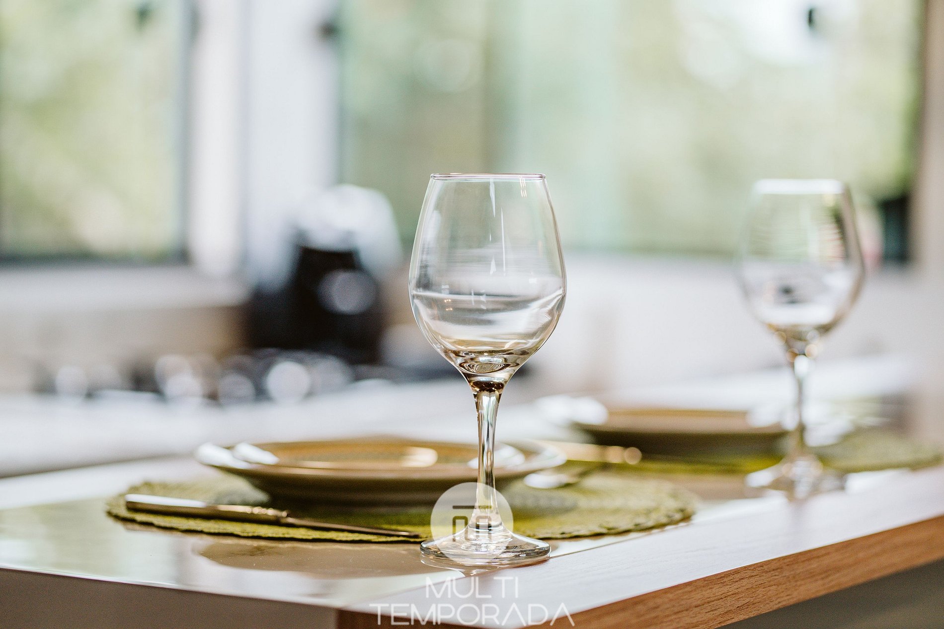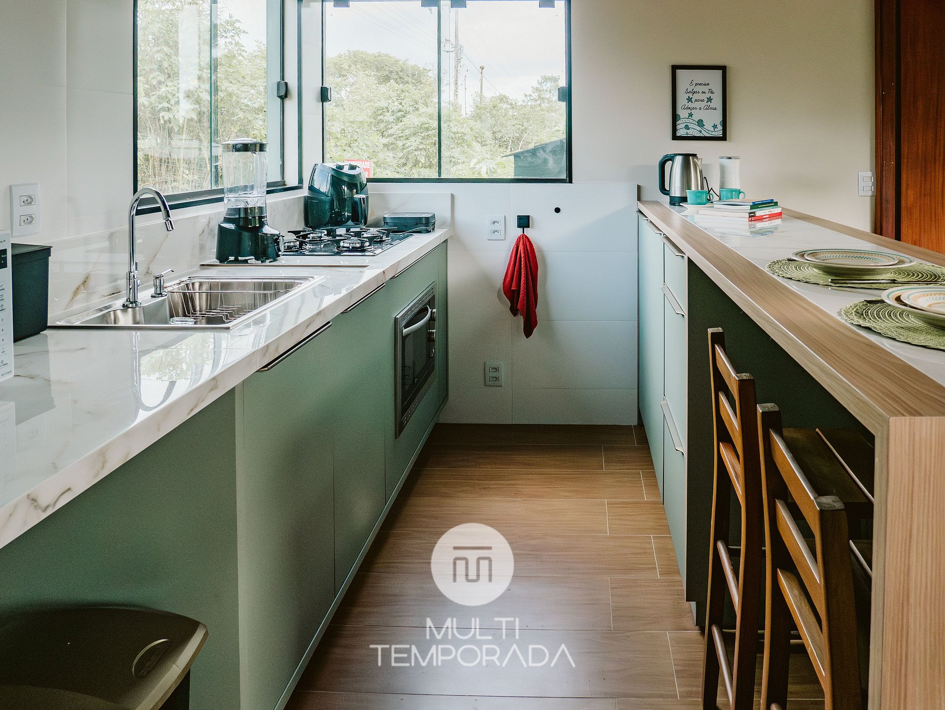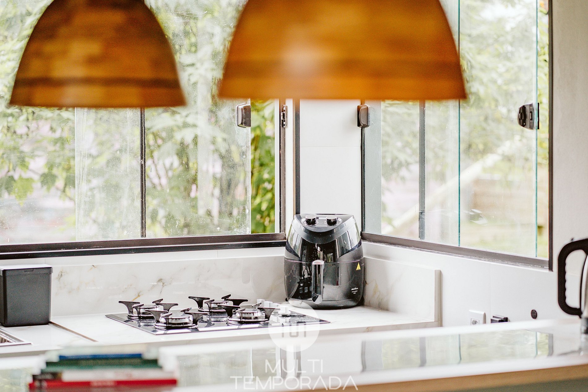 A cozinha planejada possui: geladeira, fogão cooktop, forno elétrico, micro-ondas, airfryer, torradeira, liquidificador, chaleira elétrica, louças e talheres, copos e taças de vinho e utensílios de cozinha completos.
