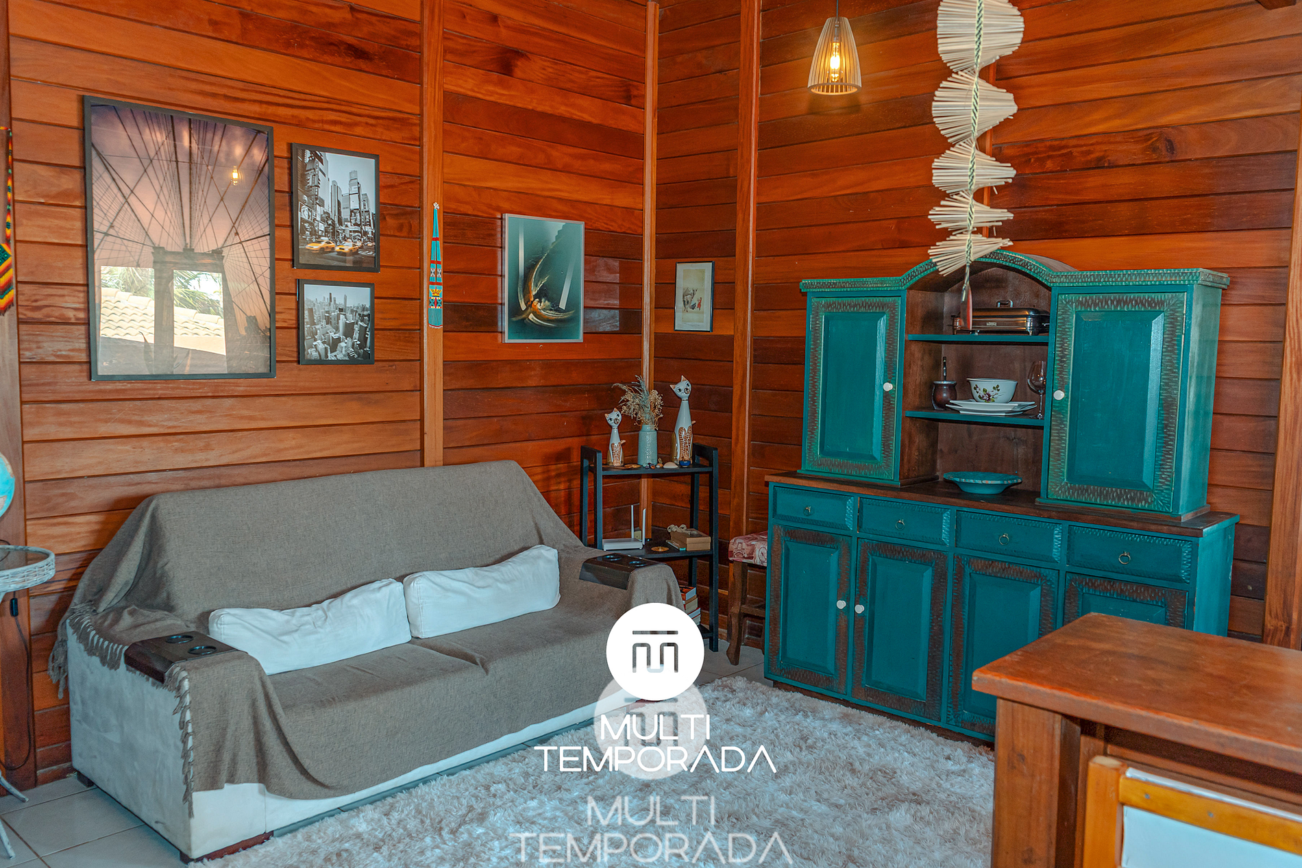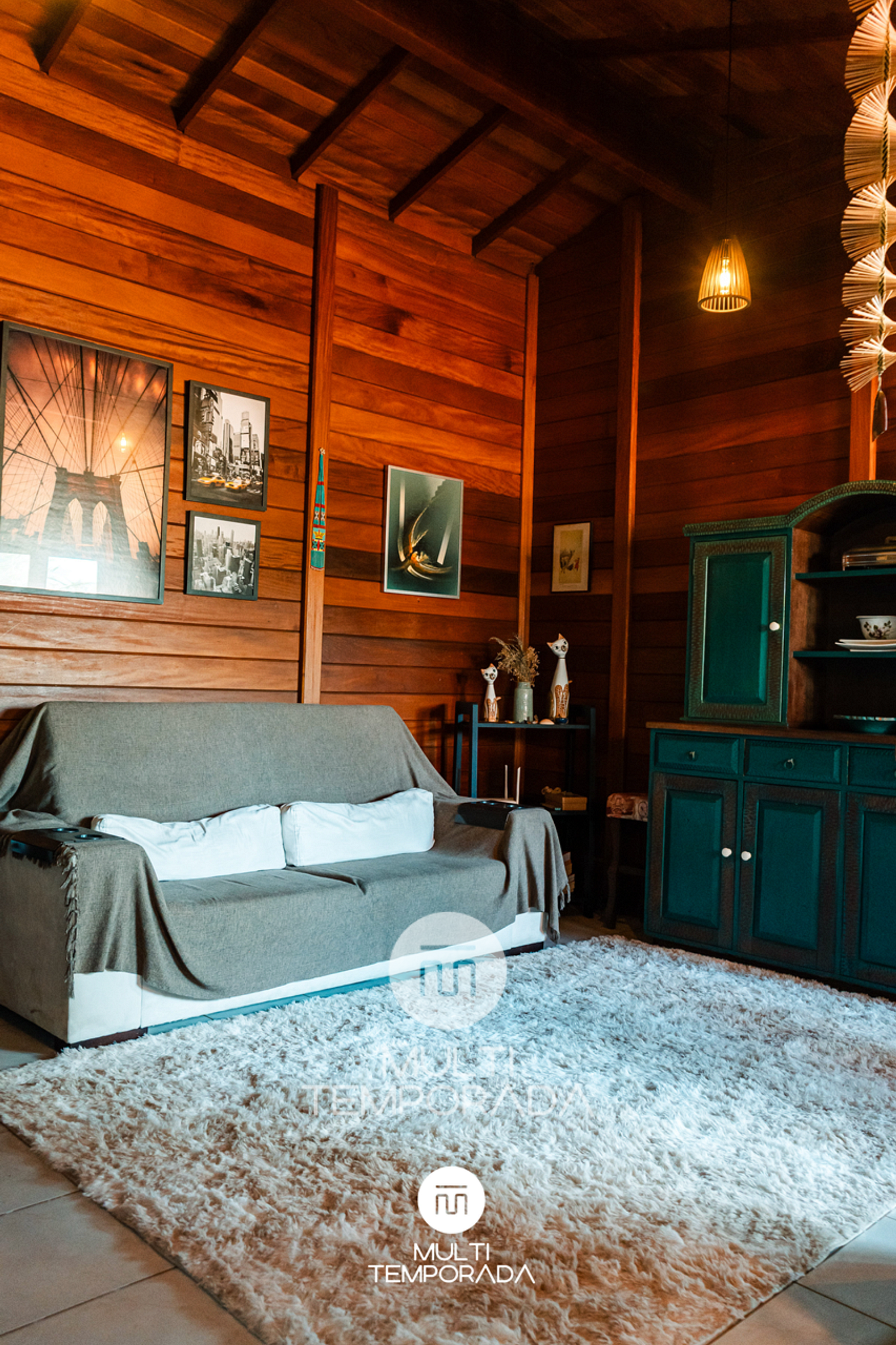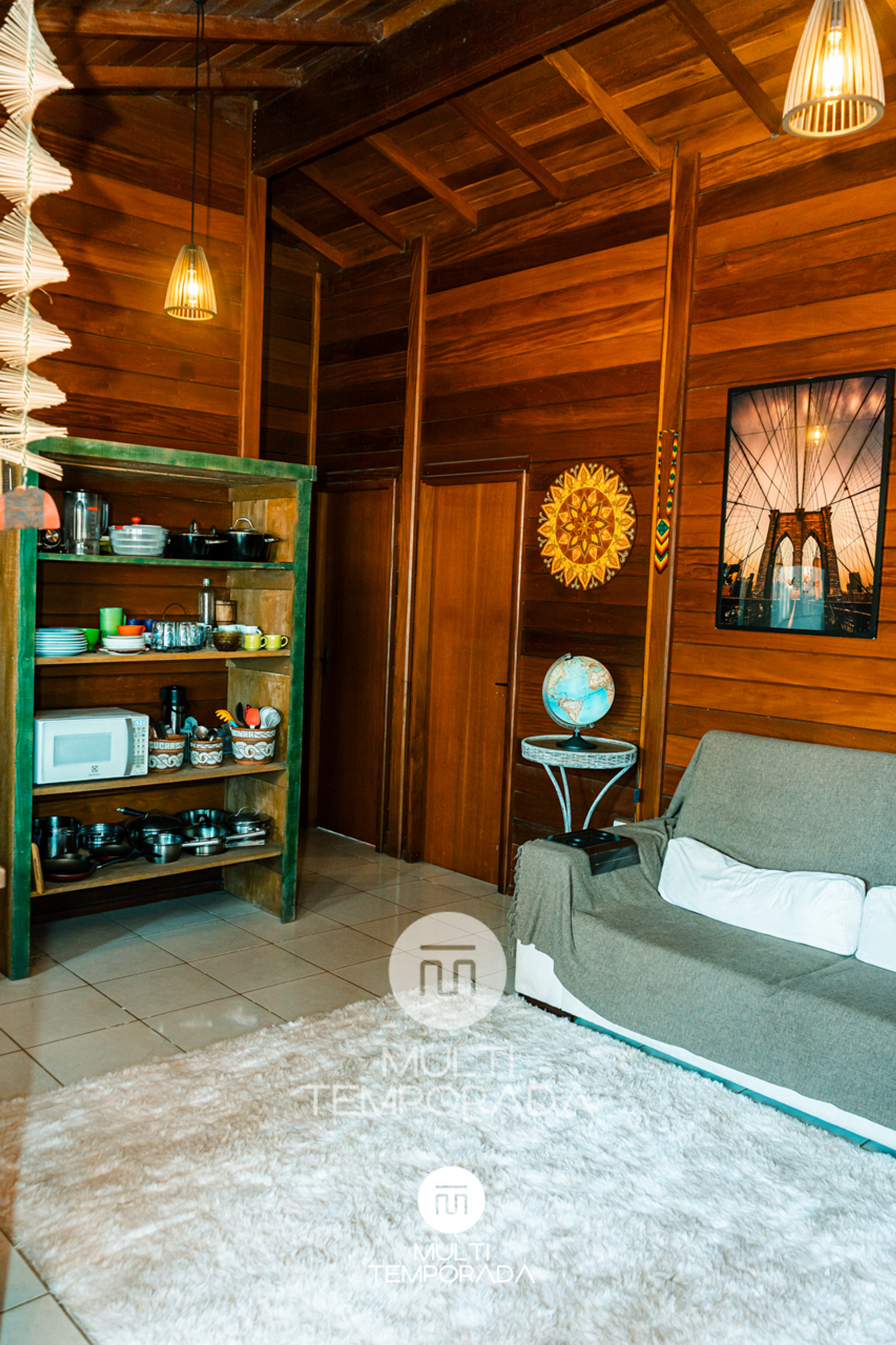 A sala recebe a luz natural que entra generosa pelas janelas e se espalha pelos espaços de madeira, criando um clima acolhedor de lar. É o lugar perfeito para reunir todos após um dia na praia, assistir a um filme na Smart TV de 50’’ com canais a cabo, conversar, jogar ou simplesmente relaxar sentindo o frescor do ar marinho.