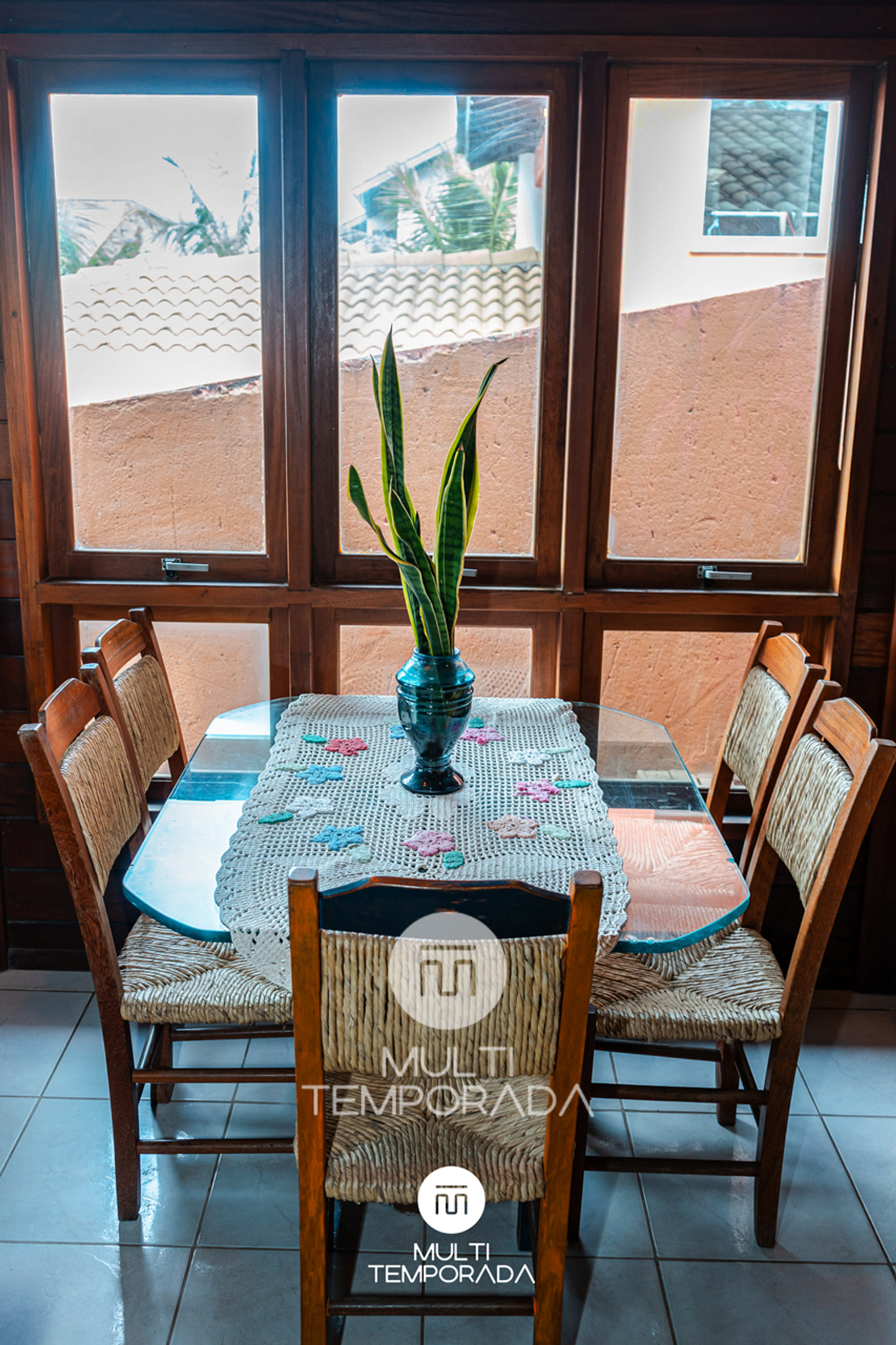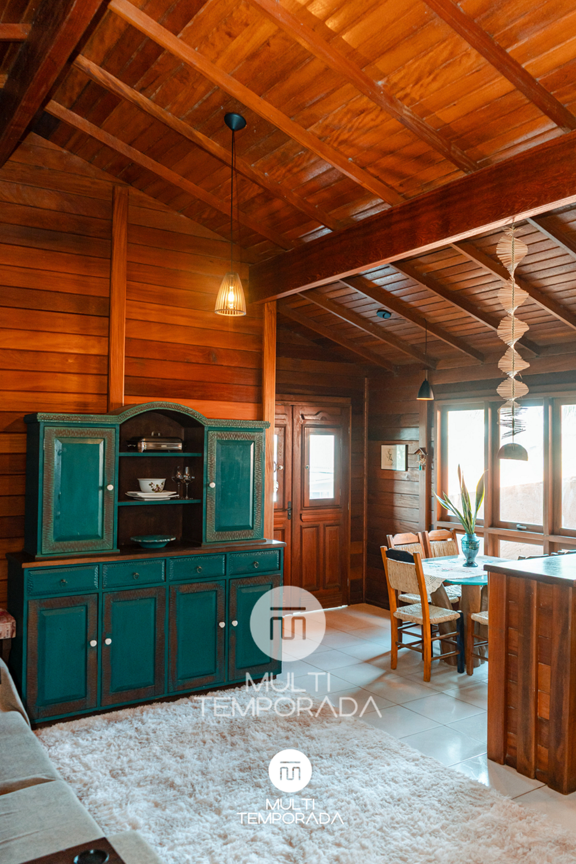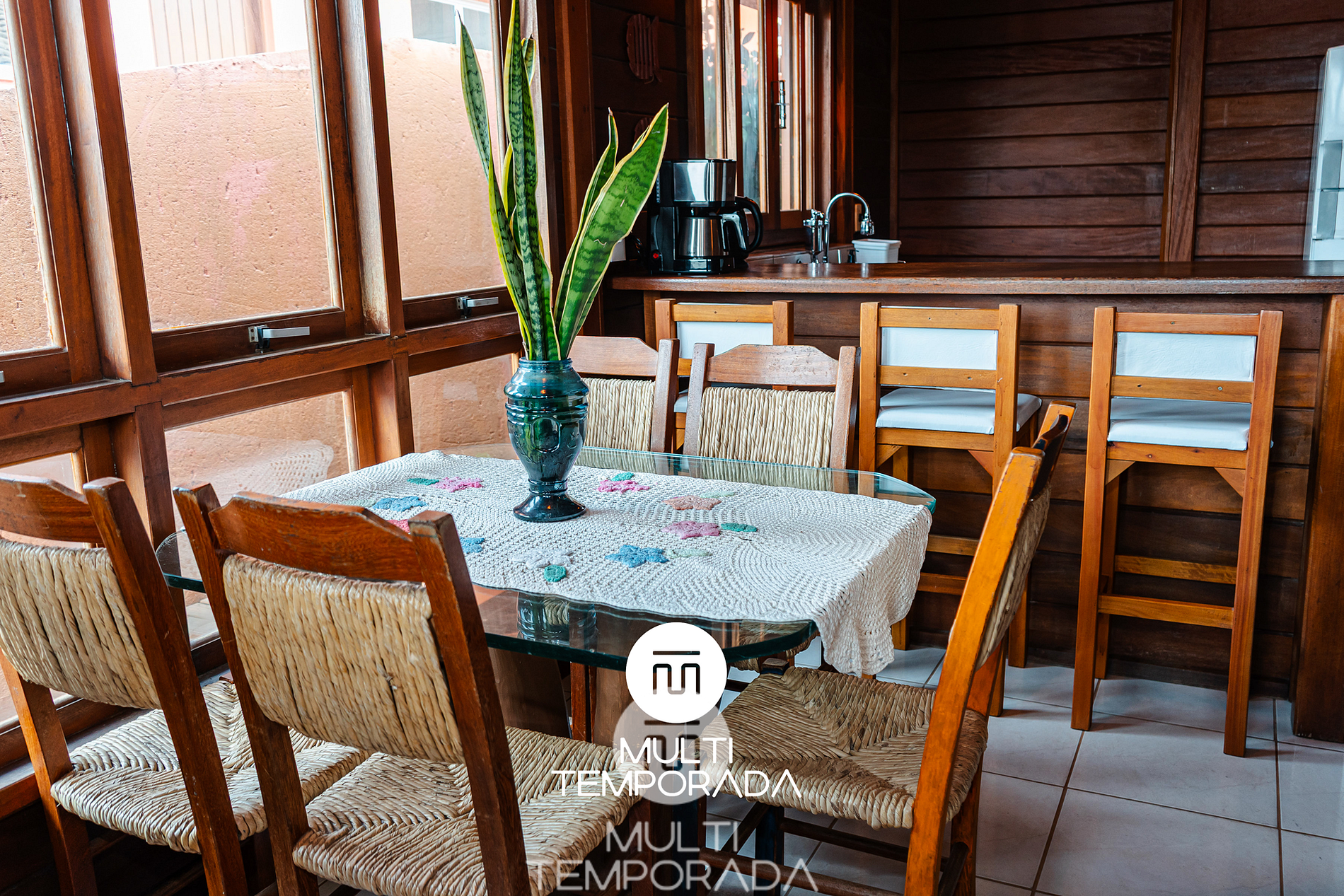 A sala recebe a luz natural que entra generosa pelas janelas e se espalha pelos espaços de madeira, criando um clima acolhedor de lar. É o lugar perfeito para reunir todos após um dia na praia, assistir a um filme na Smart TV de 50’’ com canais a cabo, conversar, jogar ou simplesmente relaxar sentindo o frescor do ar marinho.