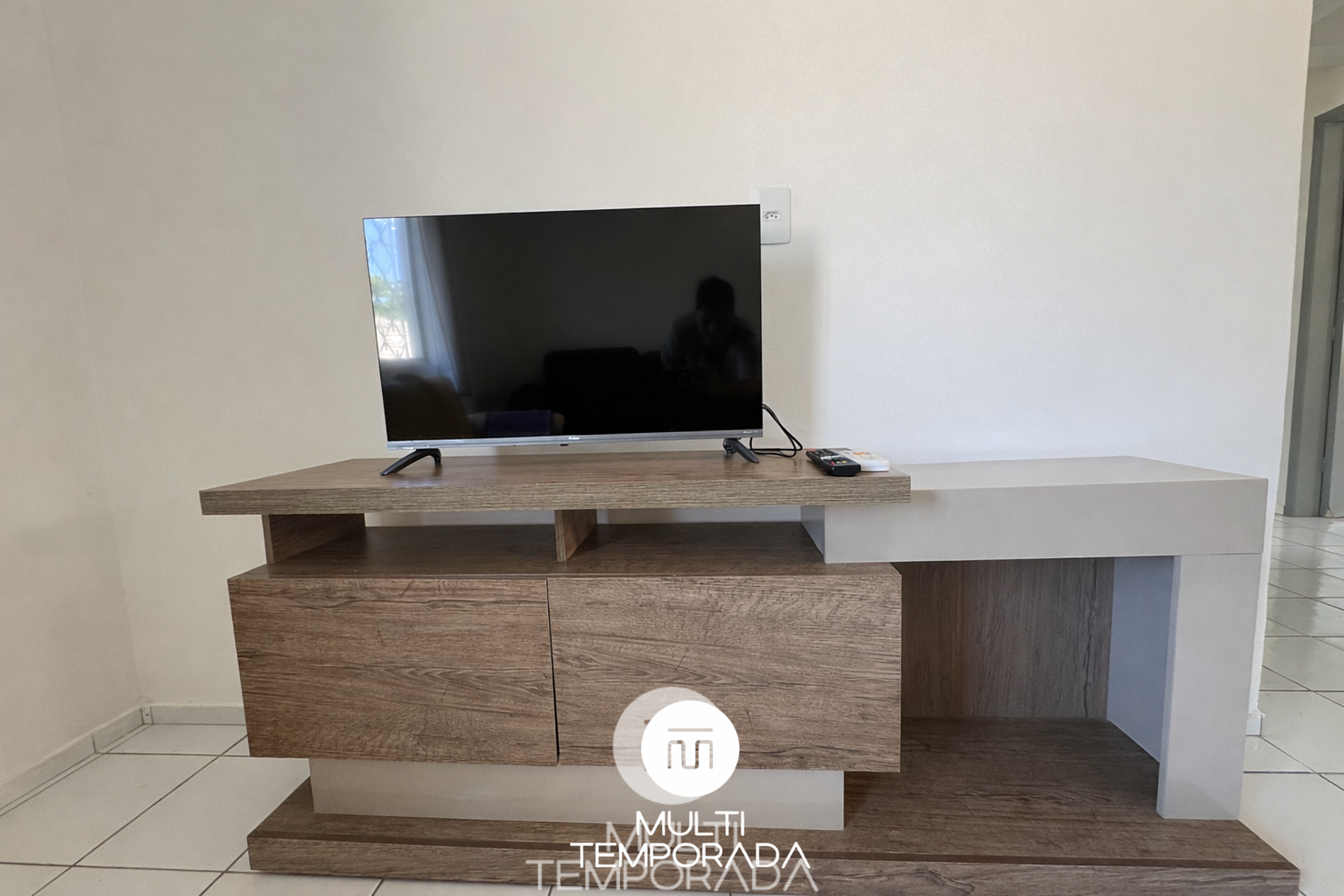 Os ambientes integrados criam um espaço fluido e convidativo, ideal para relaxar após um dia de praia. A sala conta com Smart TV de 32" e é perfeita para assistir a um filme ou simplesmente aproveitar momentos de descanso.