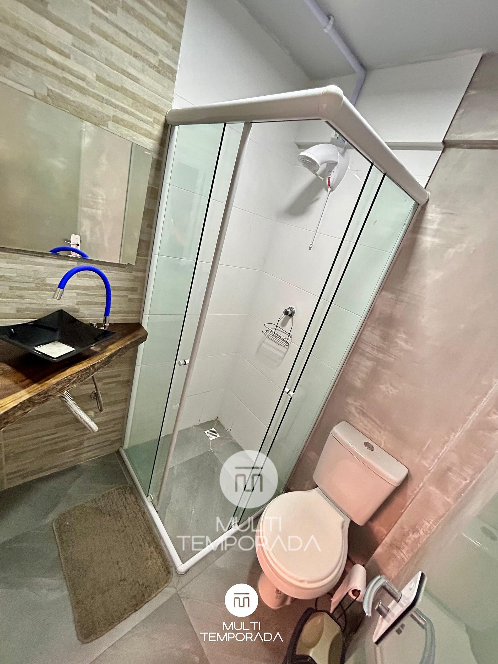Além da suíte, a pousada dispõe de banheiro compartilhado, destinado ao uso das áreas comuns, mantido com organização e conforto.