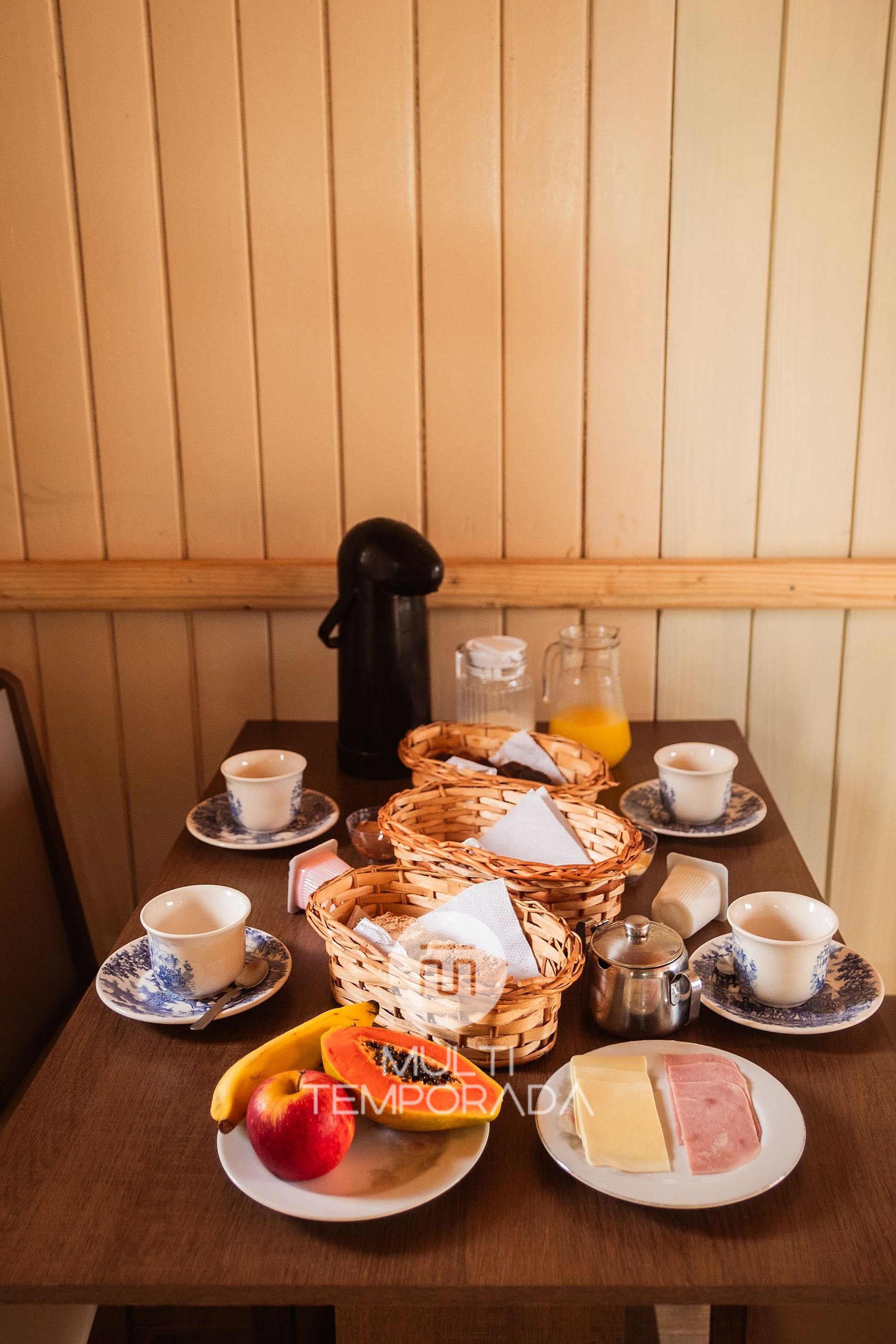 Café da manhã: Café, leite, suco de laranja, rosca de coalhada, pão de milho, pão de trigo, bolo, 2 tipos de fruta, queijo e presunto;