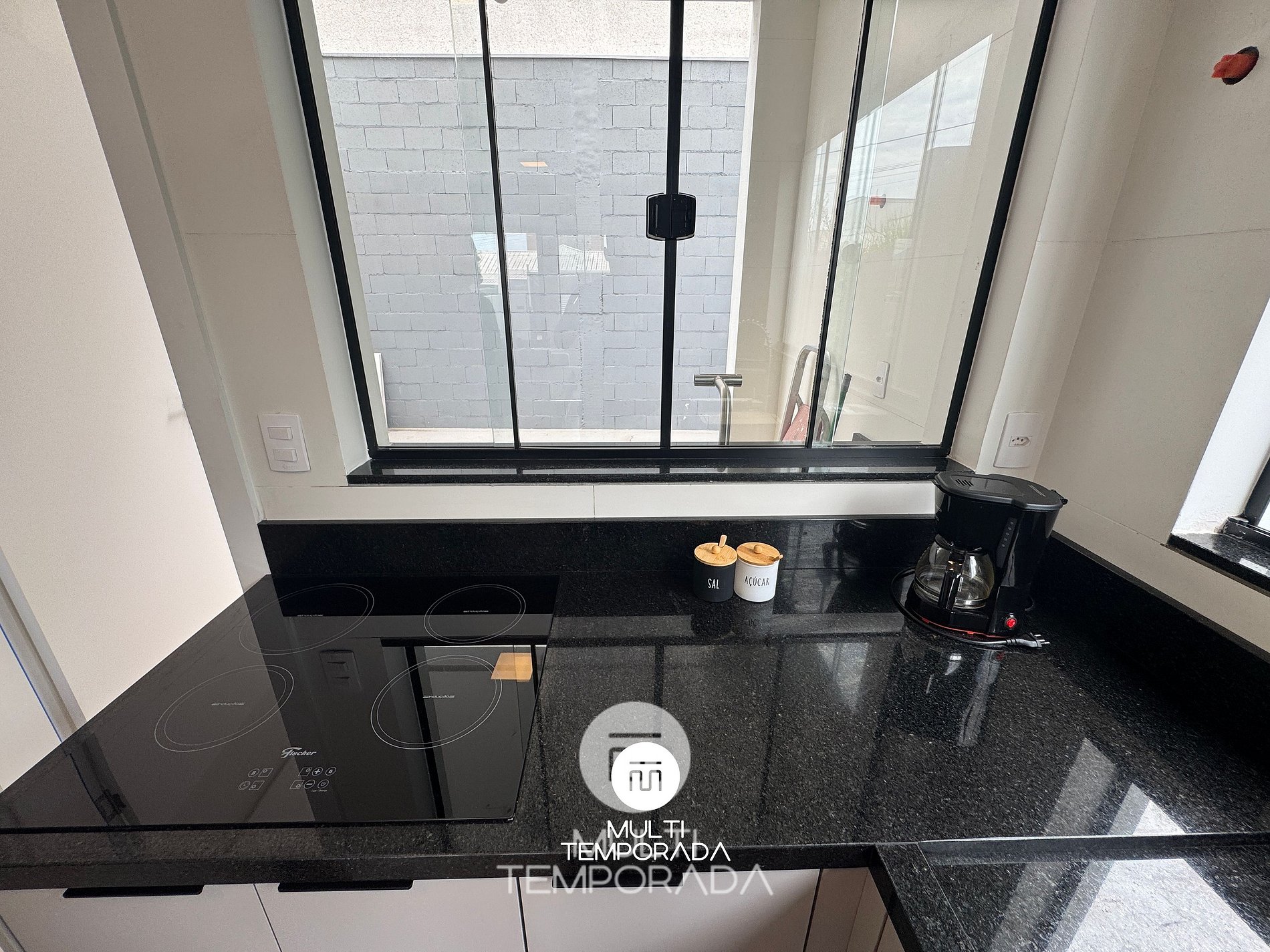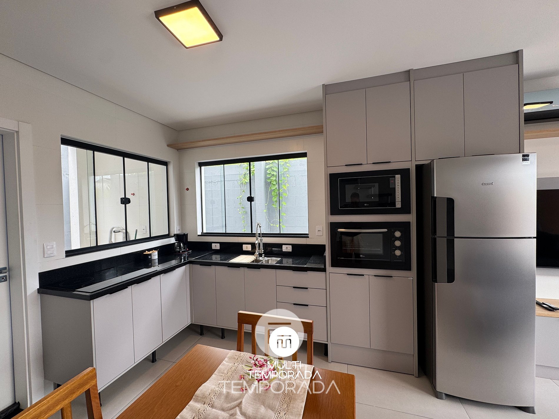 Fogão de indução, Geladeira, Forno, Micro-ondas, Louças e talheres.