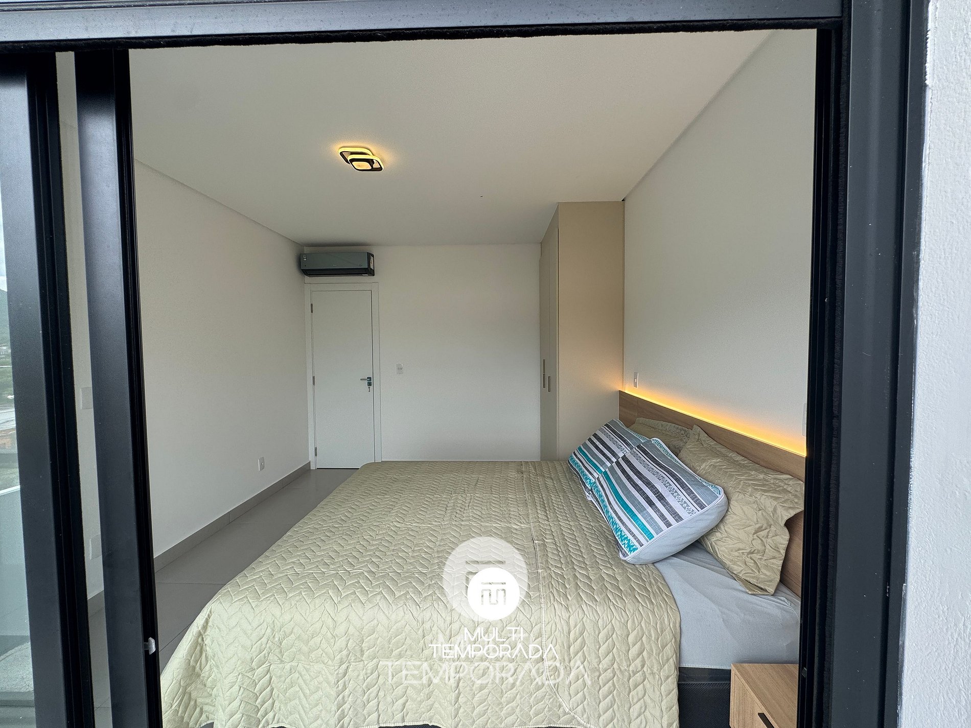 Quarto 1: cama de casal, ar-condicionado e varanda