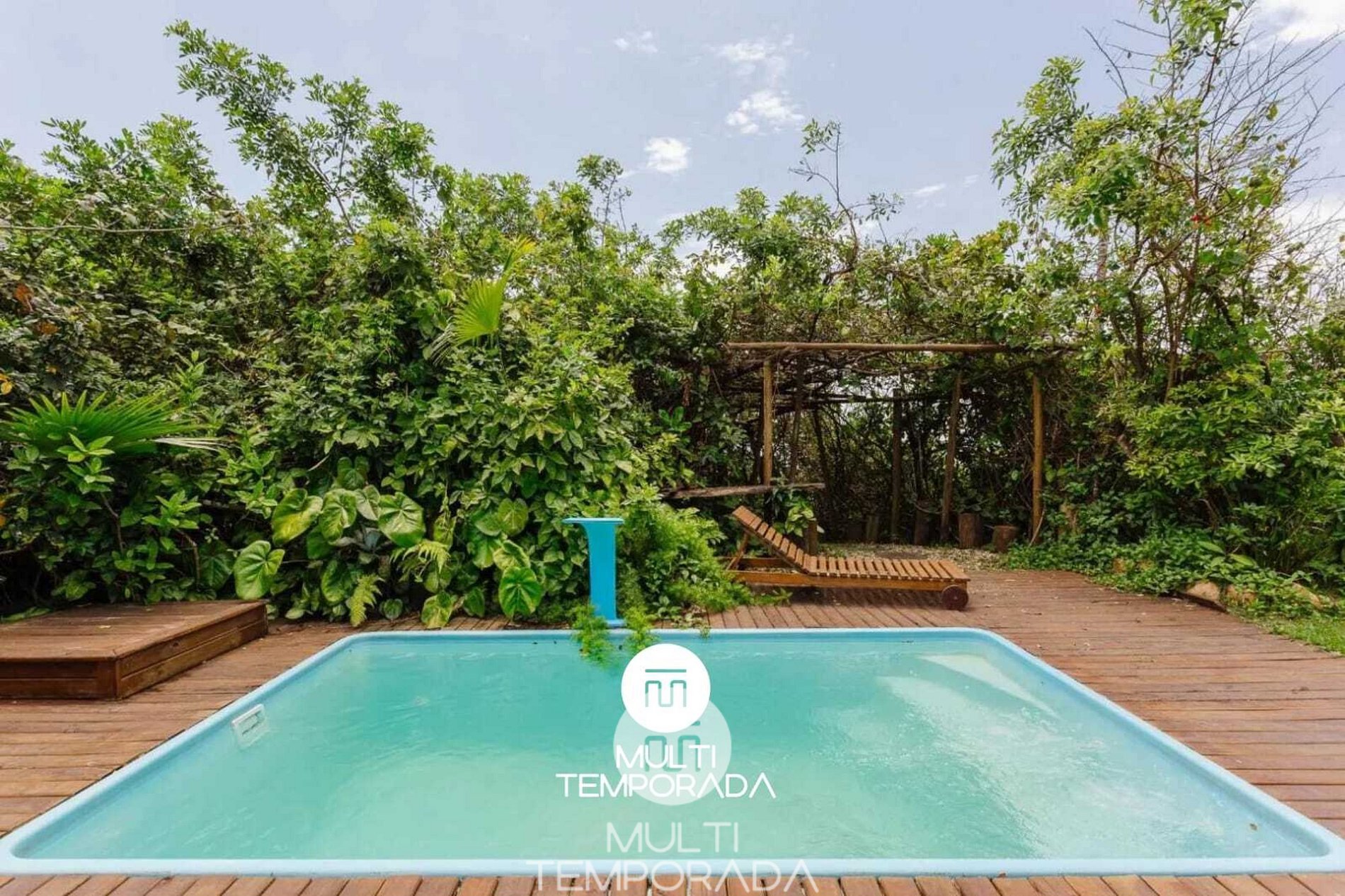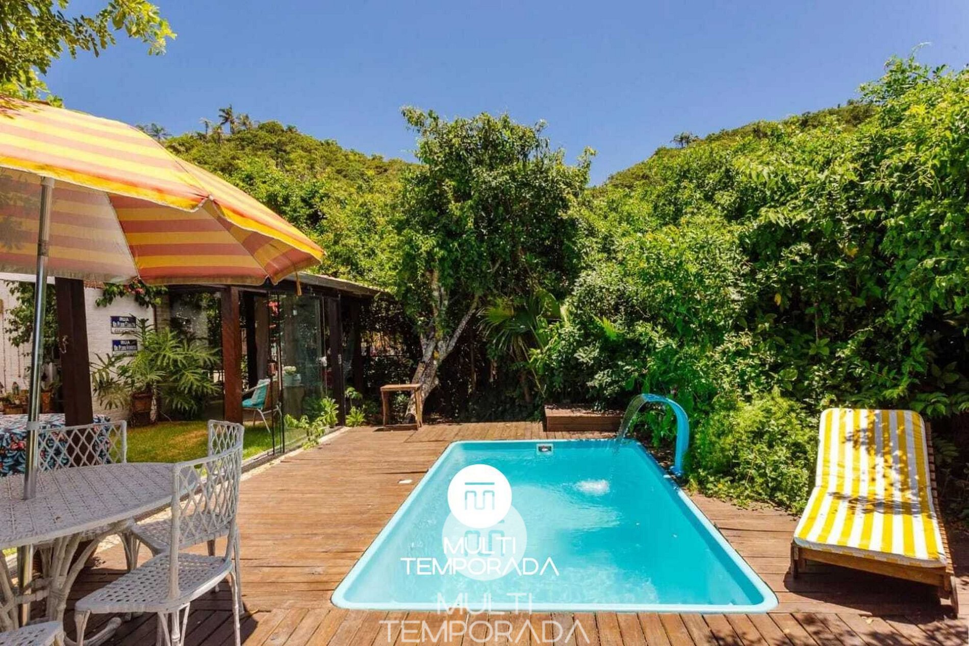 Área externa com jardim e piscina, perfeita para relaxar após a praia