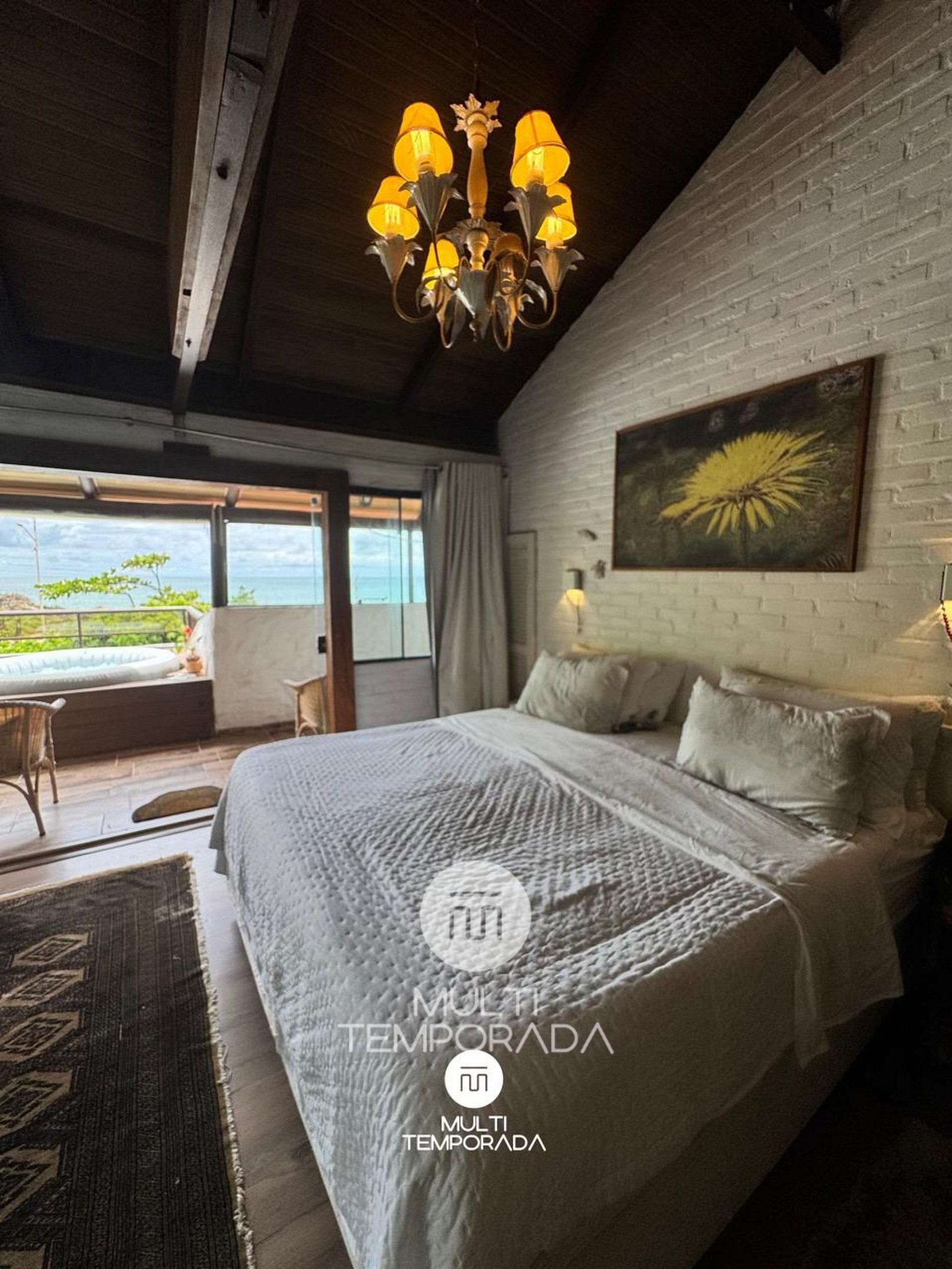 Cama de casal, Vista para o mar, Ofurô privativo e Varanda exclusiva, Ar-Condicionado e TV.